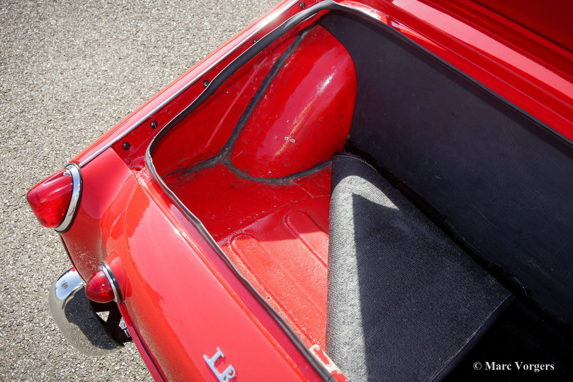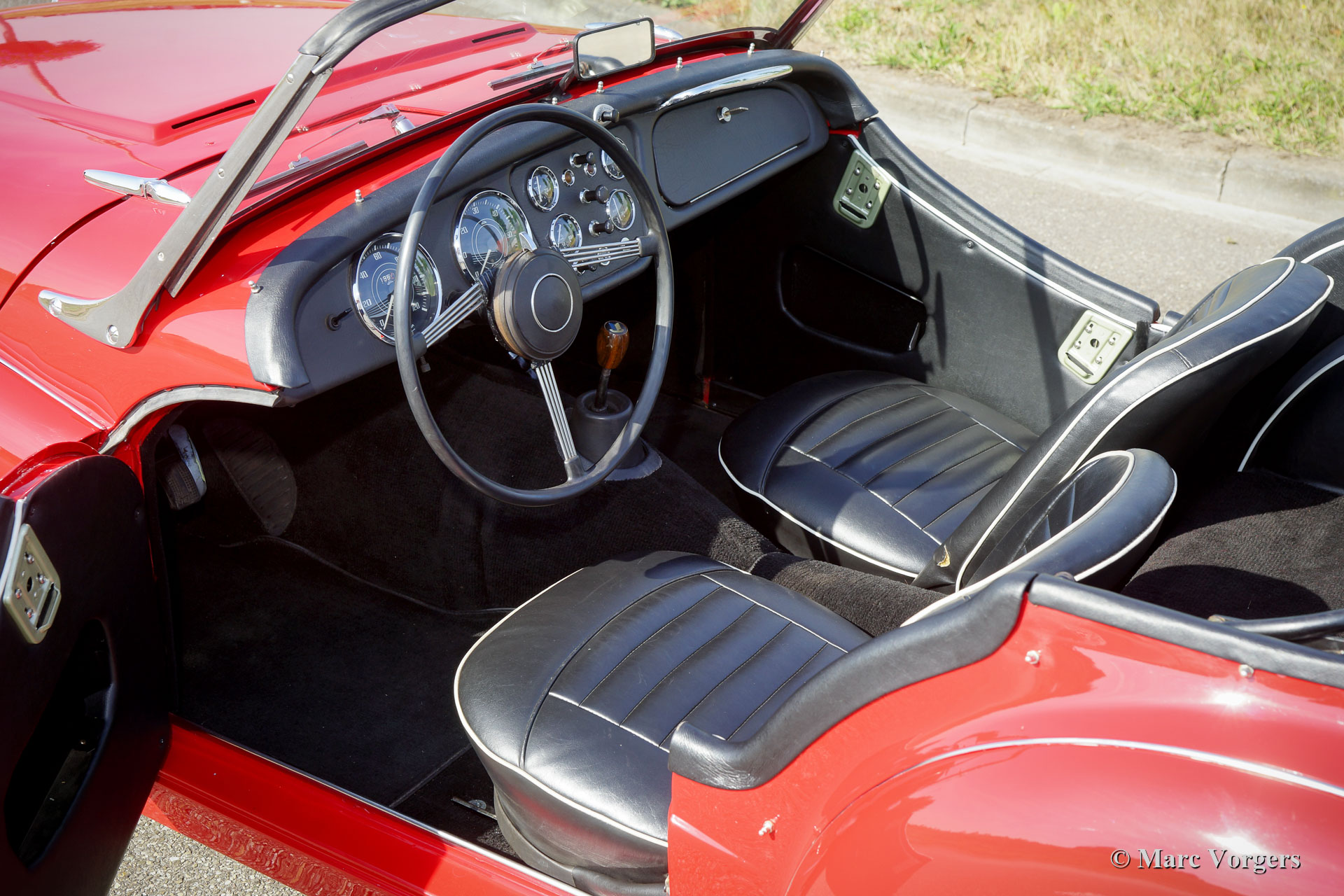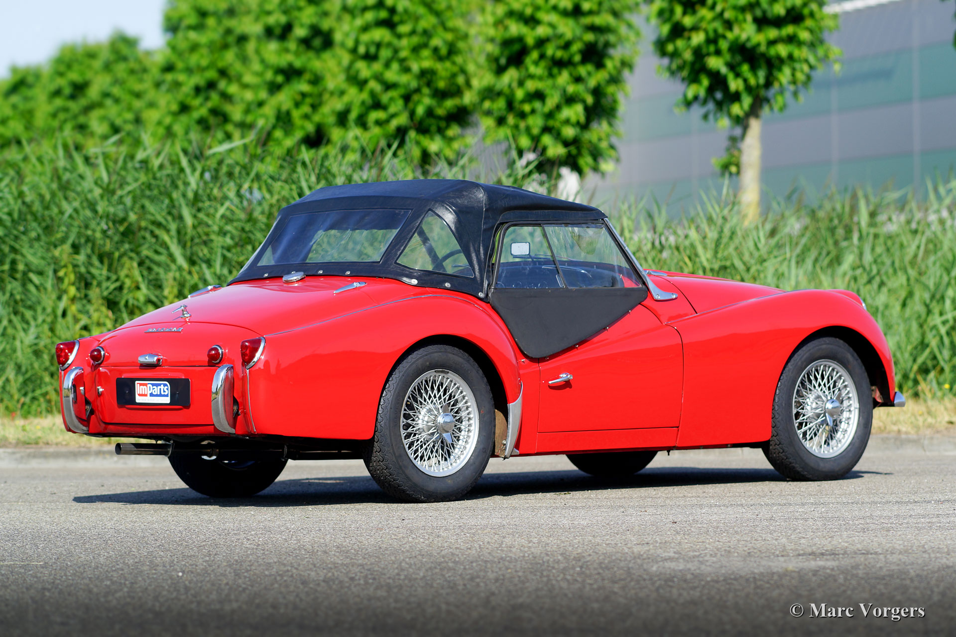 The Triumph TR 3 was uprated twice during the entire production period. In 1957 the car became a wider grille, door handles on the outside and slightly recessed headlamps and was named TR 3a then. In 1960-61 the cylinder capacity was enlarged to 2138 cc. giving a capacity of 104 bhp. and extra torque. Also the fully synchronized TR4 gearbox was incorporated. The car was then named TR 3b. The TR 3 is a pure two-person roadster, a classic generously giving you the fifties British sports car feeling, rough but honest. It comes with a simple soft-top for weather protection. Separate clip-on side screens can additionally be attached to the doors.