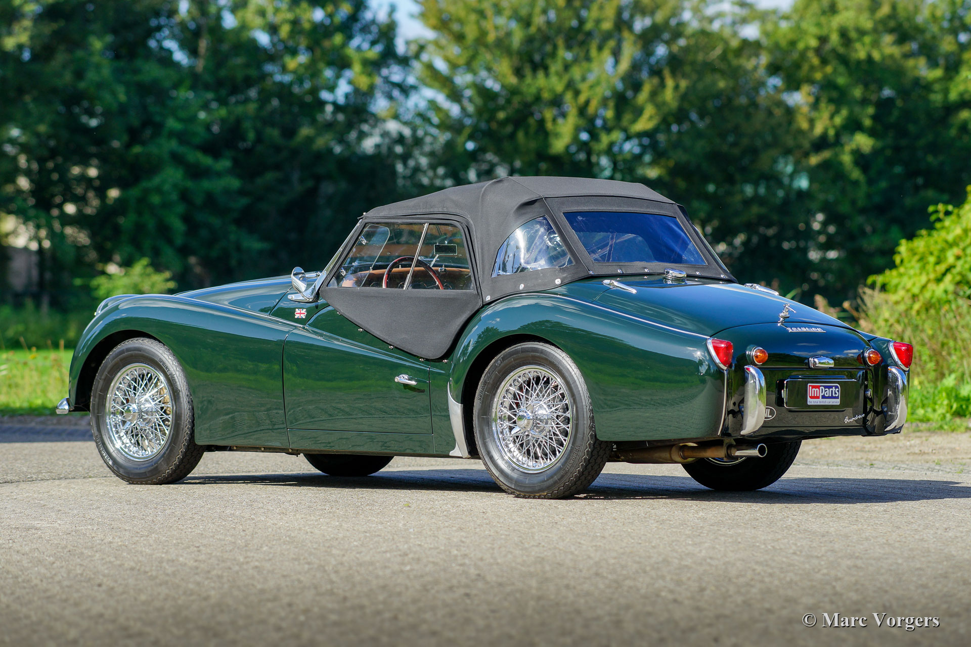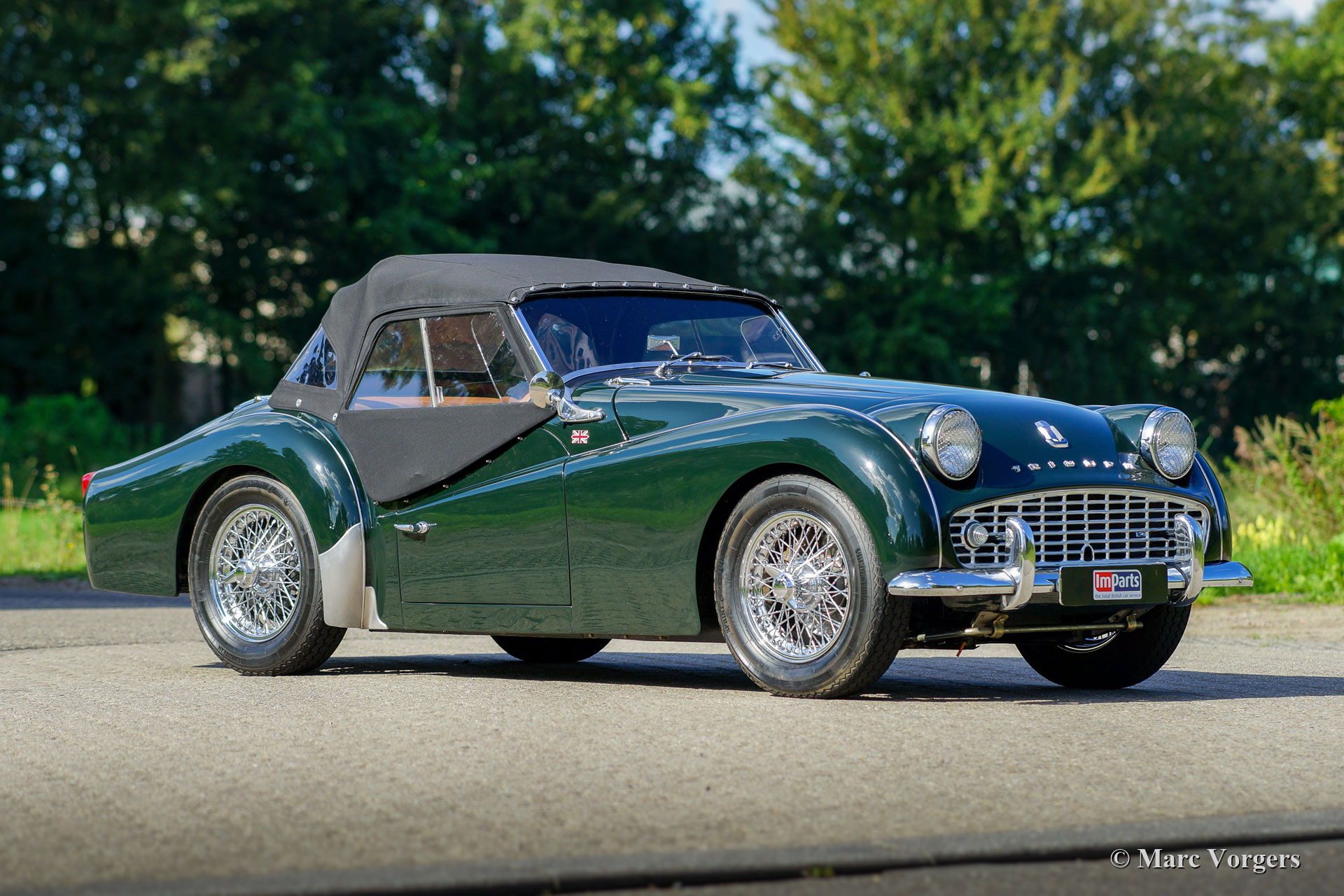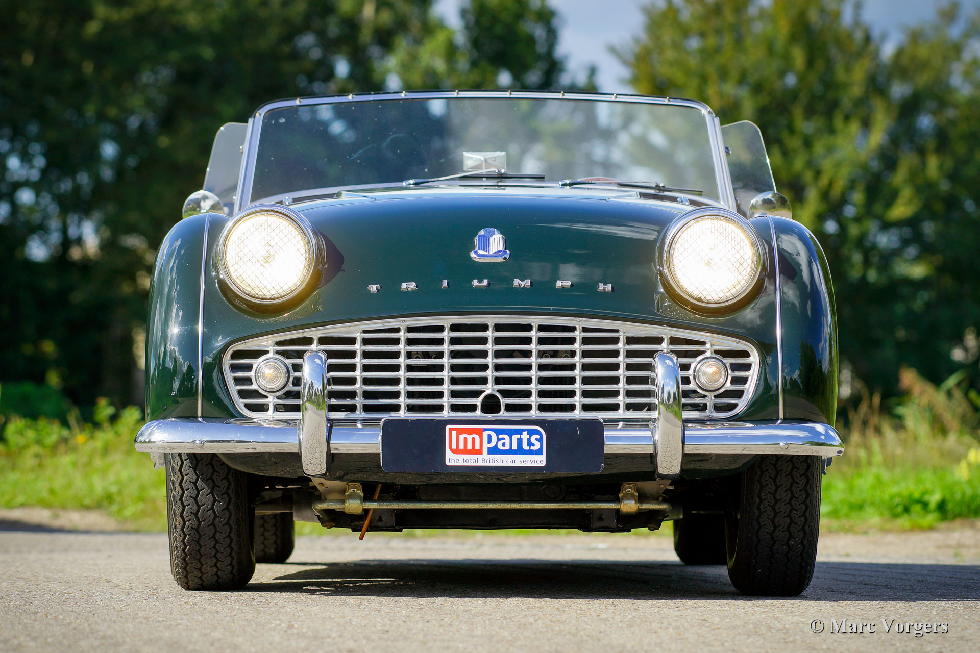 Triumph TR 3A, année 1959. Couleur Triumph racing green associée à un intérieur en cuir marron cognac, moquette marron cognac et tapis protecteurs en caoutchouc noir. Capote et cadres des fenêtres latéraux en mohair noir, couvercle de capot en cuir marron cognac. Cette magnifique Triumph TR 3A fut restaurée détaillée et parfaitement il y a quelques années; la voiture est en superbe état de top, concours! La qualité de la restauration transparaît dans les moindres détails. Cette automobile roule et se manie superbement et la note d'échappement est fantastique. Cette TR 3A montre tous les détails d'origine et la voiture est dotée de roues à rayons chromées et d'un overdrive. C'est un exemple hautement souhaitable offrant une expérience de conduite classique à toit ouvert maximum !