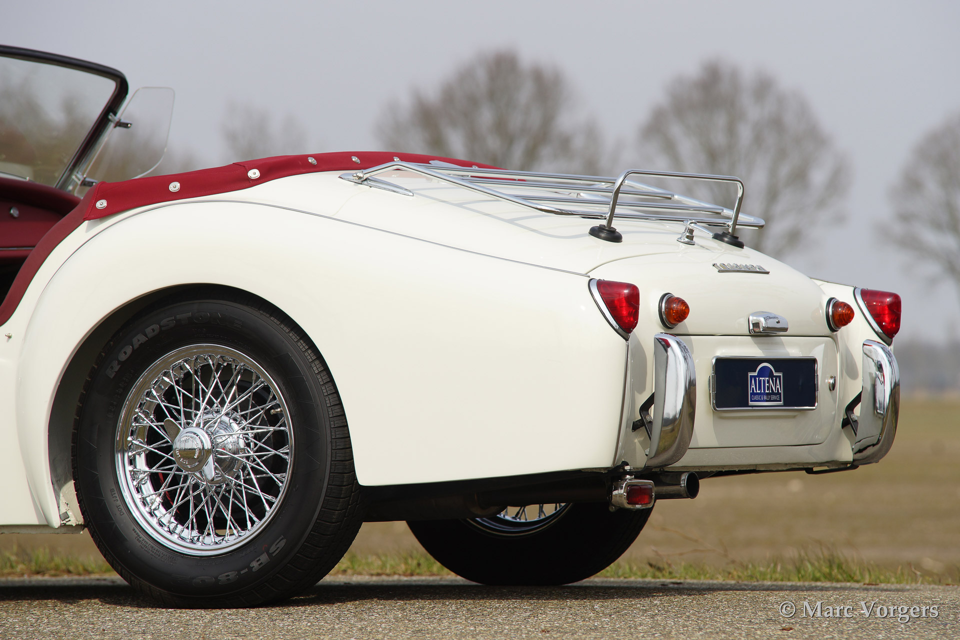 Triumph TR 3a, year 1960. Colour Old English White with a dark red leather interior. Red hood, hood cover, tonneau cover and side screens. This TR 3a features chrome wire wheels, a chrome luggage rack, badge bar, additional driving- and fog lamps at the front an an aluminium rocker cover.