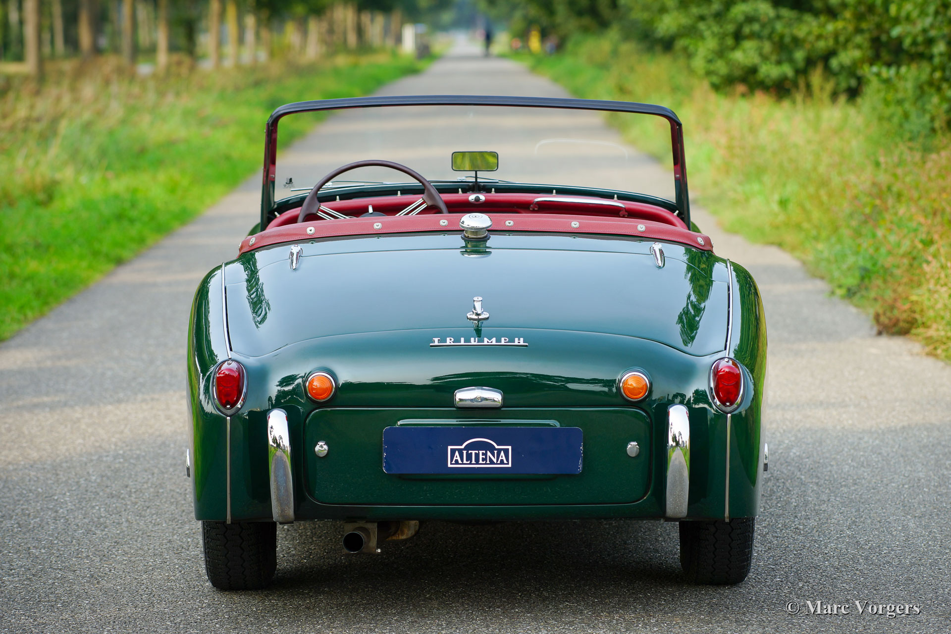 Triumph TR 3B, année 1962. Couleur Triumph Racing Green associée à un intérieur en cuir artificiel rouge et un tapis rouge. Capote, écrans latéraux et capot de protection en vinyle noir. Cette fantastique et rare Triumph TR 3B a été importée d'Indiana (USA) aux Pays-Bas en 1993. En 1995, la voiture était immatriculée sur la route. À la fin des années 1990, l’automobile a été restaurée en profondeur par un spécialiste de la marque. Un reportage photo complet de la restauration est présent. Depuis 1993, la voiture n'a connu que deux propriétaires. Le deuxième propriétaire chérit la voiture depuis 2014. La voiture fut entretenue ponctuellement au fil des ans, des factures sont présentes pour le confirmer. Cette rare Triumph TR 3B est en excellent état et la voiture roule parfaitement. La TR 3B est une Triumph rare. La voiture a été introduite peu de temps avant l'entrée sur le marché de la TR 4. Le TR 3B est équipé du moteur TR 4 le plus puissant ! La voiture est équipée de roues de fil peintes en argent chaussées de pneus Michelin XZX 165/15. Ceci est un exemple hautement souhaitable montrant une fantastique palette de couleurs classique!