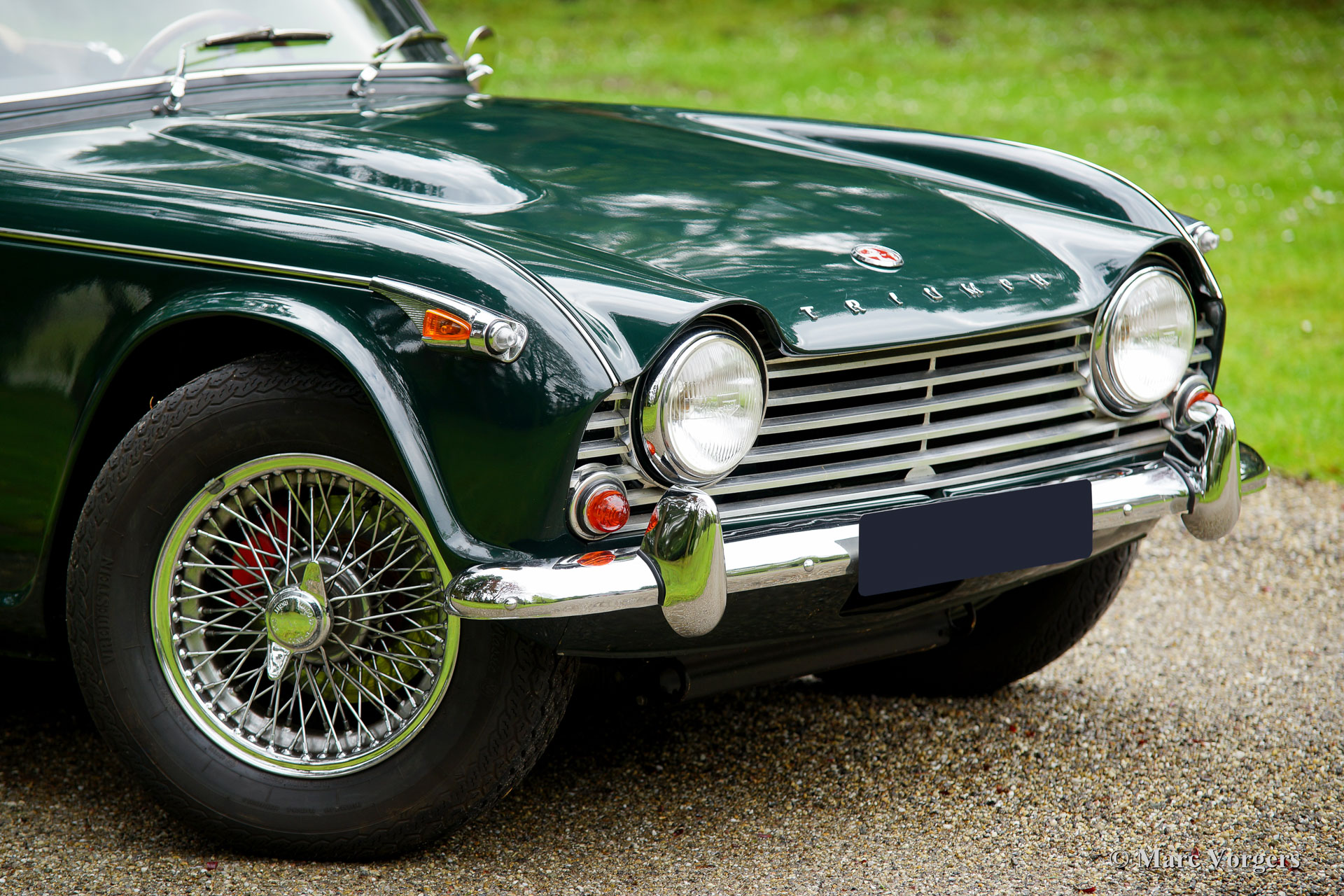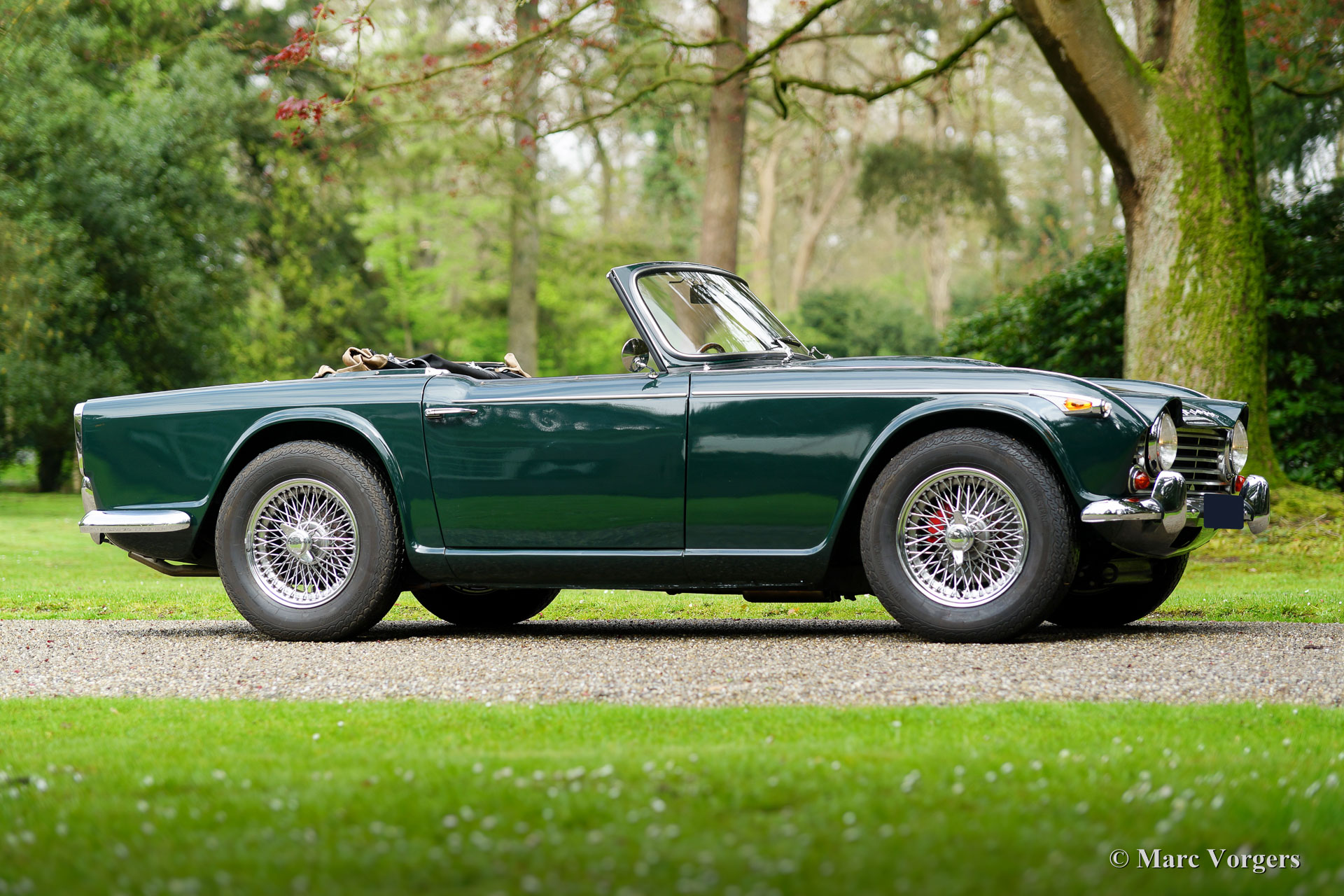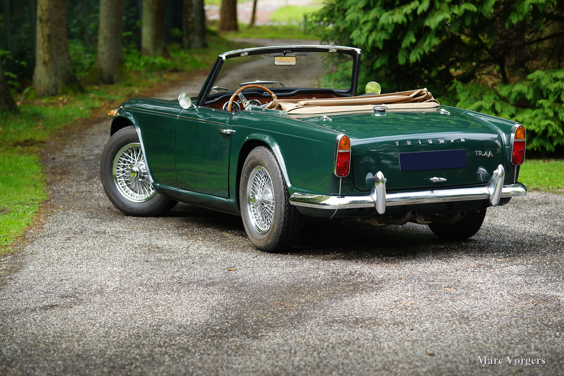 Triumph TR 4A, année 1966. Couleur British Racing Green avec un intérieur en cuir beige garni de passepoil vert. Tapis beige et un soft-top beige mohair. Ce magnifique Triumph TR 4A a fut restauré détaillée et ‘body-off’ il y a douze ans, des photos et beaucoup de factures donnant des idées sur la restauration sont présentes. Pendant la restauration, le moteur a été modifié pour fonctionner sur de l'essence sans plomb. Ce magnifique Triumph TR 4A est en excellent état avec de légers signes d'utilisation (petites égratignures de la peinture sur certains endroits). La voiture dispose de roues de fil chromées, d'un tableau de bord en noyer et d'un très joli volant MotoLita avec bordure en bois. Ce Triumph TR a été utilisé principalement pour les voyages de vacances, la voiture est prête pour les aventures ensoleillées avec son futur propriétaire !