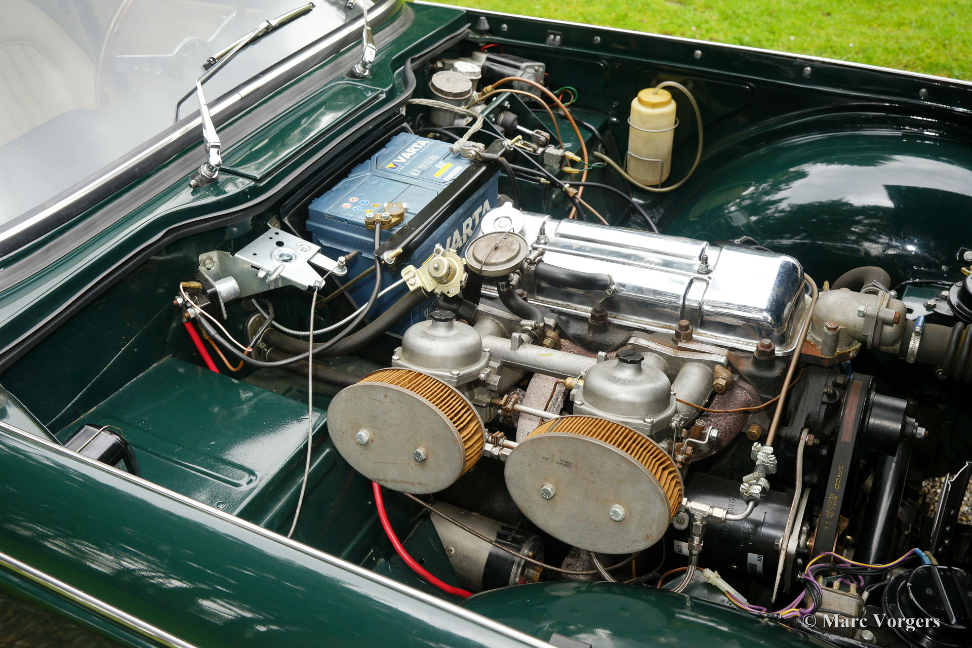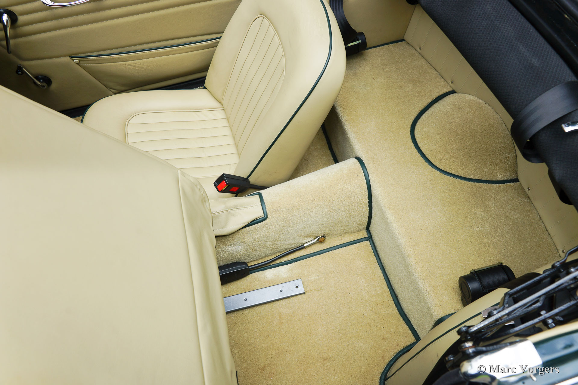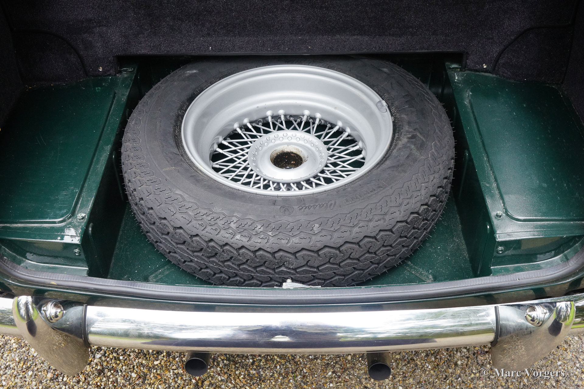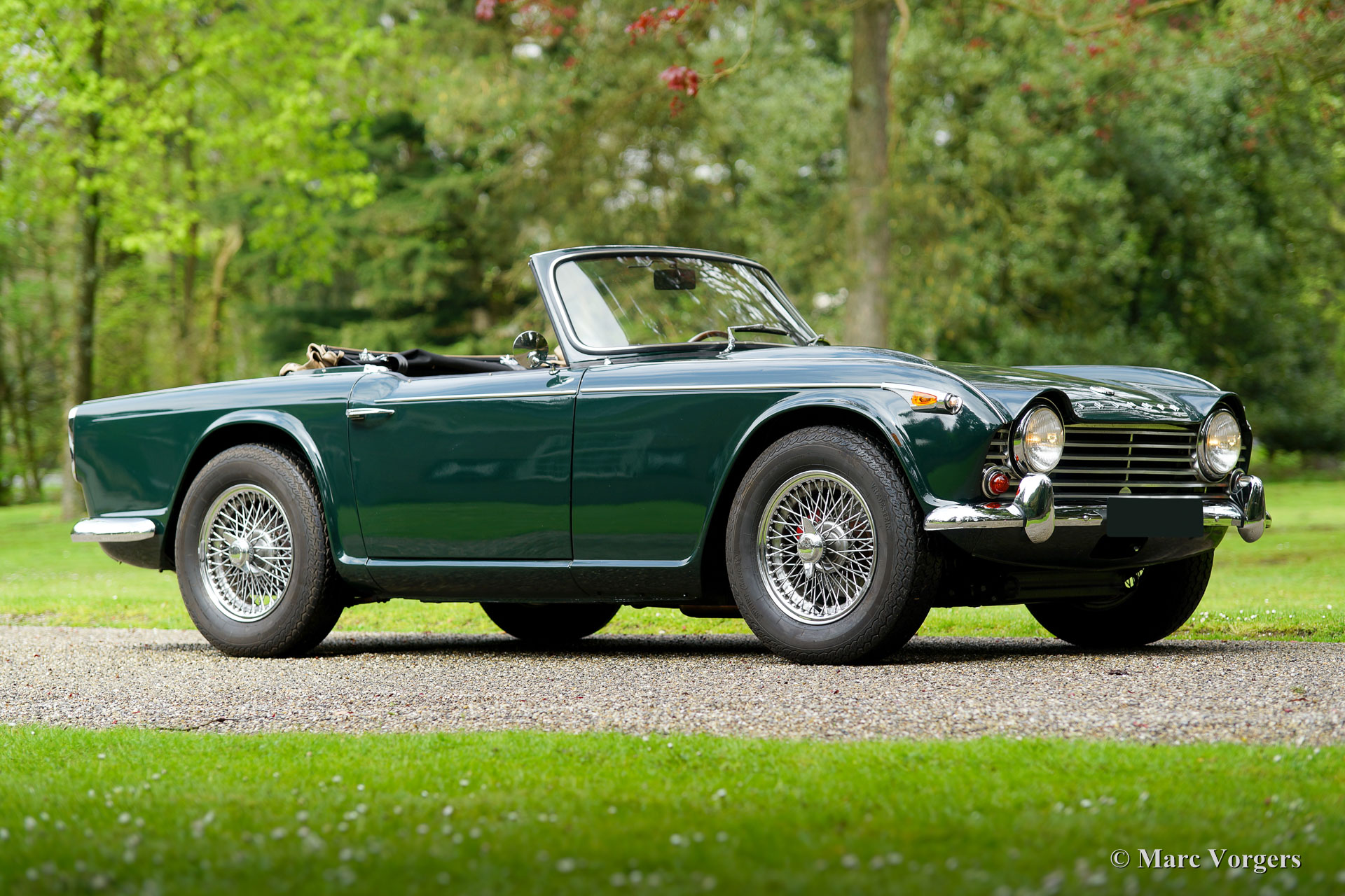 Triumph TR 4A, année 1966. Couleur British Racing Green avec un intérieur en cuir beige garni de passepoil vert. Tapis beige et un soft-top beige mohair. Ce magnifique Triumph TR 4A a fut restauré détaillée et ‘body-off’ il y a douze ans, des photos et beaucoup de factures donnant des idées sur la restauration sont présentes. Pendant la restauration, le moteur a été modifié pour fonctionner sur de l'essence sans plomb. Ce magnifique Triumph TR 4A est en excellent état avec de légers signes d'utilisation (petites égratignures de la peinture sur certains endroits). La voiture dispose de roues de fil chromées, d'un tableau de bord en noyer et d'un très joli volant MotoLita avec bordure en bois. Ce Triumph TR a été utilisé principalement pour les voyages de vacances, la voiture est prête pour les aventures ensoleillées avec son futur propriétaire !