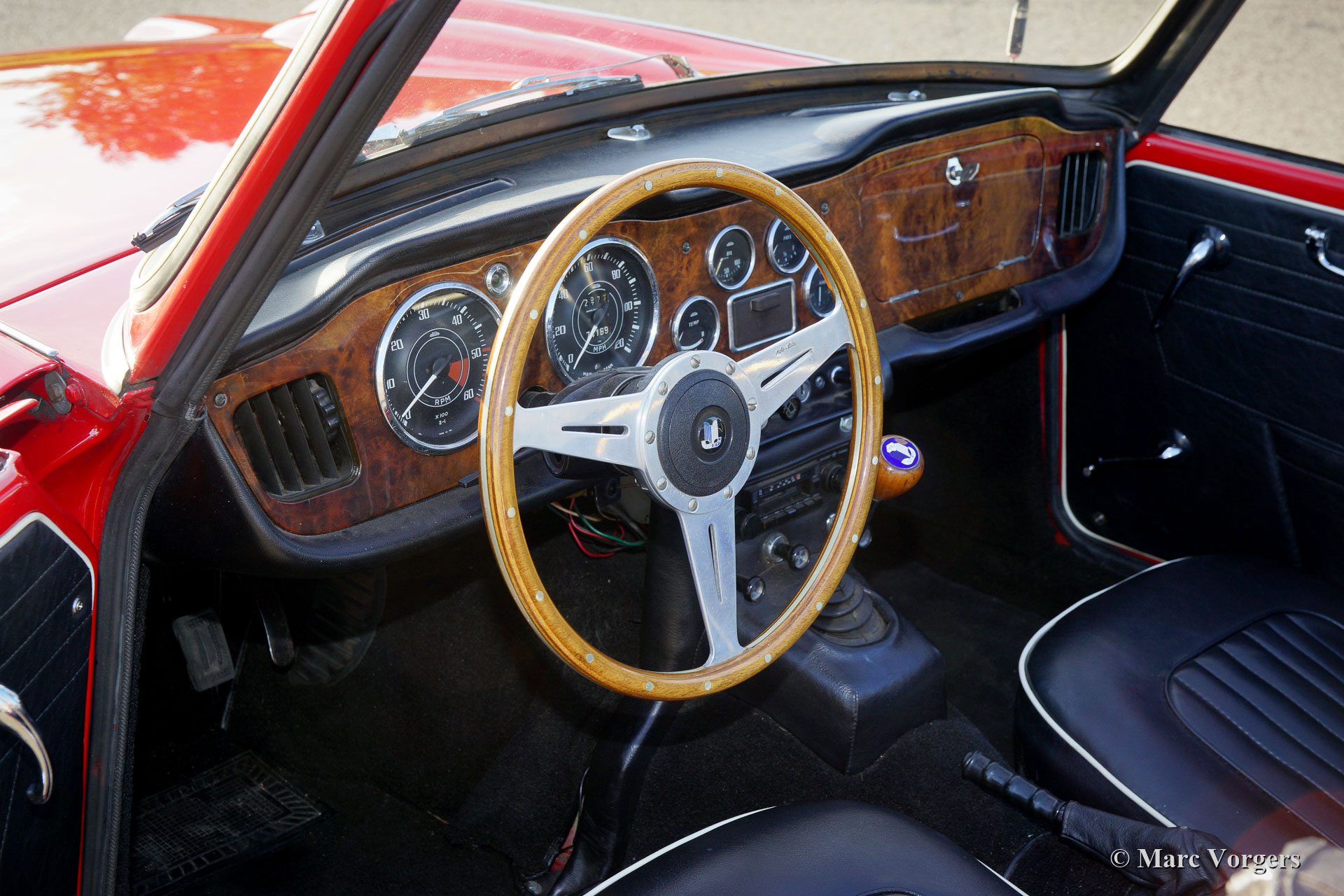 Triumph TR 4A IRS, année 1966. Couleur rouge combinée à un intérieur en cuir noir garni de passepoil blanc et de moquette noire. Capote en vinyle noir et couvercle de capot noir. Cette magnifique Triumph TR 4A IRS est dans un très bon à excellent état ! La voiture a été restaurée dans le passé et tout est magnifique. La compartiment de moteur est magnifiquement propre et montre tous les détails d'origine. L'intérieur présente la sellerie noire recherchée avec passepoil blanc et le tableau de bord en noyer ! La Triumph TR 4 a été conçue par le célèbre designer italien Michelotti qui était à l'origine de toutes les jolies voitures Triumph des années 1960. Dans la Triumph TR 4, il a combiné le monde de la voiture de sport britannique masculine avec la qualité d'un style italien séduisant et raffiné. La Triumph TR 4A IRS est l'incarnation haut de gamme de la TR 4. La voiture présente toutes les améliorations apportées au fil des ans, le moteur le plus puissant et une suspension arrière indépendante au lieu d'un essieu rigide. Ce TR 4A IRS est un exemple très désirable montrant de merveilleux détails originaux. L'automobile est équipée de roues à rayons chromées chaussées de pneus Vredestein Sprint Classic, d'un volant sport MotoLita avec jante en bois, d'un porte-bagages chromé, des servo freins, d'un allumage électronique et d'un double système d'échappement sport en acier inoxydable.