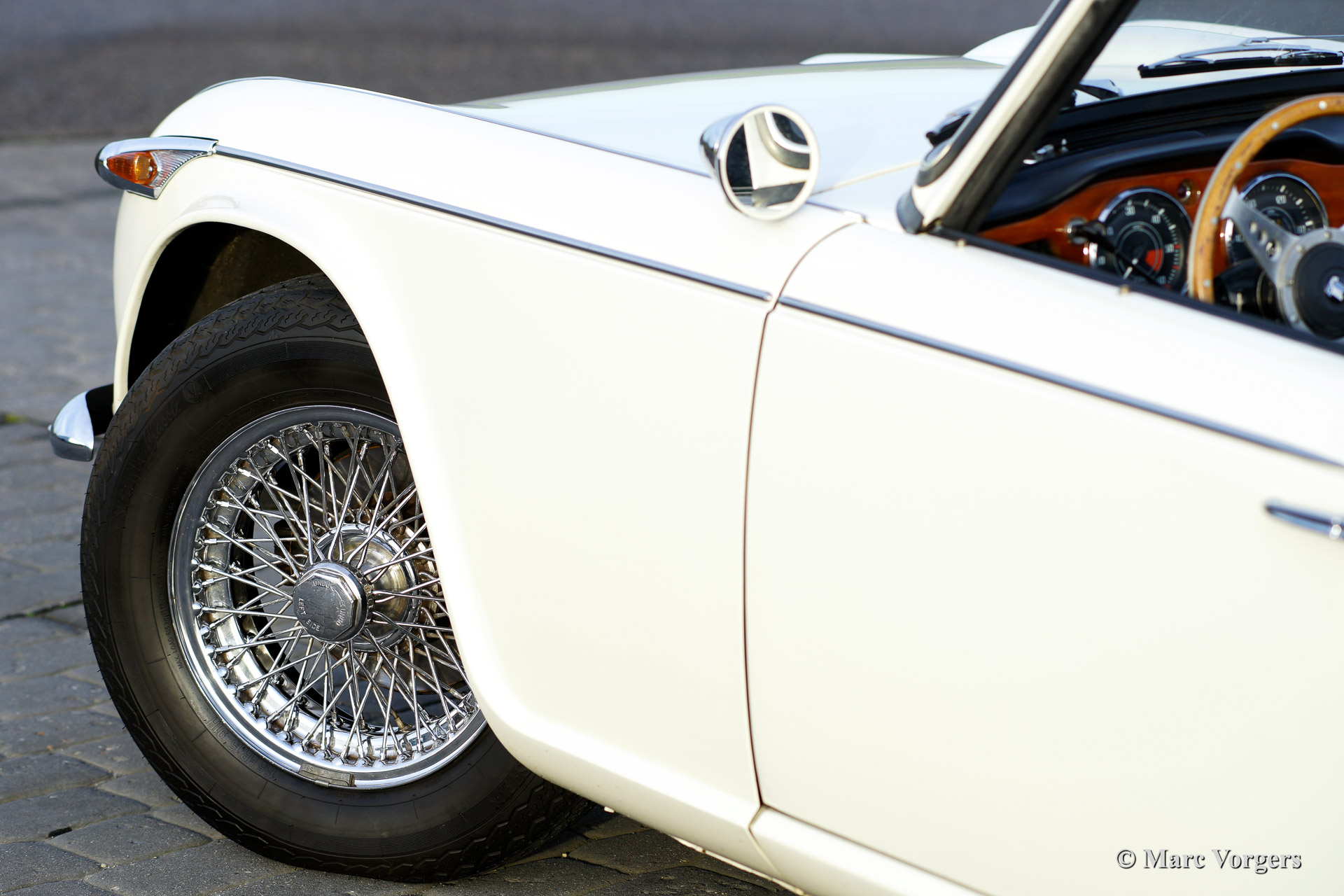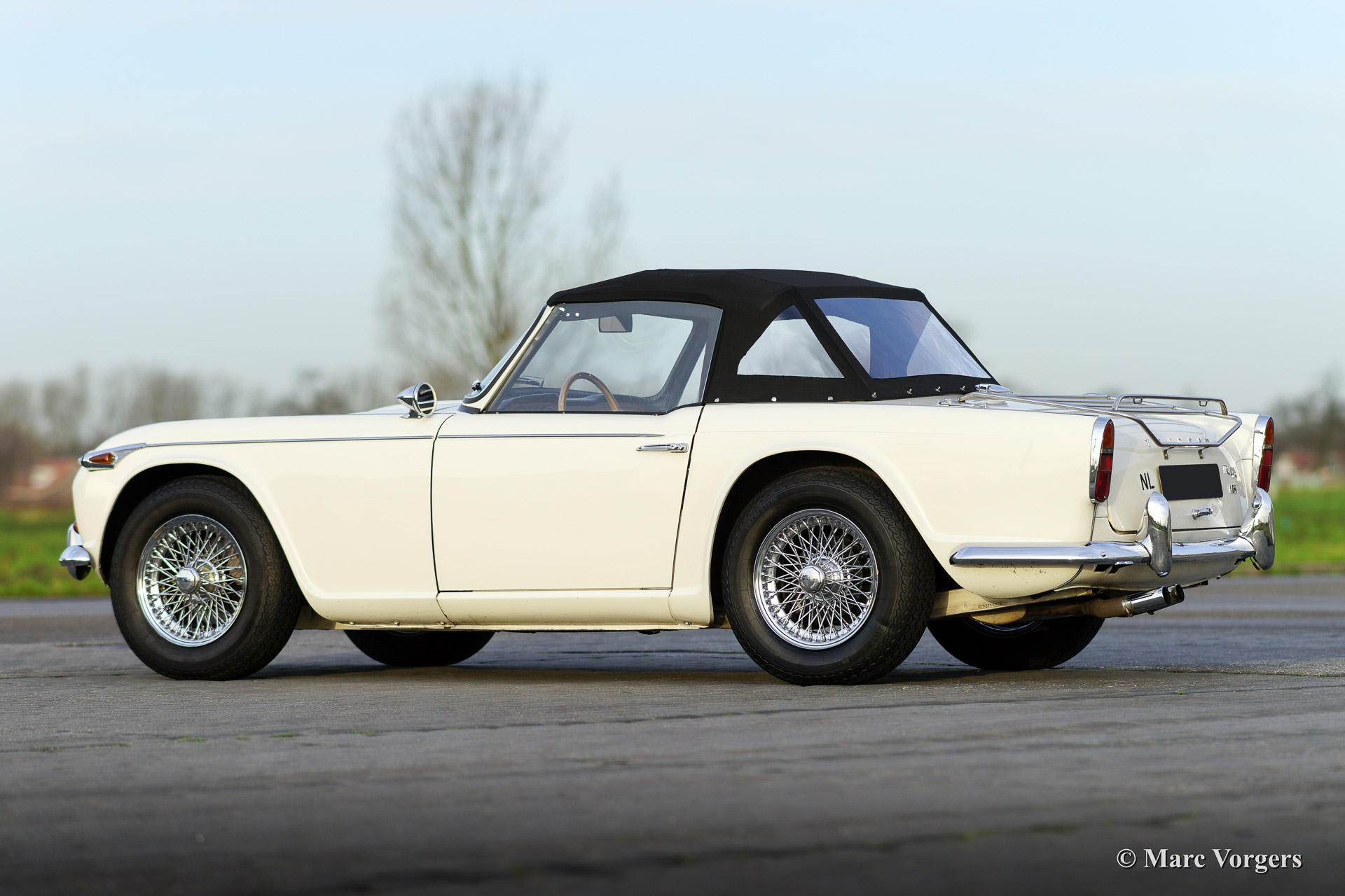 Triumph TR 4a IRS, year 1967. Colour white with a black leather interior trimmed with white piping. Black carpet and black soft top. This fine Triumph TR 4a IRS (Independent Rear Suspension) was imported from France in the year 1991. Then the car was extensively 'body off' restored. One owner since 1991 and the car has driven approximately 25.000 km since the restoration. This TR 4a IRS is in very good condition! The engine was slightly tuned and fitted with two twin choke Weber carburettors. Further more the car sports a new mohair soft top, overdrive, chrome wire wheels, chrome luggage rack, a MotoLita steering wheel with wood rim, a period radio and power brakes. A delightful classic!