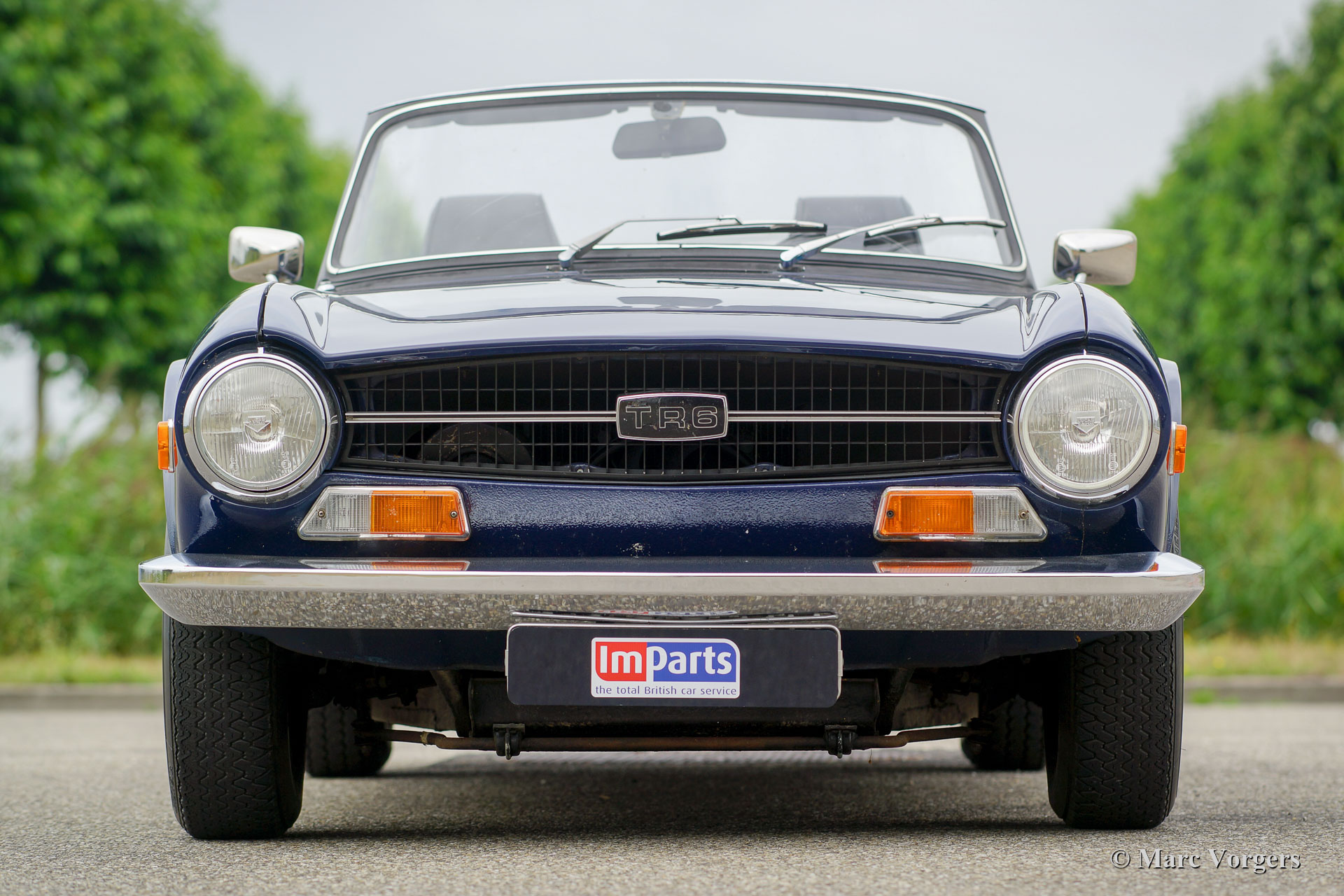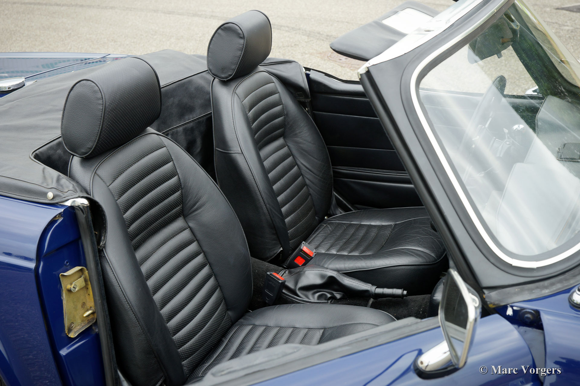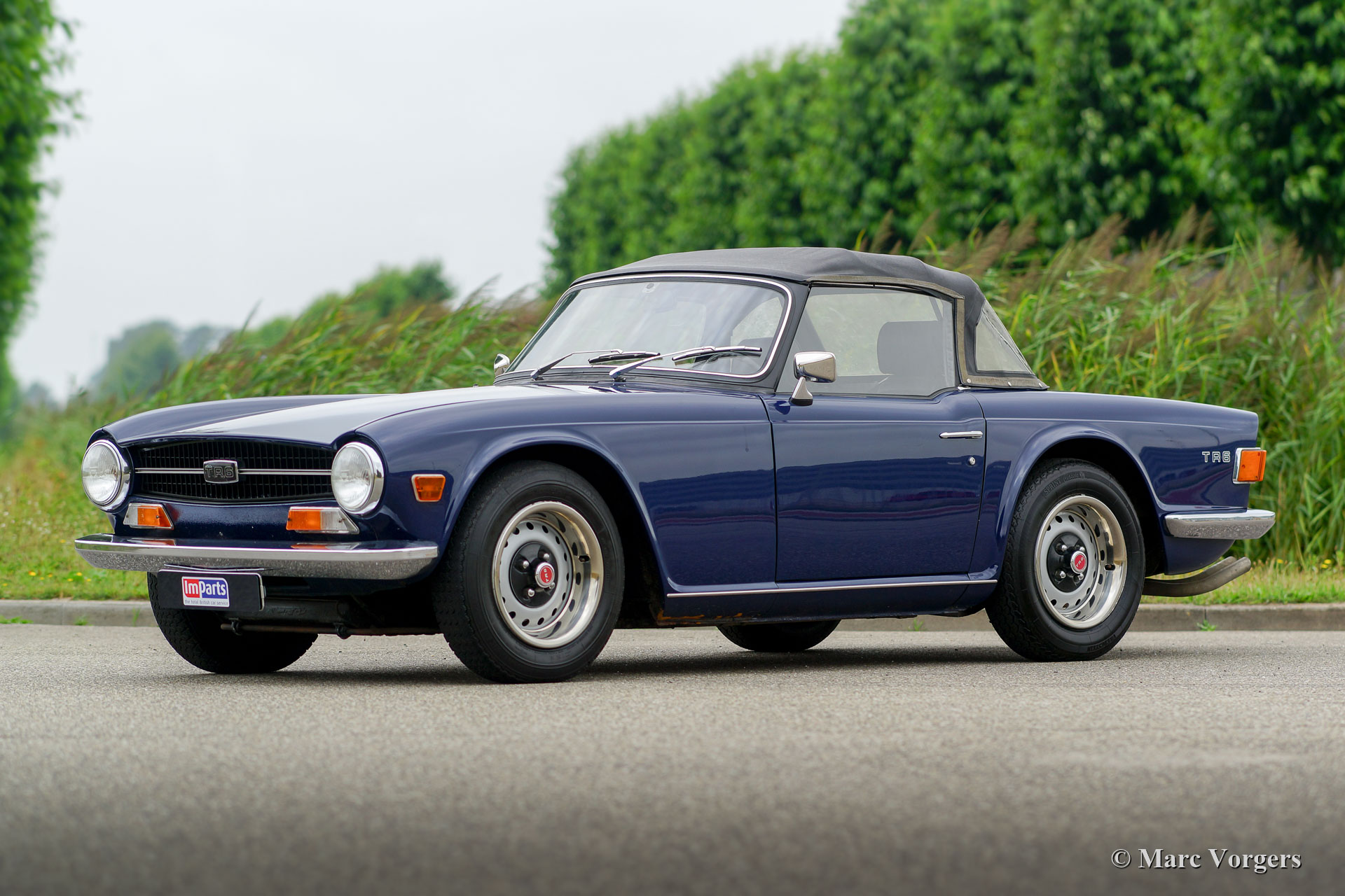 Triumph TR6 PI, année 1972. Couleur bleu foncé avec un intérieur en cuir noir et tapis noir. Capot et couvercle de la hotte en vinyle noir. Ce magnifique TR6 PI est un modèle CP avec le très souhaitable moteur de 150 ch. La voiture a été livrée en Belgique comme voiture CKD à assembler, la voiture fut expédiée aux Pays-Bas en juin 1972. Ce TR6 PI fut chéri par le dernier propriétaire depuis 2005, l’automobile est en très bon état de conduite et la voiture pilote et sonne parfaitement ! La voiture est équipée d'un système PI modifié (pompe à essence Bosch au lieu du type Lucas), des sièges confort spécial avec dossiers supérieurs et appuie-têtes, deux rétroviseurs chromés, allumage électronique et un ventilateur électrique.