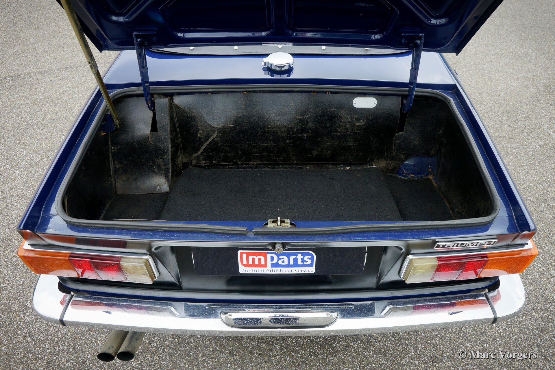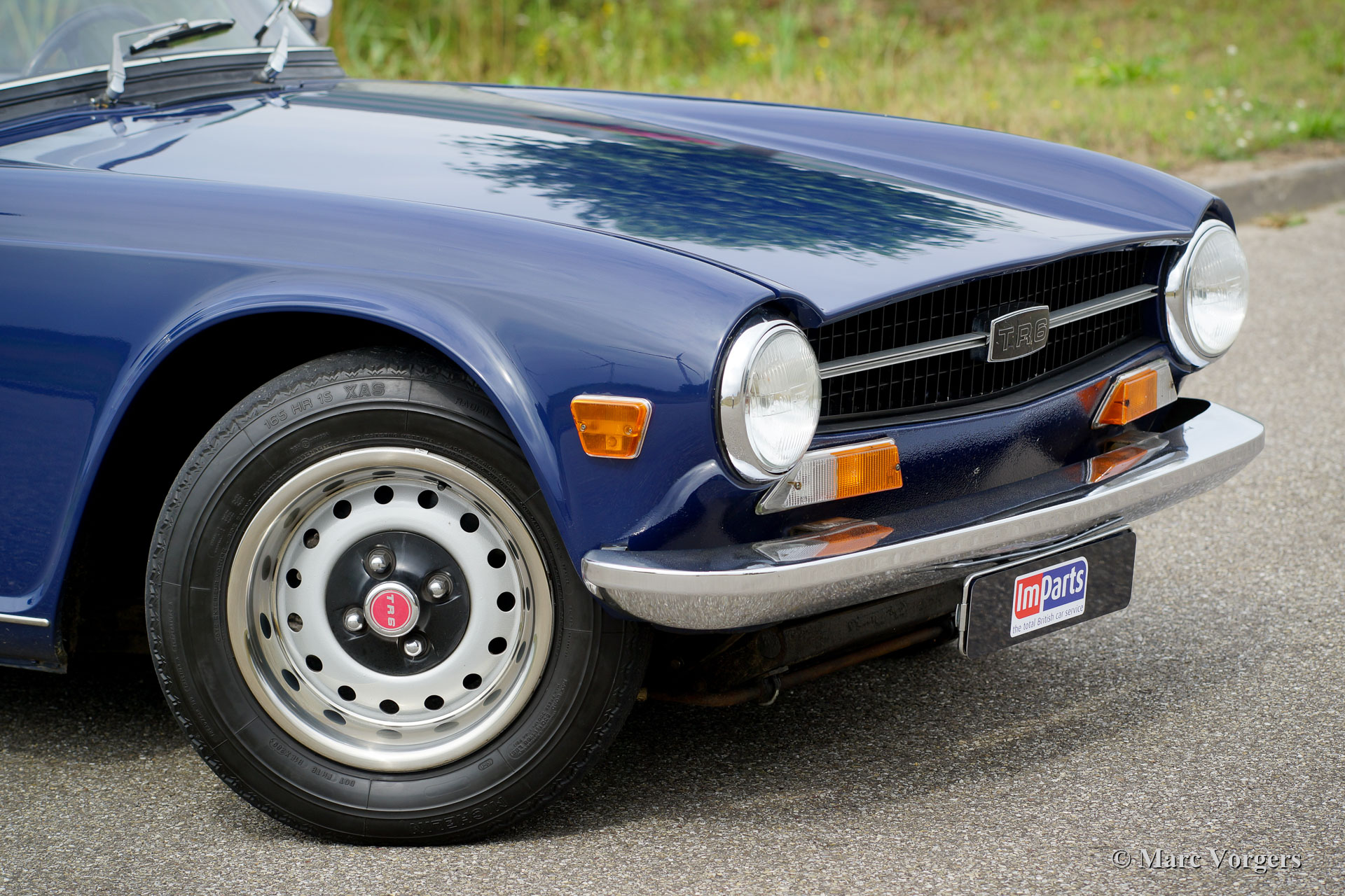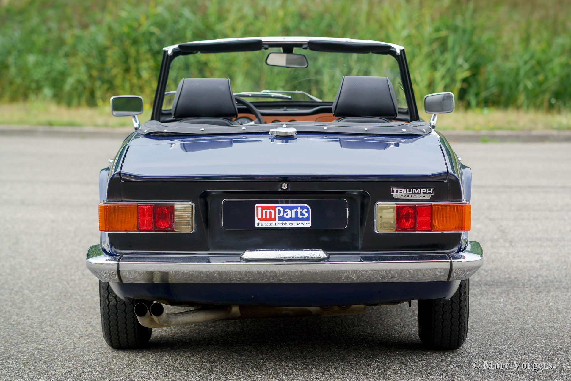 Triumph TR6 PI, année 1972. Couleur bleu foncé avec un intérieur en cuir noir et tapis noir. Capot et couvercle de la hotte en vinyle noir. Ce magnifique TR6 PI est un modèle CP avec le très souhaitable moteur de 150 ch. La voiture a été livrée en Belgique comme voiture CKD à assembler, la voiture fut expédiée aux Pays-Bas en juin 1972. Ce TR6 PI fut chéri par le dernier propriétaire depuis 2005, l’automobile est en très bon état de conduite et la voiture pilote et sonne parfaitement ! La voiture est équipée d'un système PI modifié (pompe à essence Bosch au lieu du type Lucas), des sièges confort spécial avec dossiers supérieurs et appuie-têtes, deux rétroviseurs chromés, allumage électronique et un ventilateur électrique.