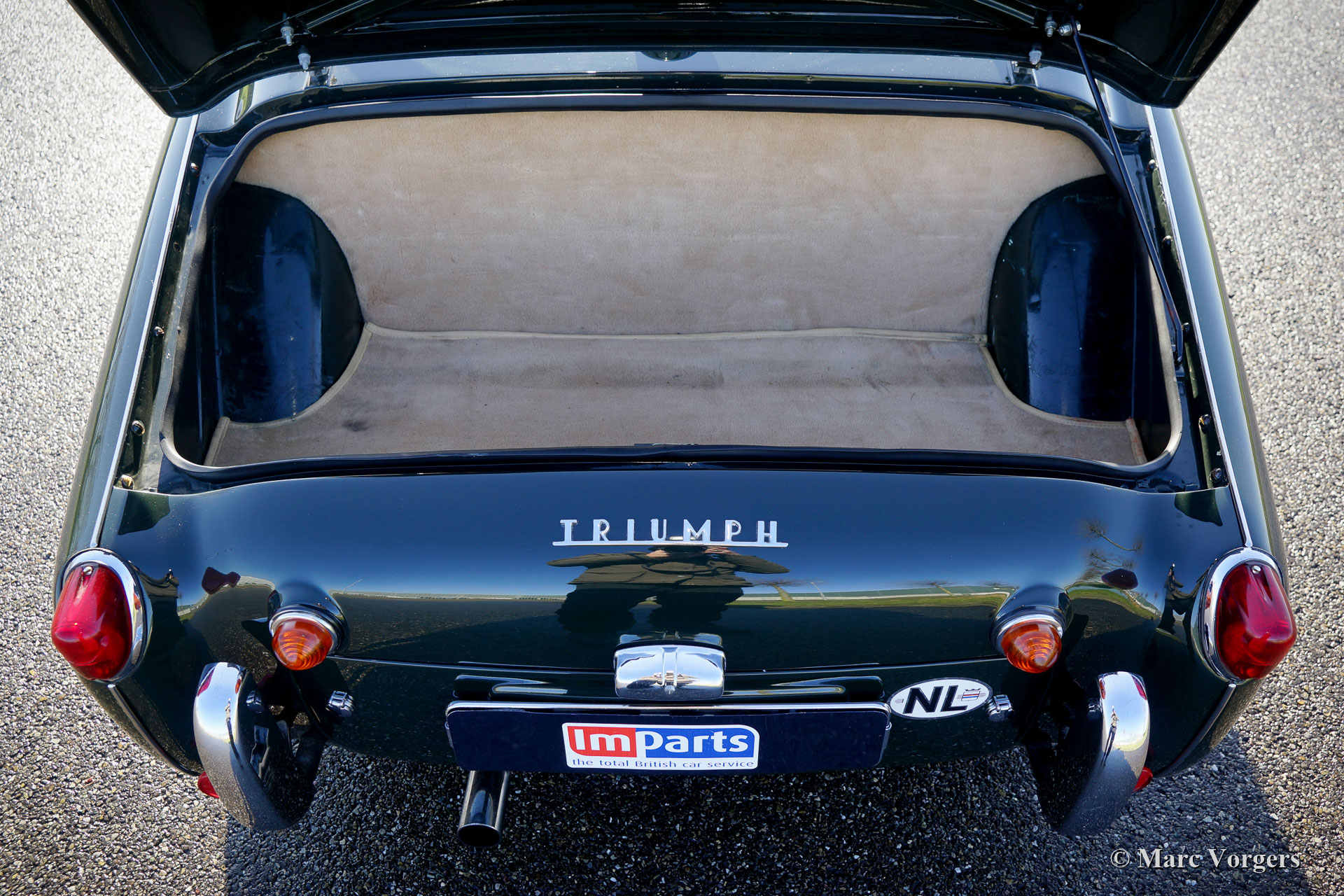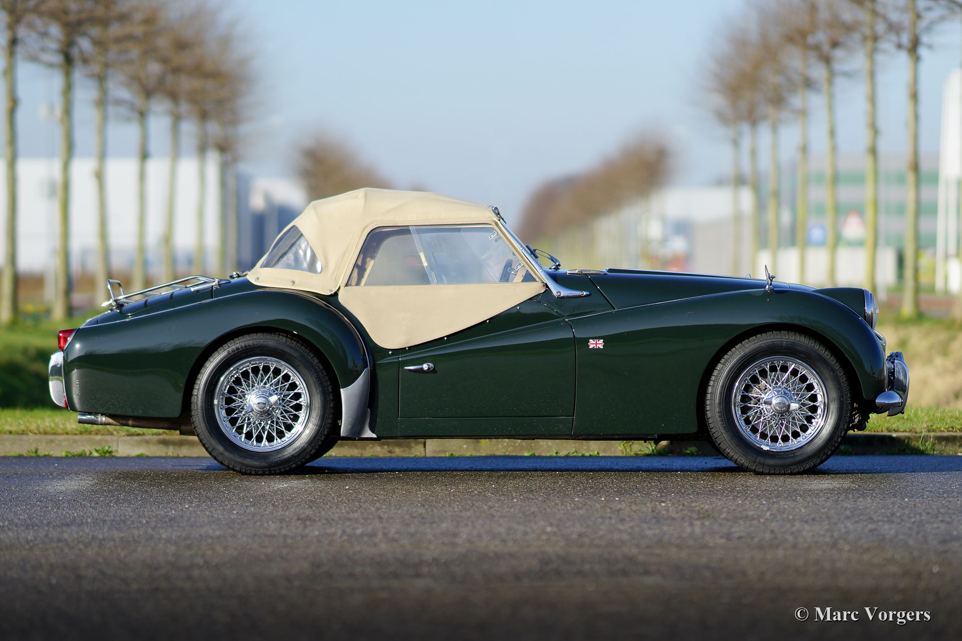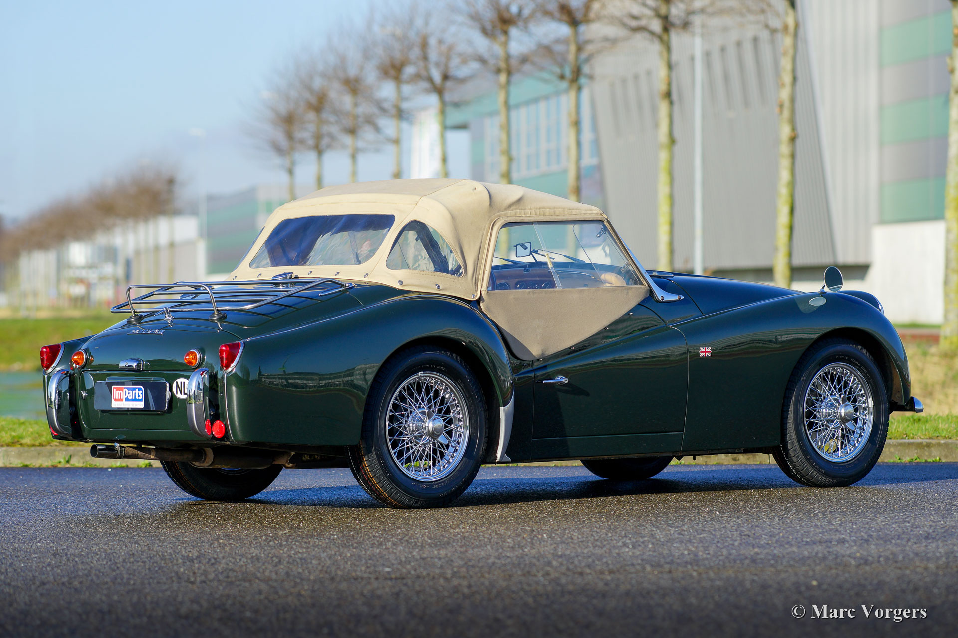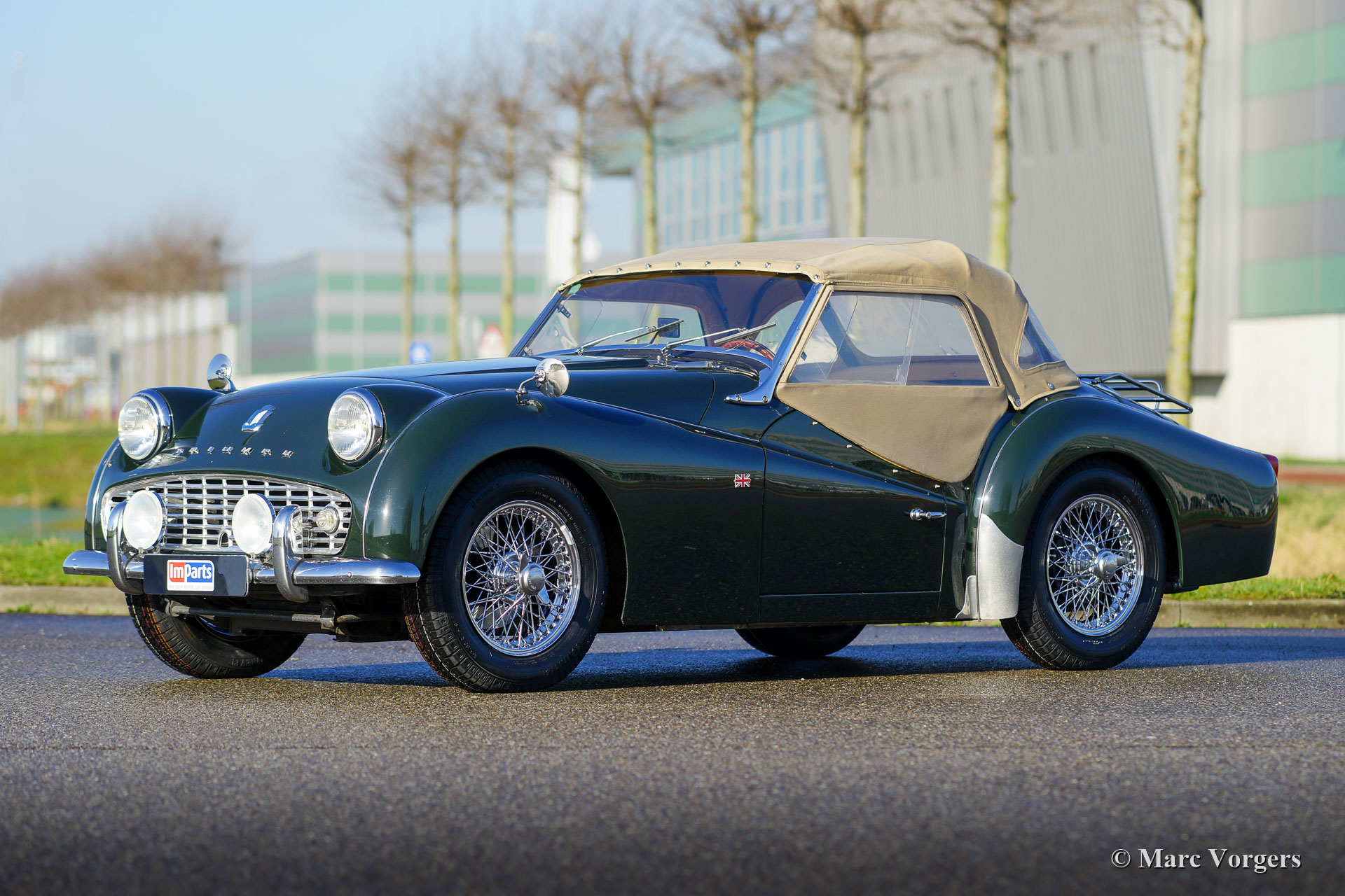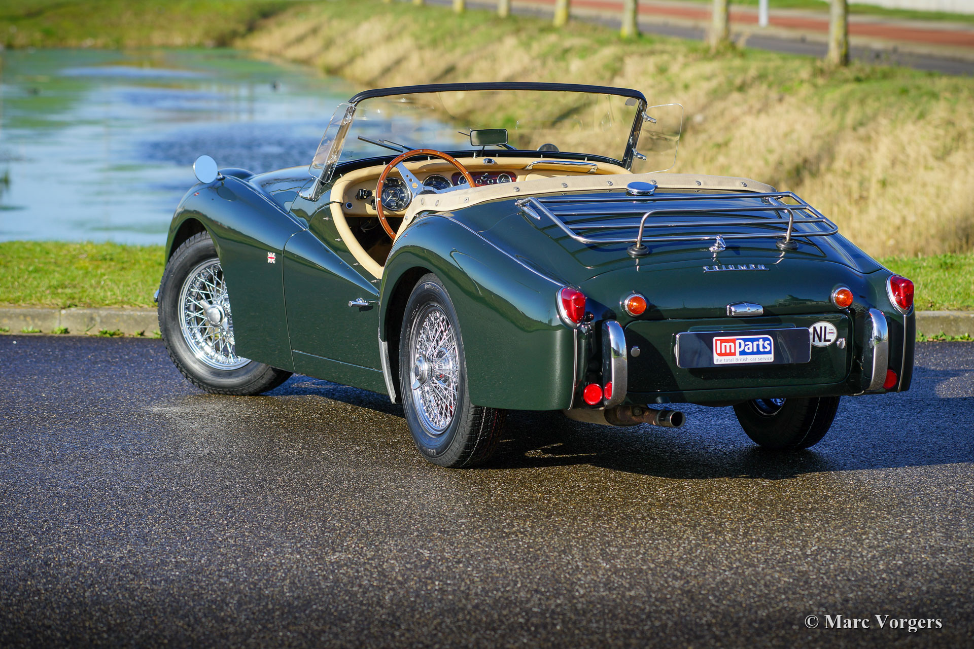 Triumph TR3 A, année 1960. Couleur « British Racing Green » combinée avec un intérieur en cuir beige (biscuit) garni de passepoil vert foncé. Capot en mohair beige et montures des écrans latéraux beige. Cette merveilleuse Triumph TR3 A a été importée des États-Unis en 1997. Après son arrivée aux Pays-Bas, la voiture fut restaurée détaillée en état de top. Le boîtier de direction a été remplacé par une unité plus moderne pour améliorer la direction qui est maintenant plus légère et plus précise. Ce TR3 A est en excellent état et il roule parfaitement ! La voiture est équipée d'une « overdrive », de nouvelles roues à rayons chromées, des projecteurs supplémentaires à l'avant, d'un volant MotoLita avec jante en bois, d'un porte-bagages chromé, d'un allumage électronique, de filtres à air sport K&N et d'un couvercle de soupapes en aluminium. Le moteur quatre cylindres en ligne de 2,2 litres tire fortement, et cela semble fantastique ! Un très bel exemple !