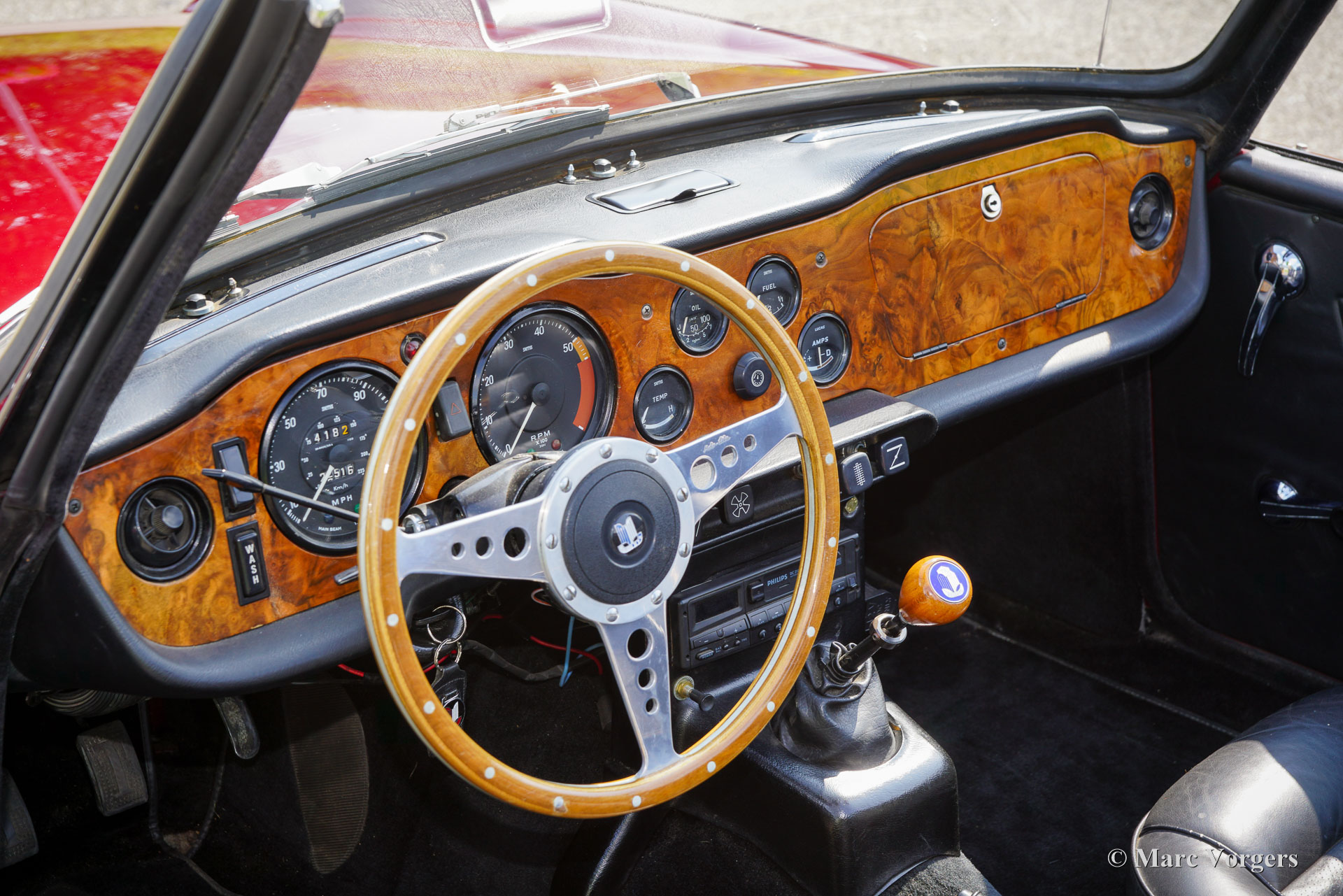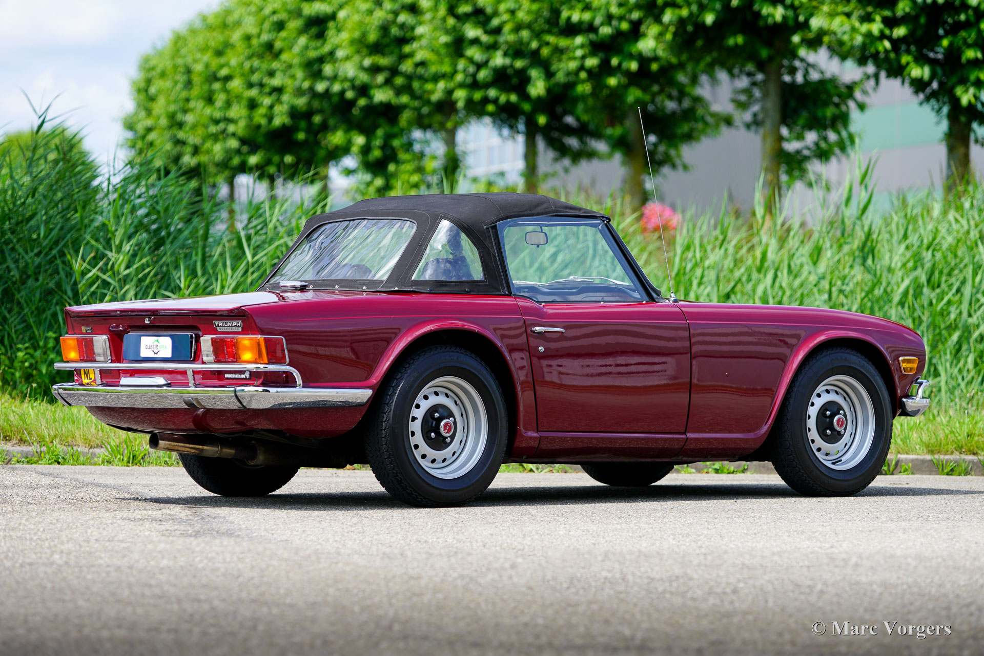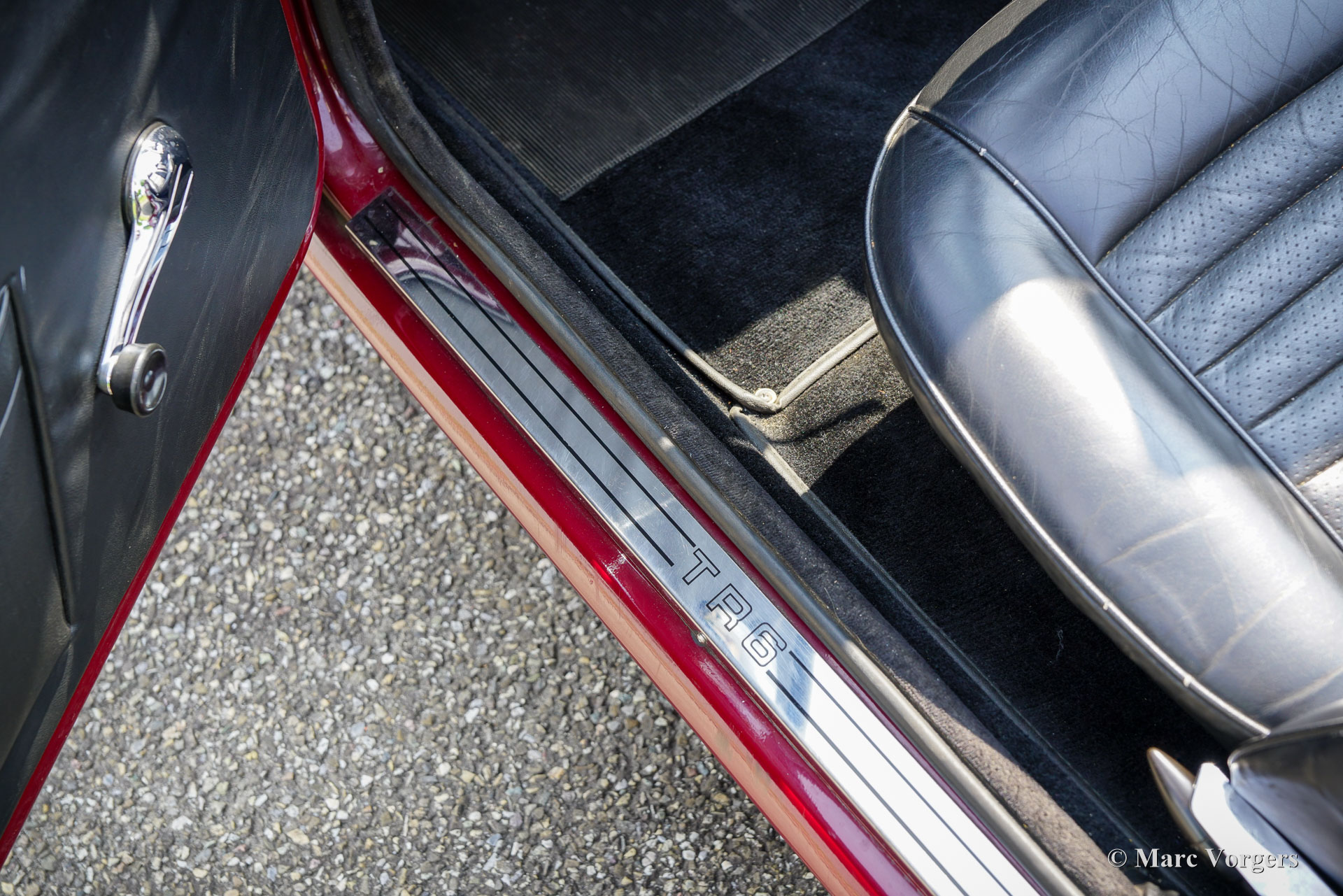 Triumph TR 6, année 1970. Couleur rouge foncé (Damson Red) associée à un intérieur en cuir noir garni de moquette noire. Capote en mohair noir et couvercle capote en vinyle noir. Cette magnifique Triumph TR 6 fut vendue neuve aux États-Unis. La voiture fut importée aux Pays-Bas en 1991 et fut chérie par un propriétaire depuis lors. Après son arrivée aux Pays-Bas, la TR 6 fut restaurée de manière approfondie et magnifique, un reportage photo de la restauration est présent. Pendant la restauration, le moteur, la boîte de vitesses et l'overdrive furent entièrement révisés. Cette magnifique Triumph TR 6 est en très bon état, et la voiture roule et sonne parfaitement ! L'entretien et les réparations ont toujours été effectués par un mécanicien expérimenté. La Triumph TR 6 fut produite de 1969 à 1976. Le précédent design Michelotti TR 4 et 5 a reçu un nouveau style avant et arrière par Karmann d'Allemagne donnant à la TR 6 une apparence sportive moderne et déterminée. Tout cela, combiné au vigoureux moteur six cylindres en ligne, à sa merveilleuse sonorité d'échappement et à l'intérieur confortable mais sportif, a fait de la TR 6 la TR la plus réussie et la plus populaire à cette date. Ce magnifique exemplaire présente les magnifiques jantes en acier d'origine et les sièges avec appuie-tête intégrés. La voiture est équipée de très bons et coûteux pneus Michelin XVS, de protections de carrosserie supplémentaires spéciales sur les pare-chocs, d'un volant sport MotoLita avec jante en bois, d'un pommeau de levier de vitesse en bois, d'un couvercle de soupape en aluminium, de filtres à air sport K&N, d'un échappement sport 6 en 1 en acier inoxydable, de carburateurs S.U. et d'un allumage électronique. Cette TR 6 est une voiture de conduite très désirable en très bon état ! Cette belle voiture de sport britannique apportera un grand et durable sourire au visage du véritable passionné !