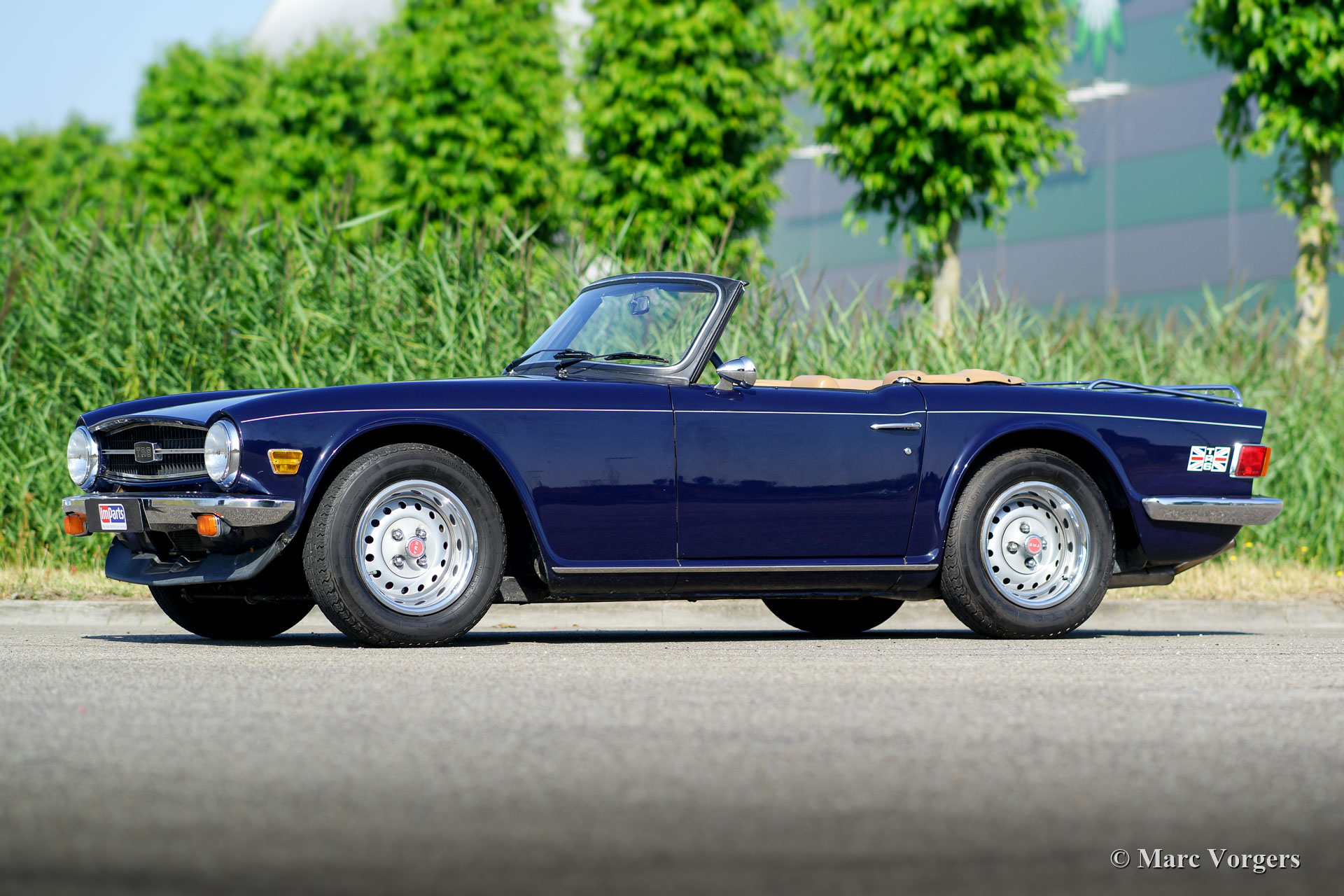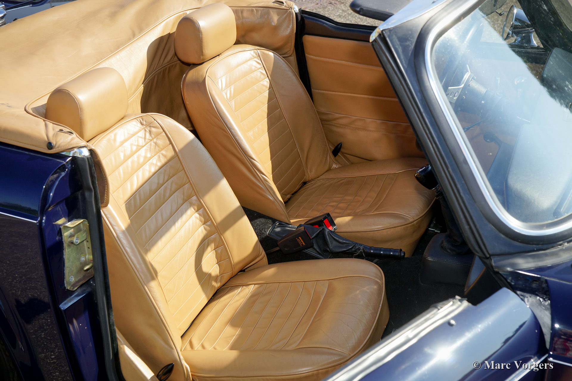 Triumph TR6, année 1976. Couleur bleu foncé « Midnight Blue » combinée avec un intérieur en cuir beige et tapis noir. Capot en mohair noir et capuche en faux-cuir beige. Ce fantastique Triumph TR6 fut restauré dans le passé, la voiture est en très bon état et la voiture roule délicieusement. Le tableau de bord en bois avec les nombreuses jauges et les enjoliveurs chromés est l'un des plus beaux tableaux de bord de voiture de sport que vous ne verrez jamais. Vous vous sentez vraiment comme le pilote d'un « avion de chasse » dans un Triumph TR6 ! Le moteur six cylindres en ligne de 2,5 litres semble incroyable et il est équipé de deux nouvelles S.U. carburateurs. Cette automobile comprend : un servofrein plus puissant, un allumage électronique 123, un refroidisseur d'huile, un ventilateur de refroidissement électrique automatique, un interrupteur d'alimentation, une barre stabilisatrice supplémentaire à l'arrière, un double échappement sport en acier inoxydable, un porte bagages chromés et une couverture de tonneau noire. Triumph TR 6 : La dernière des vraies voitures de sport britanniques !