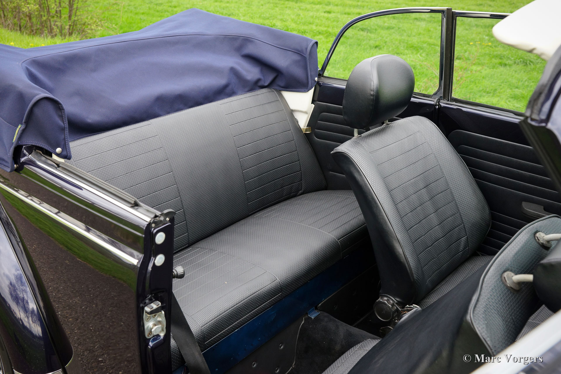 Volkswagen 'Coccinelle' 1303 LS cabriolet, année 1973. Numéro de châssis : 15329117XX. Couleur bleu foncé métallique avec un intérieur en similicuir noir et le tapis noir. Capot de mohair bleu et couvercle de la hotte bleu. Ce magnifique VW 'Coccinelle' classique fut restauré dans le passé. En 2007, la voiture fut importée aux Pays-Bas. Ce beau cabriolet est en très bonne à excellente état et la voiture fonctionne parfaitement. La voiture dispose d'un 1583 cc. Moteur boxer refroidi par air et roues à disque chromé de 15 pouces. C'est un délicieux cabriolet VW de quatre passagers !