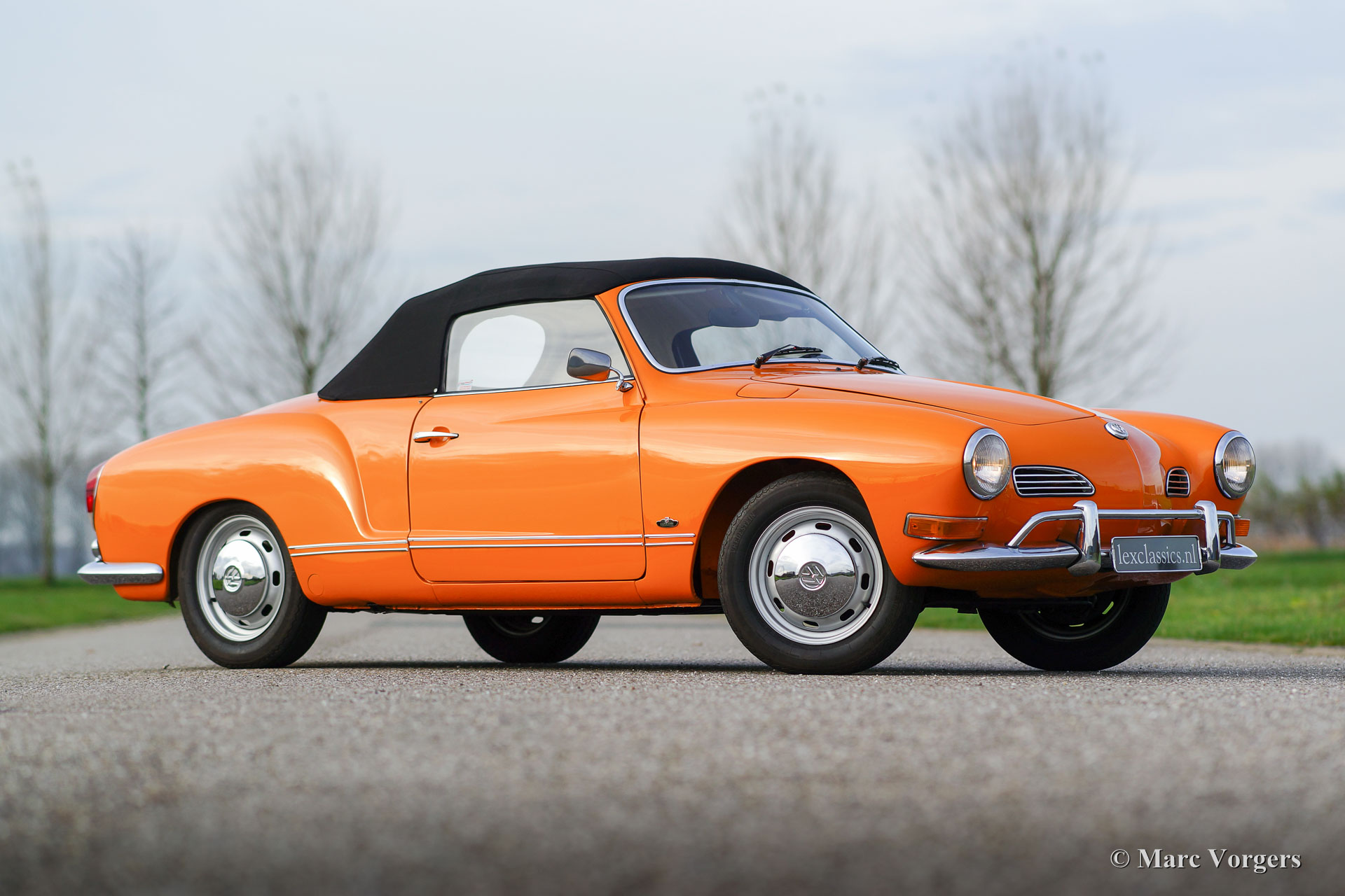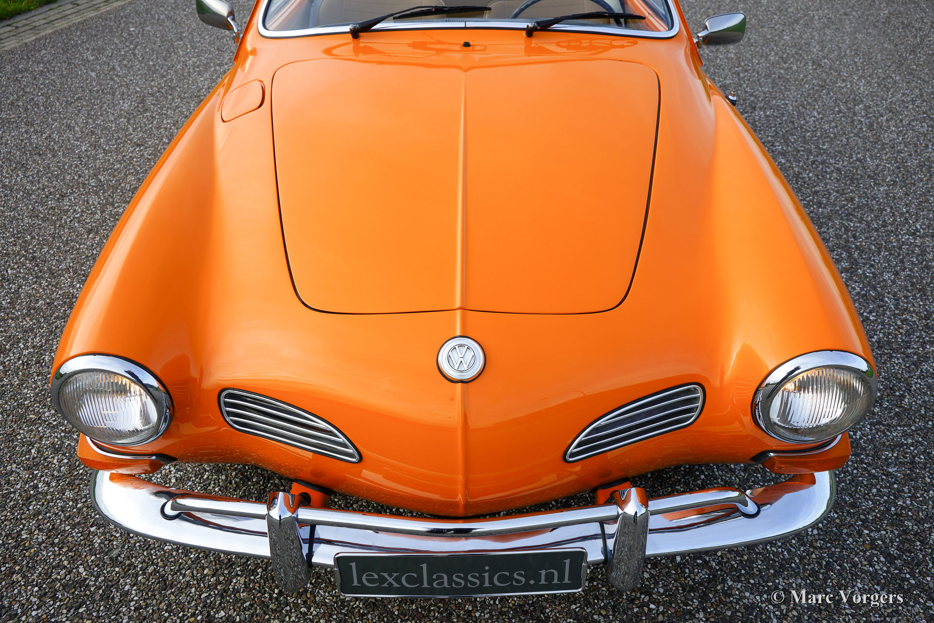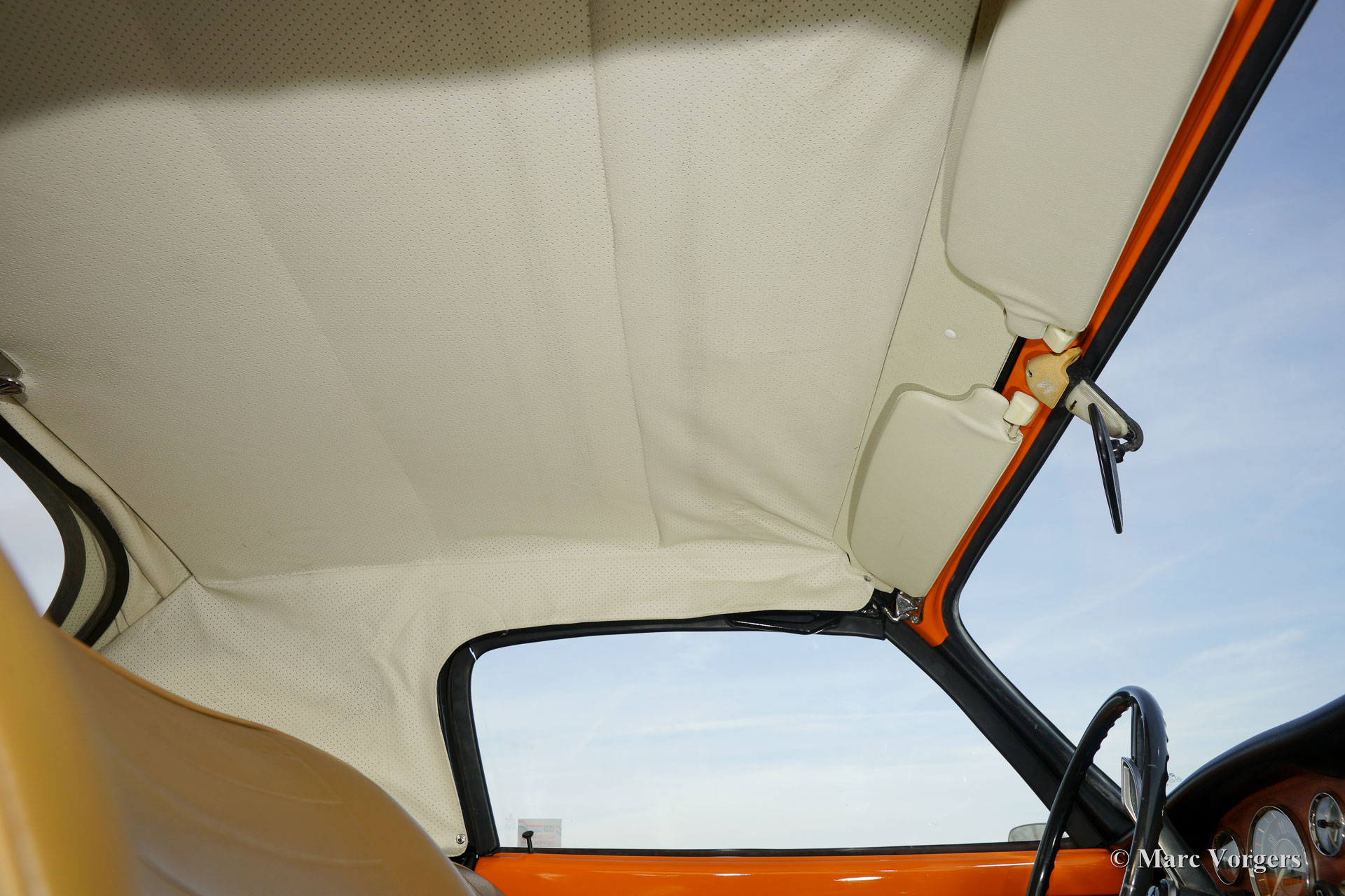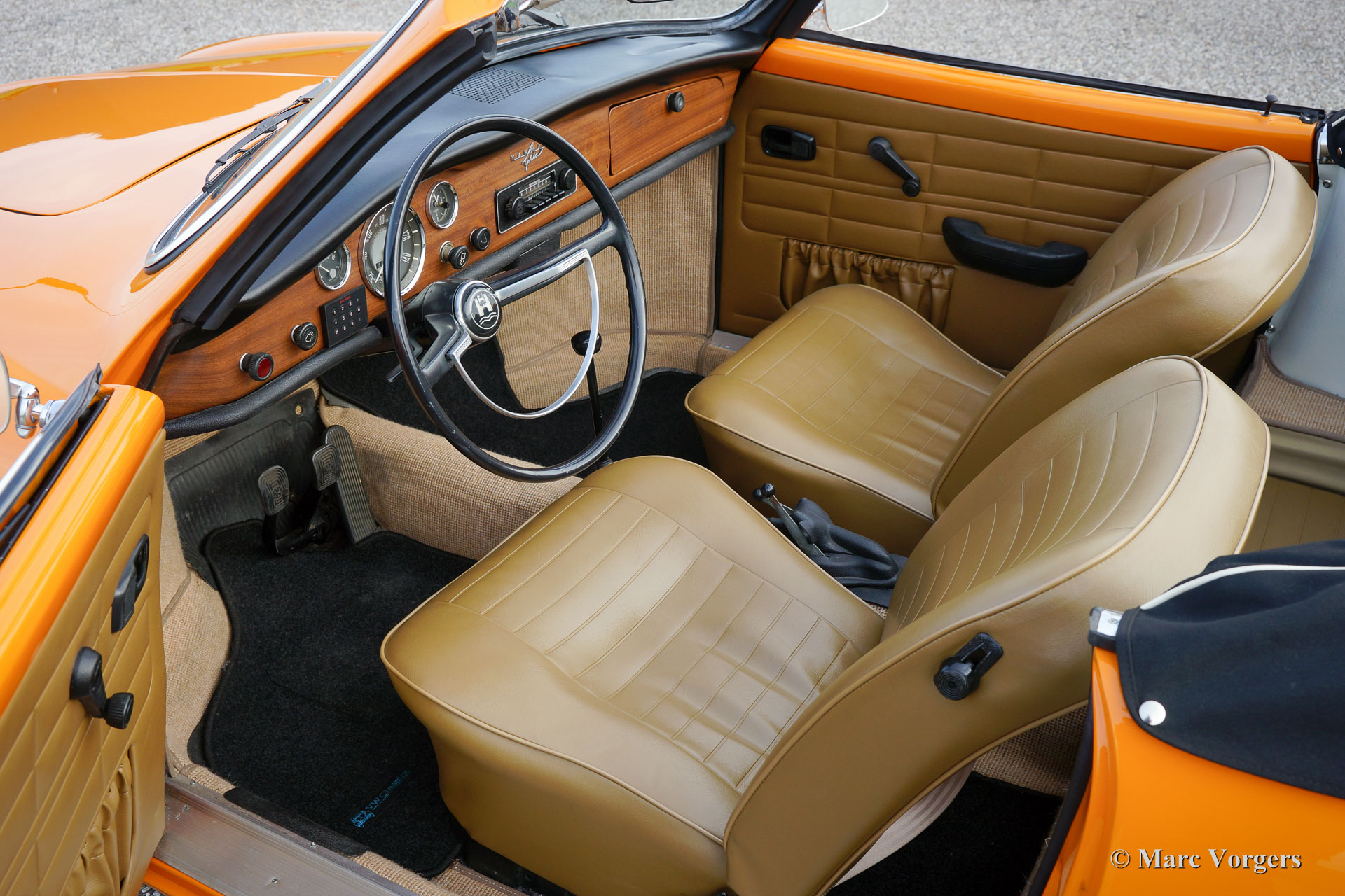 VW Karmann ghia 1500 cabriolet, année 1969. Couleur orange (Signalorange L20E) avec un intérieur beige en similicuir. Tapis beige et tapis protecteurs noirs. Capot noir et couvercle noir. Ce superbe Volkswagen Karmann Ghia cabriolet est en superbe état ! En 1969 la voiture a été vendue nouvelle à un employé de l'usine allemande VW. Décennies plus tard, la voiture a été importée aux Pays-Bas où la voiture a été restaurée détaillée. La restauration a débuté en 2005 et a été terminée en 2011. Les factures de la restauration sont présentes. Ce VW Karmann Ghia dispose du moteur boxer délicieuse 1500 cc à quatre cylindres à refroidissement par air. La voiture roule parfaitement et l'expérience de conduite est super !