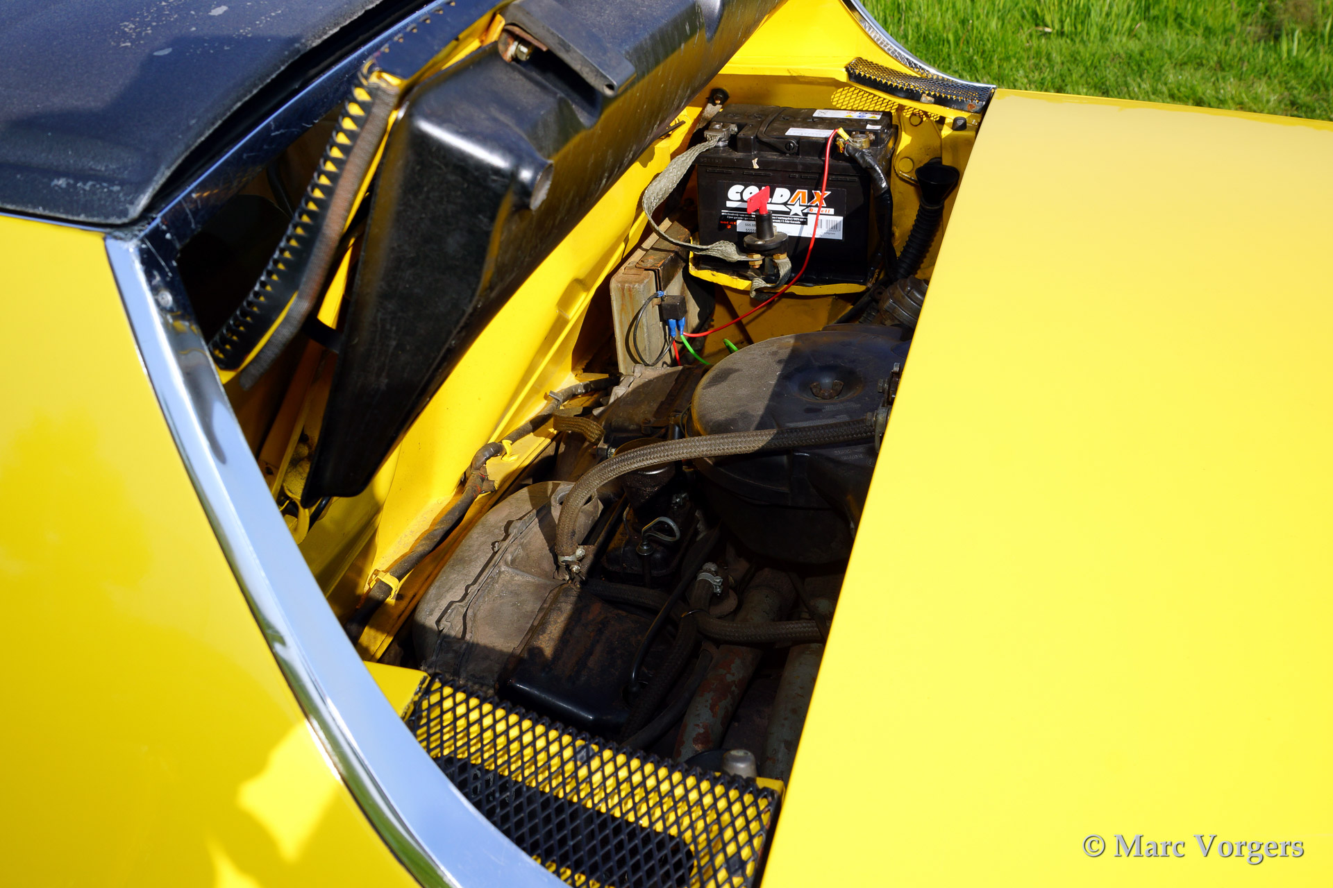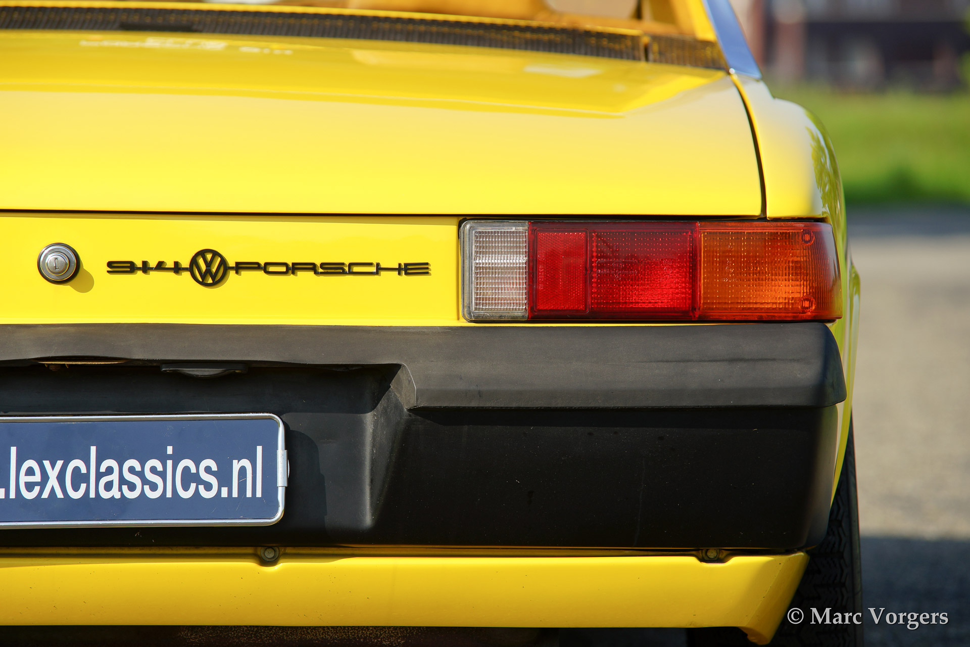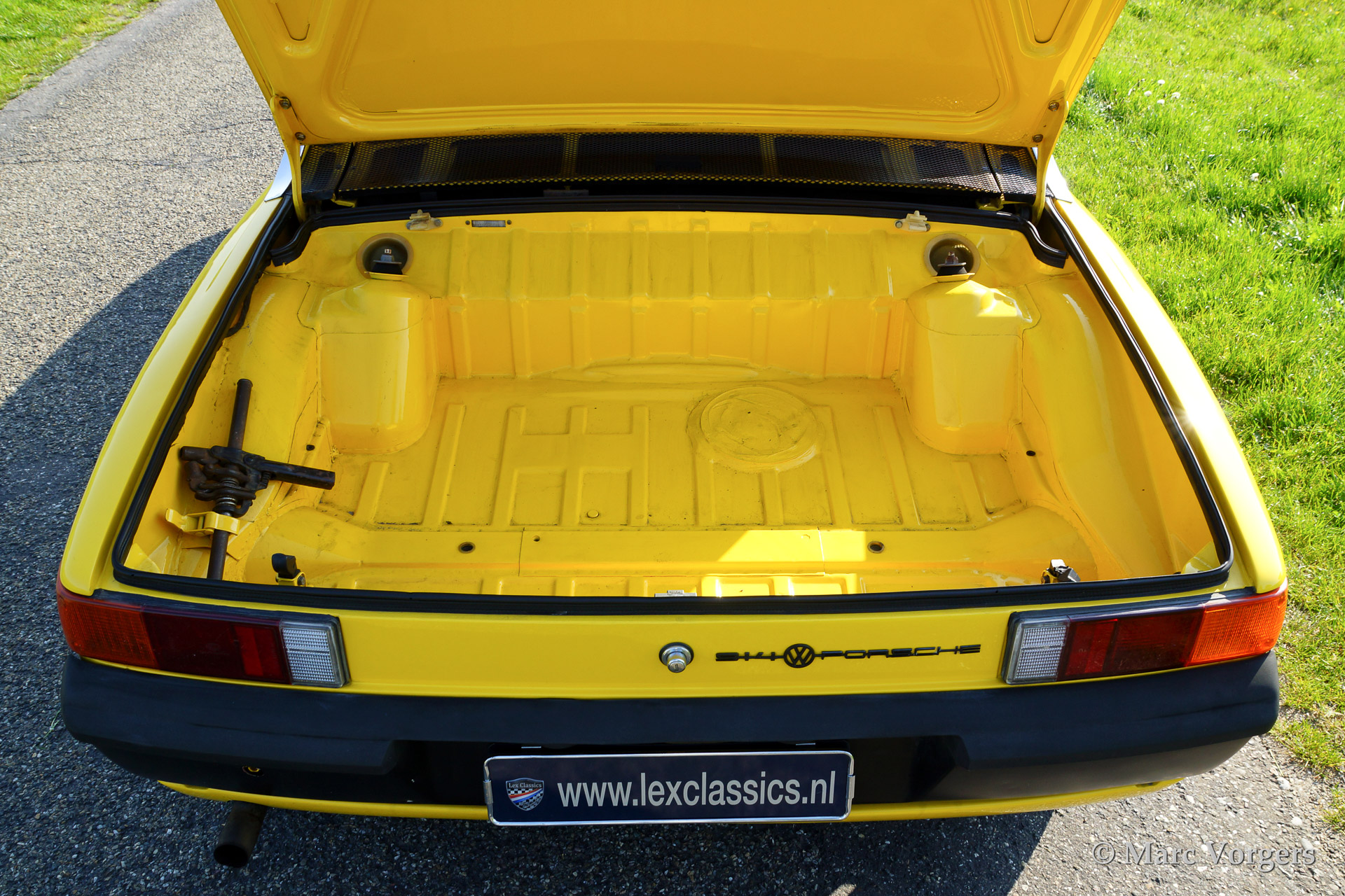 VW-Porsche 914 1.7L, year 1970. Colour yellow with a beige/black/grey interior. This VW-Porsche 914 was extensively restored. The originally black interior has been given a more luxurious appearance with beige leatherette covering the dashboard and the door panels. Special feature on the 914 is the detachable roof panel which can be stored in the rear compartment! With the roof panel in place luggage space is available in the front and the rear! This VW-Porsche 914 features alloy wheels, fog lamps at front and a car radio.