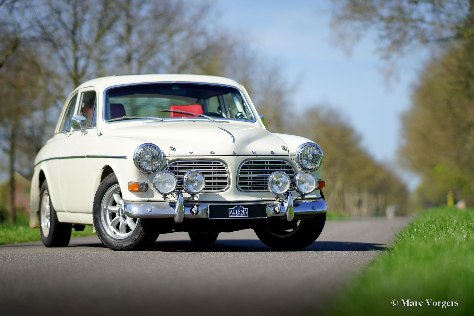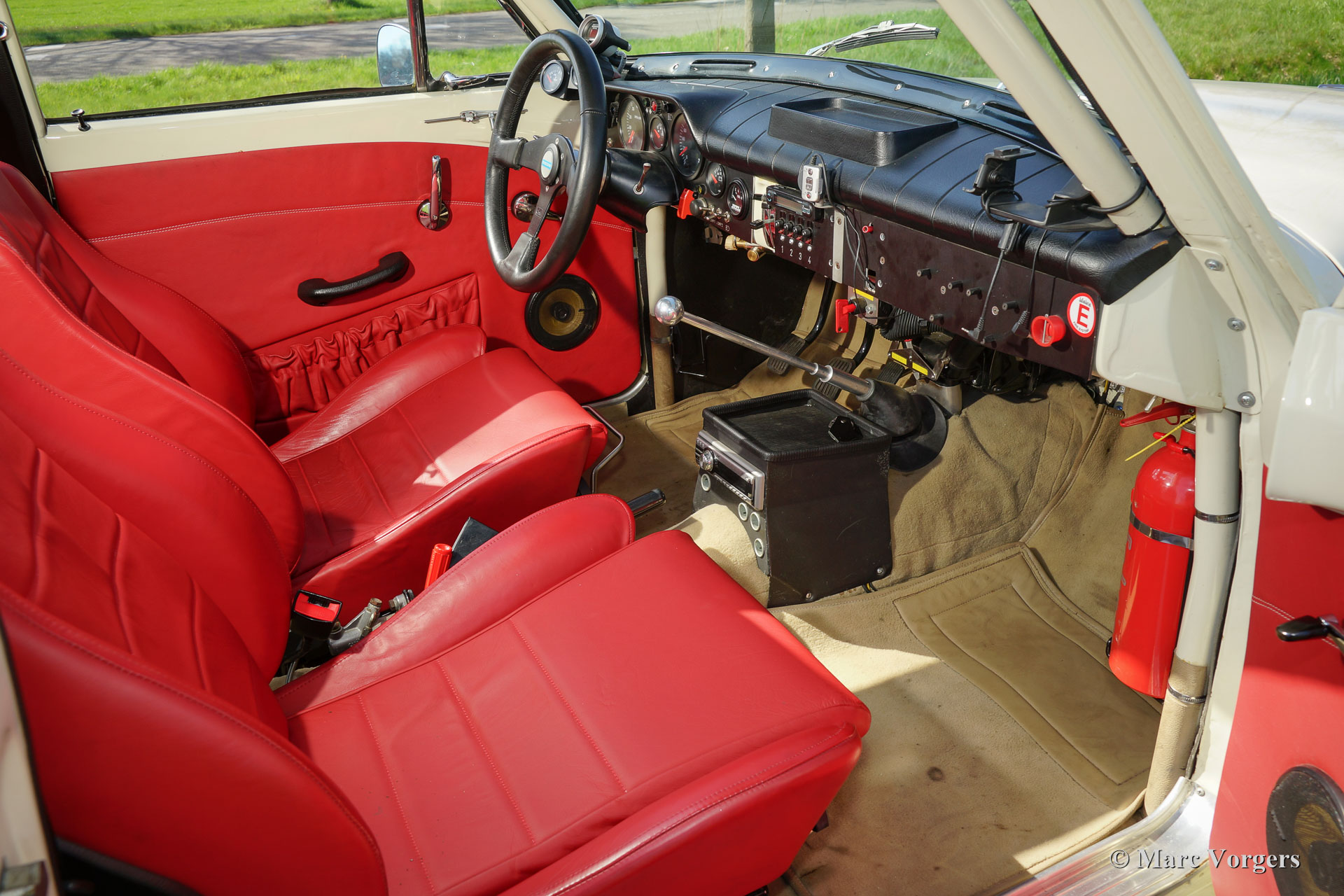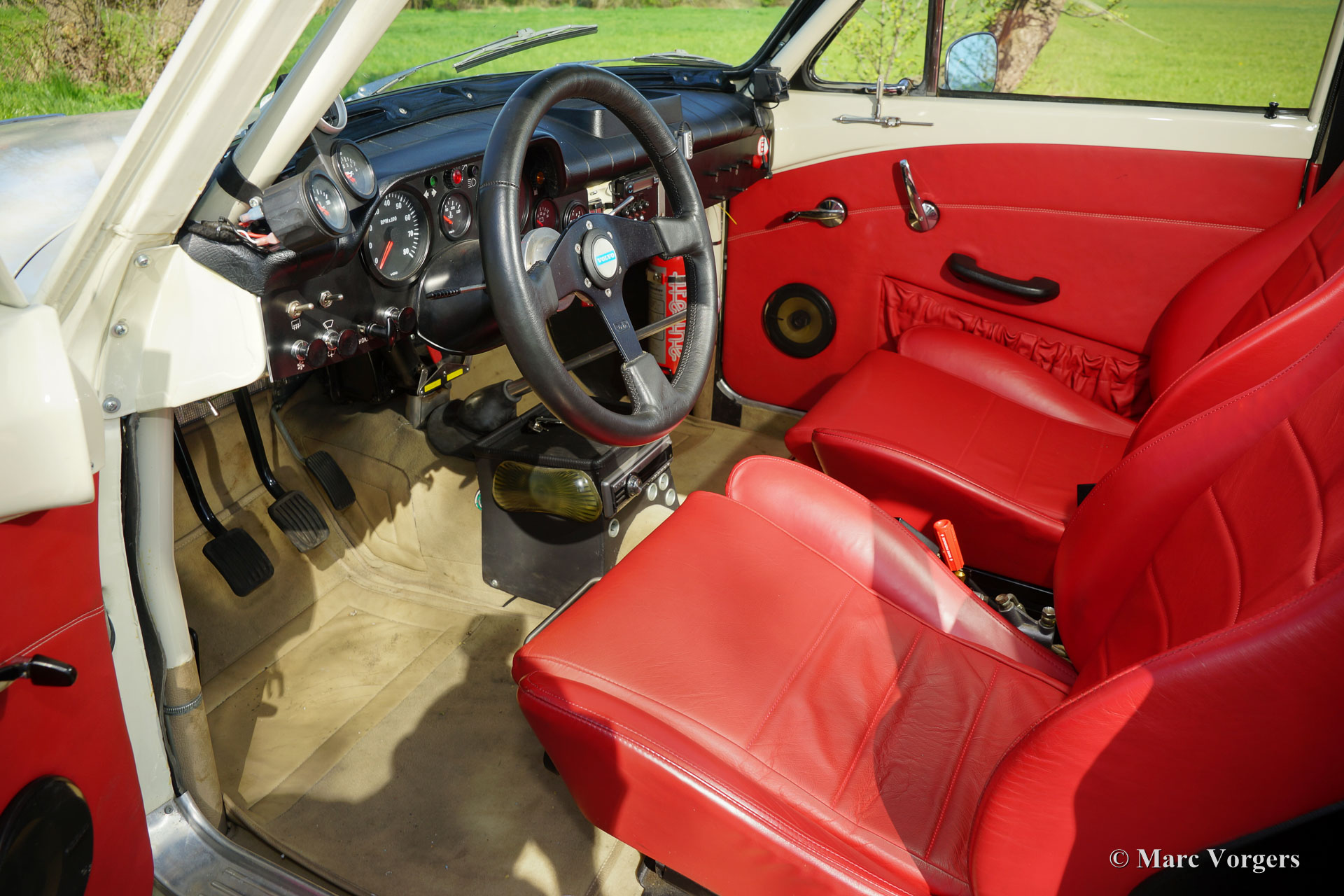 Volvo P130 Amazon rally car, year 1967. Colour crème with a red leather fully prepared rally interior and beige carpet. This Volvo P130 Amazon rally car was extensively restored and beautifully rally prepared! The car features a specially tuned engine, two twin choke Weber carburettors, up rated suspension, fully equipped rally interior and dashboard, safety fuel cell in the boot, Panasport alloy wheels and much more.