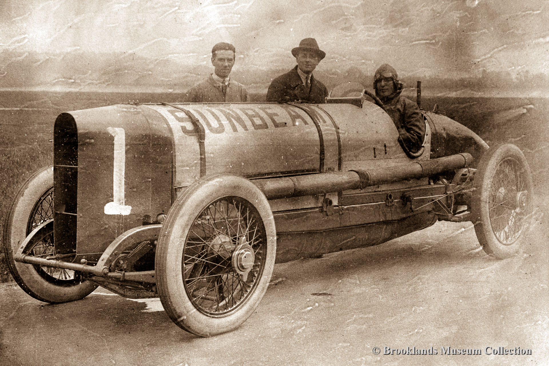 • 19 Sunbeam 350 HP record car. Designer Coatalen with hat and Sammy Davis behind the wheel. In May 1922 Kenelm Lee Guinnes set three records driving the 350 HP Sunbeam. The Brooklands lap record at 123.30 mph (198.43 km/h), then the world land speed record over a mile at 129.17 mph (207.88 km/h) and over a kilometre at 133.75 mph (215.25 km/h) – this was the last land speed record to be set on the Brooklands track.