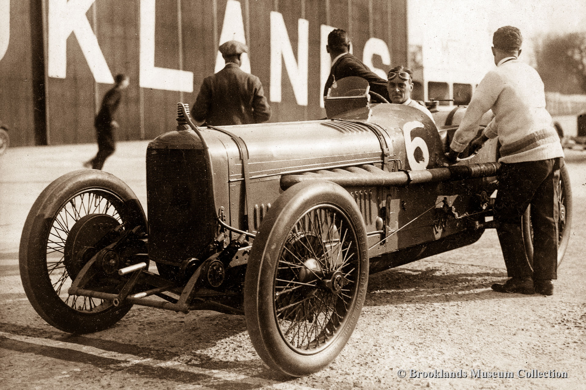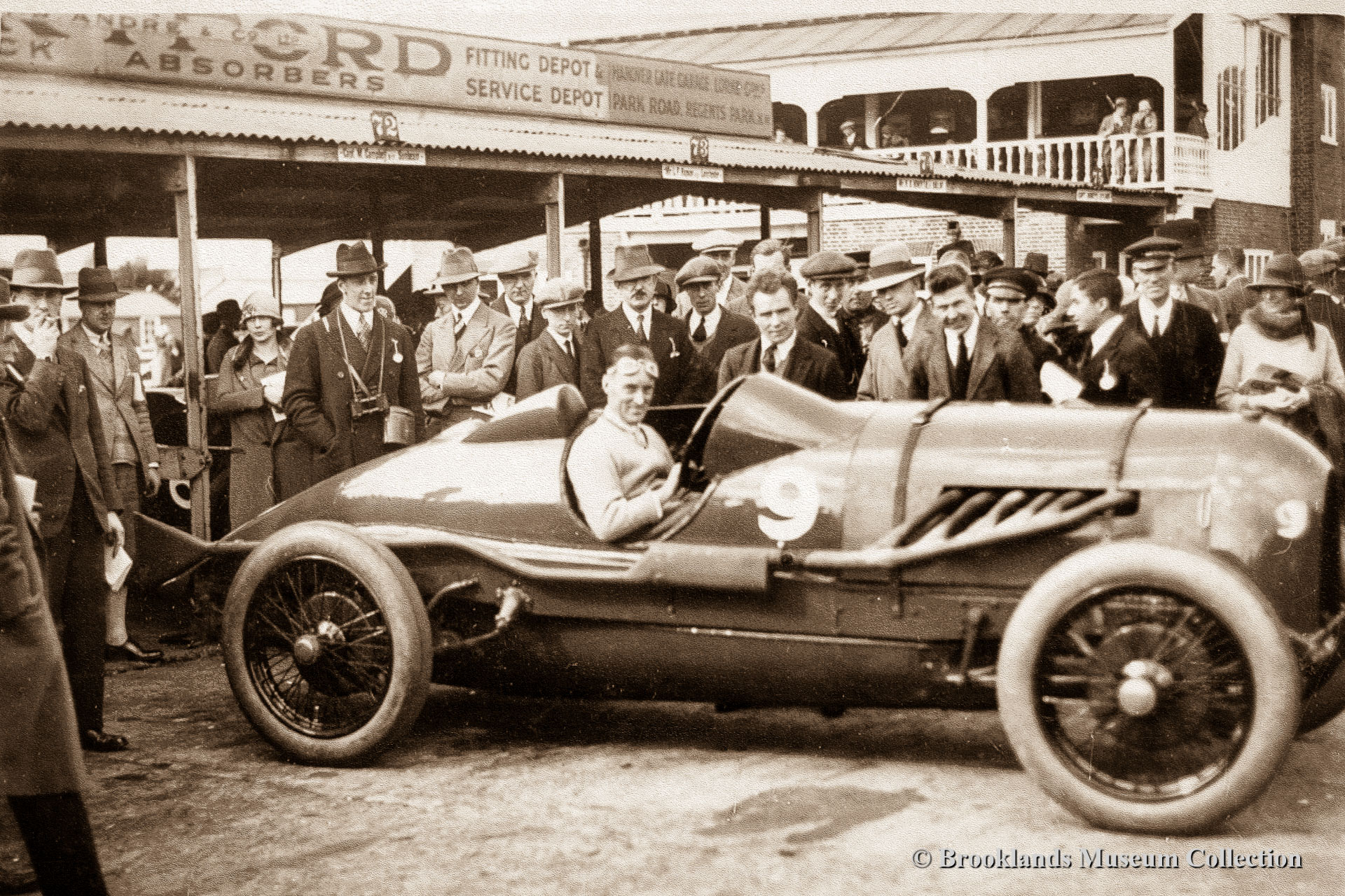 • 27 6 cylinder 4 Litre Sunbeam with Campbell in front of the Vickers aircraft factory flanking the 'fork' of Brooklands track