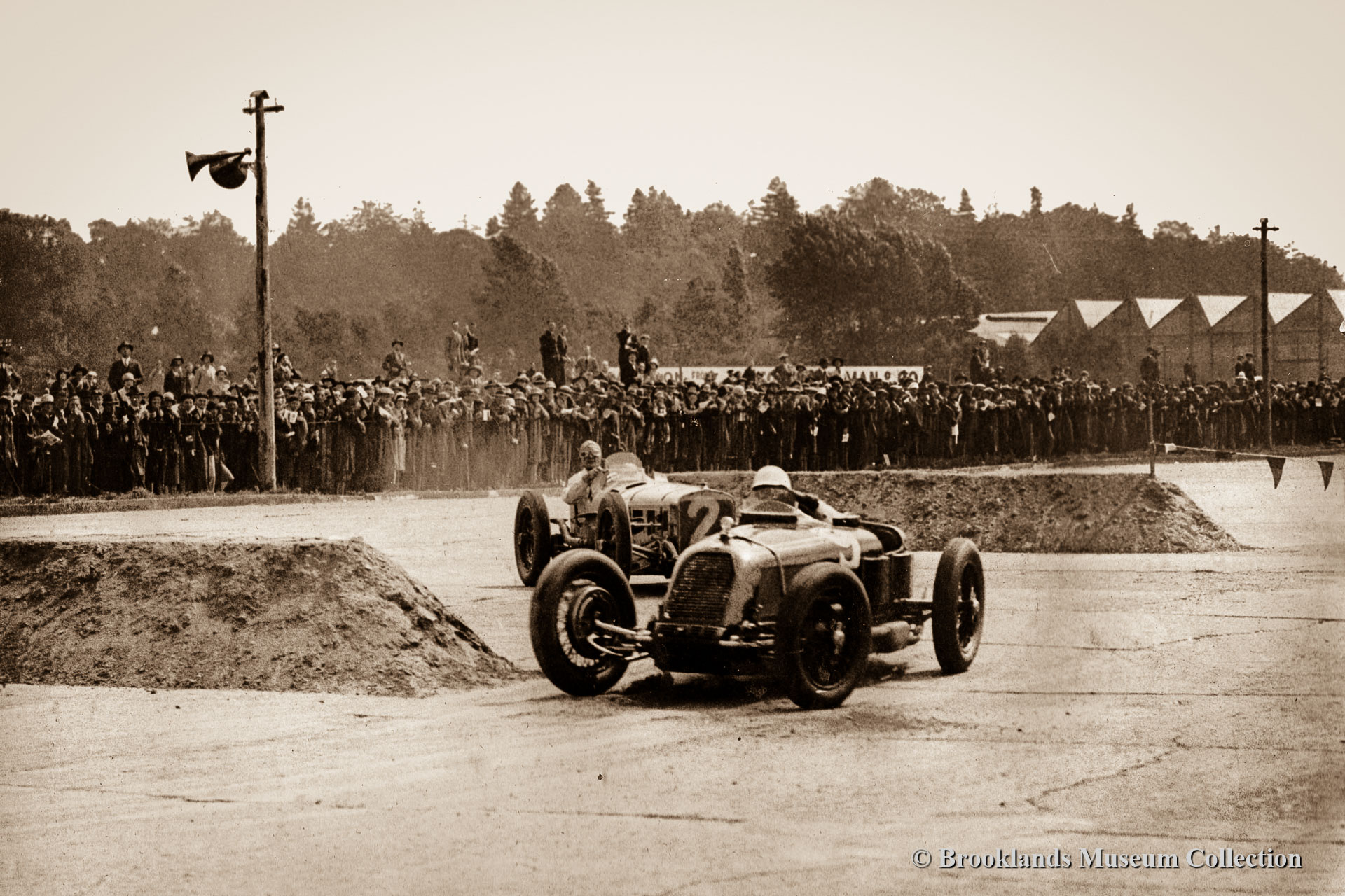 Below the photo descriptions you will find short original Pathe films of the Junior Car Club (JCC) 200 Miles race of 1923, the JCC Double Twelve race of 1930 and a film featuring the winning Napier Railton and John Cobb in the Brooklands Automobile Racing Club (BARC) 500 Miles race of 1935.