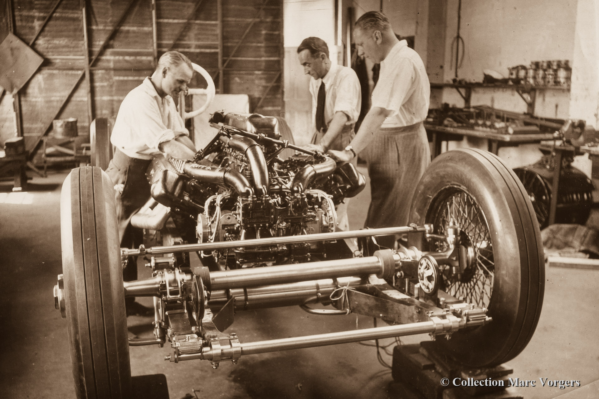 • 60 Building John Cobbs Napier Railton record car at Thomson & Taylor Brooklands 1932. Ken Taylor, Reid Railton and John Cobb are in the picture