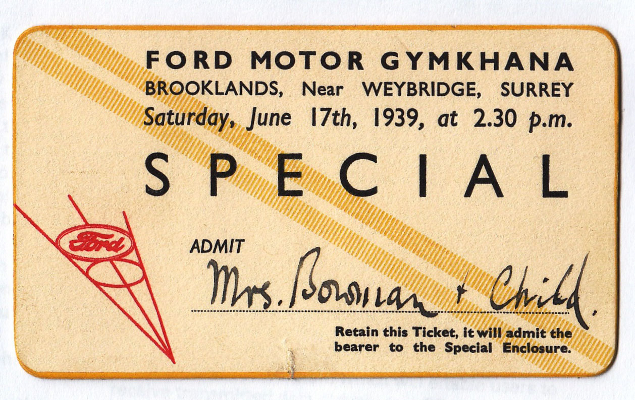 • 86 Entry ticket for the Ford Gymkhana at Broolands June 1939. This was the best visited event in the history of Brooklands!