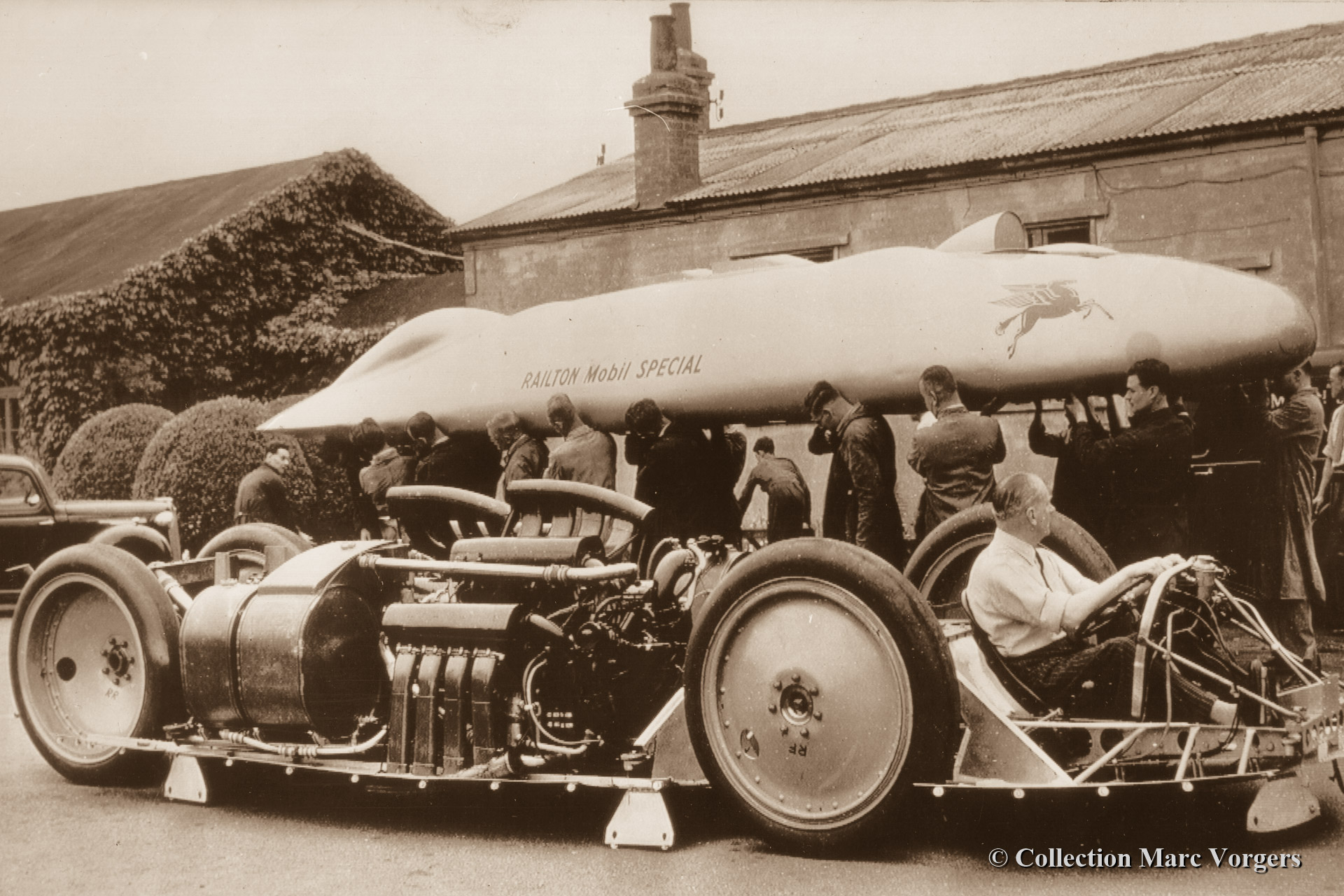 • 90 A great shot of the Railton Mobil Special showing John Cobb in charge, the big Napier Lion aero engines (driving all four wheels). About 6-8 men were needed to put the bodywork in place. Weight about 200 kg.