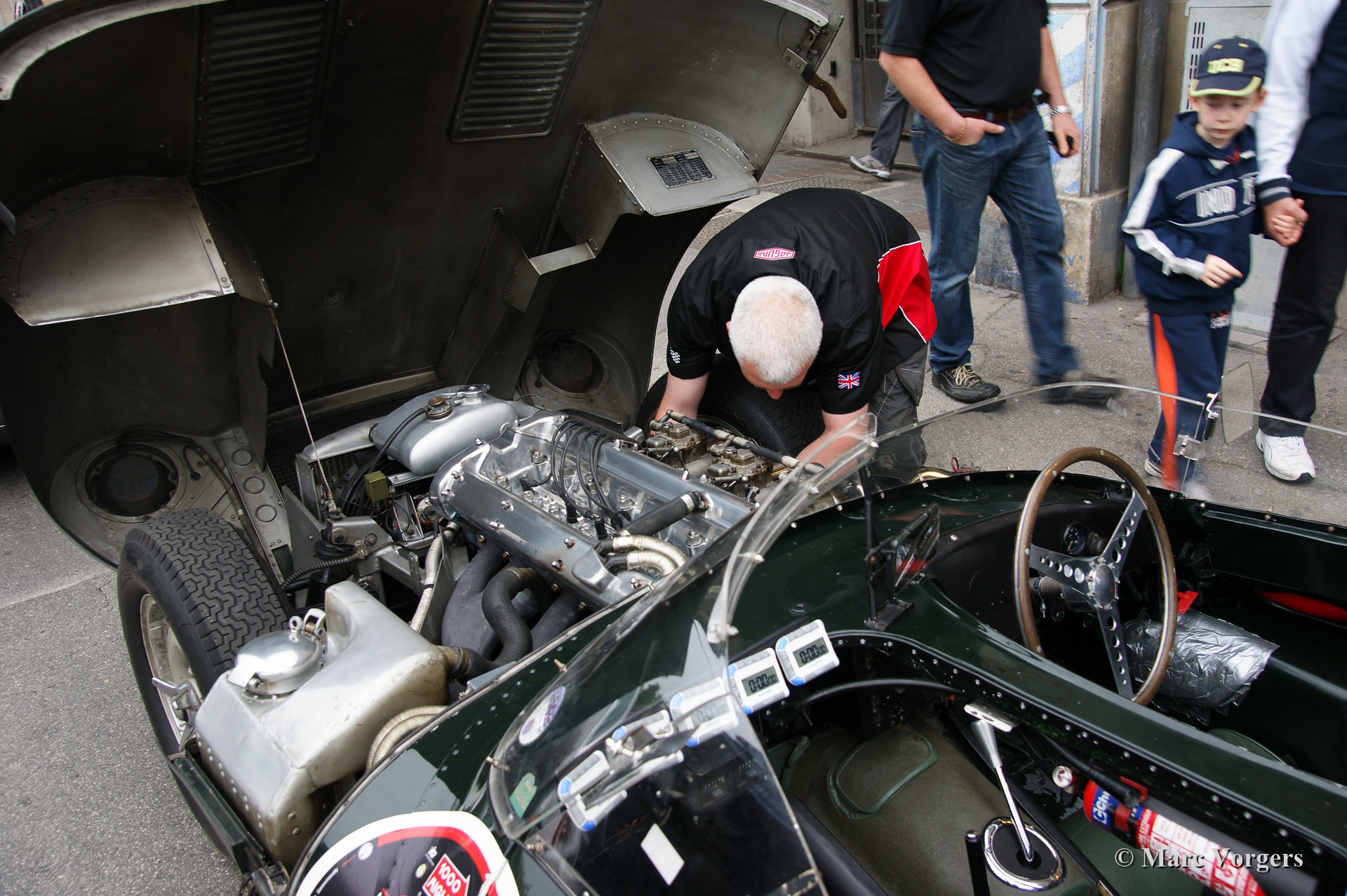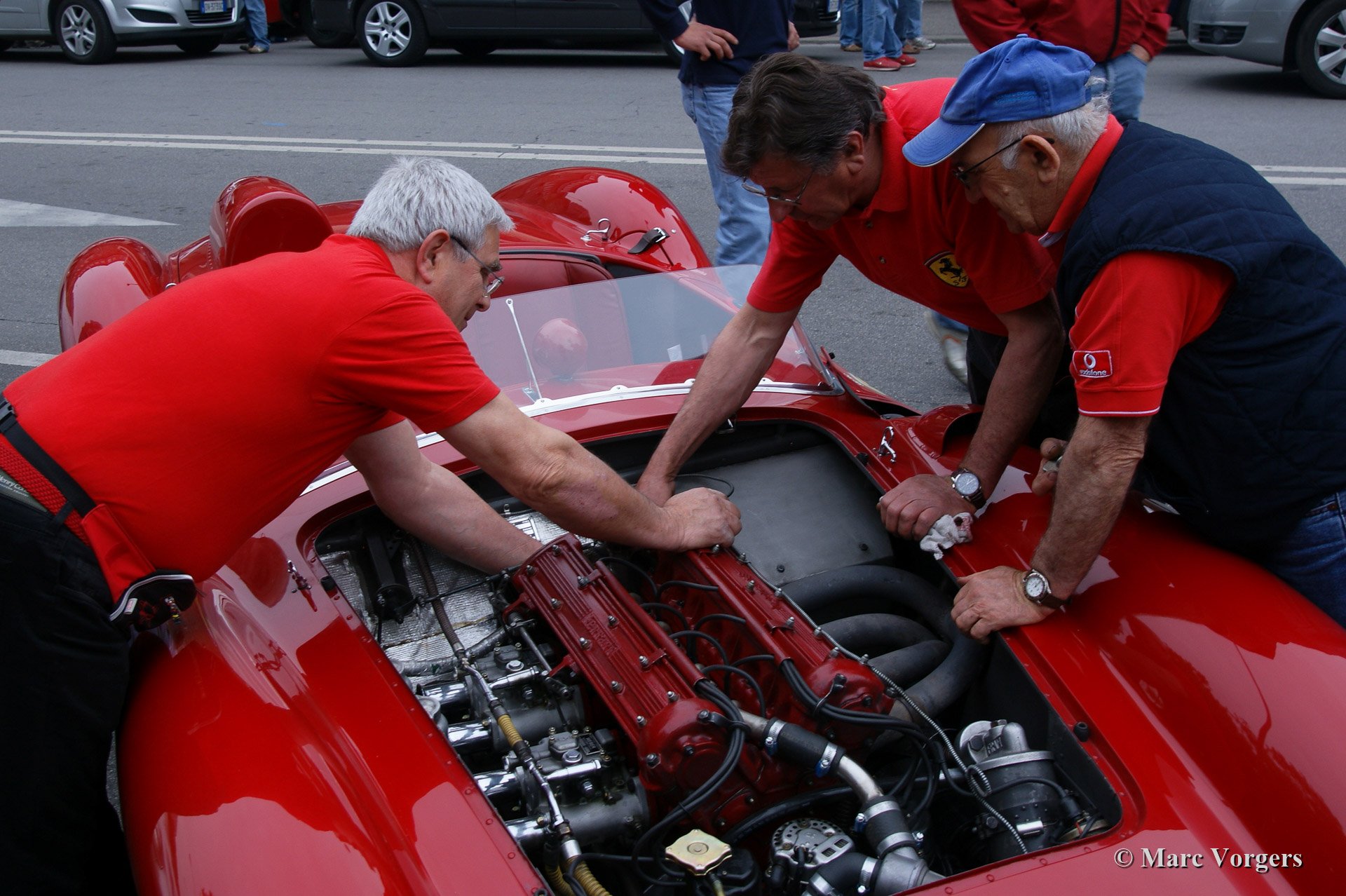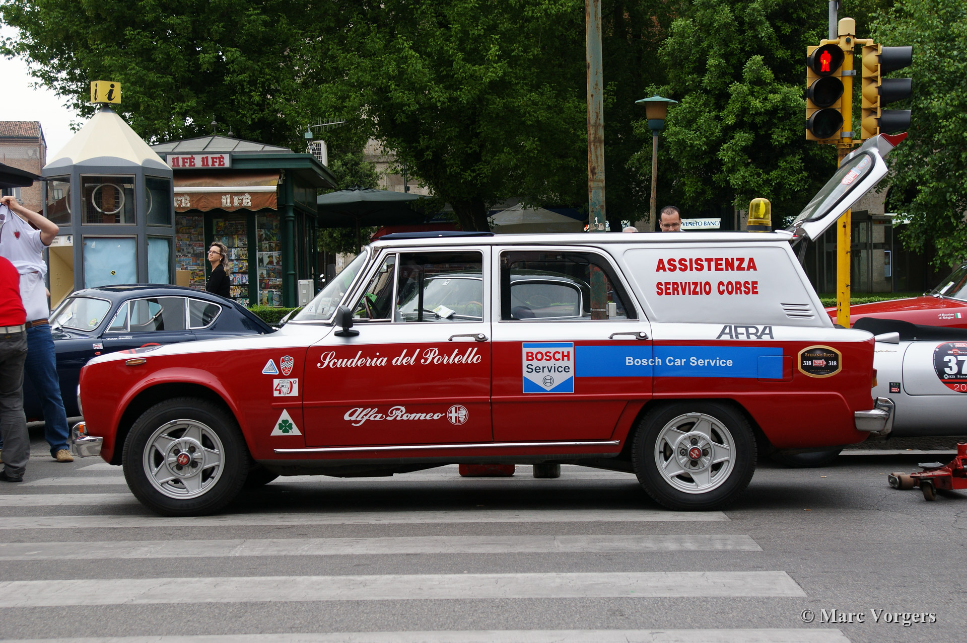 We followed the cars to Ferrara via the official Mille Miglia route and arrived there at 1:00 AM. The reportage continues with the preparations before the start of the second leg between 7:30 AM and 9:30 AM. This morning was absolutely perfect for us petrol heads. Cars being repaired and prepared, you could feel the thrill before the intensive 12 hour leg to Rome.