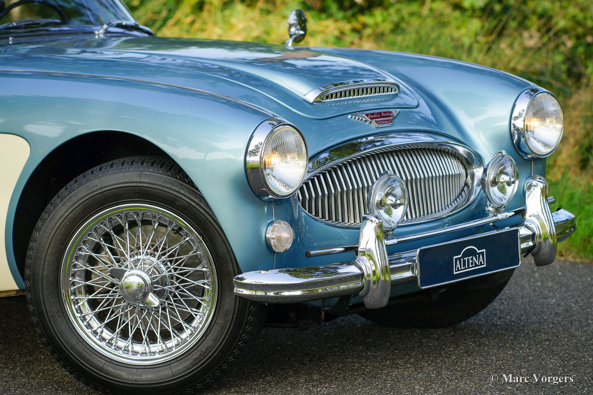Austin Healey 3000 Mk III phase 1, année 1964. Couleur bleu glacier métallisé sur blanc crème combiné à un intérieur en cuir bleu foncé et à un tapis bleu foncé. Capot et couvre-capuche en mohair bleu foncé. Cette très belle ‘Big Healey’ a été vendue neuve aux USA. L'automobile a été exportée aux Pays-Bas en 1995. Dans les années 1996-1997, la voiture fut largement et magnifiquement restaurée et révisée. Toutes les factures sont présentes dans un classeur. La carrosserie présente un très bon ajustement des panneaux, une très bonne peinture et un magnifique chrome. L'Austin Healey 3000 Mk III est doté d'un toit décapotable facile à monter et à descendre et de vitres latérales pratiques. Une autre caractéristique du Mk III est le tableau de bord en noyer pleine largeur avec boîte à gants et console radio. Ce magnifique spécimen est en très bon état intérieur et extérieur et la voiture roule et se comporte parfaitement ! La voiture est équipée d'un overdrive, de roues à rayons chromées chaussées de pneus Michelin 165/15, d'écrous de roue chromés, d'une barre d'insigne chromée sur le pare-chocs avant équipée d'une paire de projecteurs longue portée Lucas SLR576, d'un -Système d'échappement en acier inoxydable et une radio Blaupunkt Frankfurt classique avec FM. Cette Austin Healey 3000 Mk III phase 1 montre de magnifiques détails originaux, et la voiture est équipée du volant d'origine. Un exemplaire hautement désirable en très bon état !