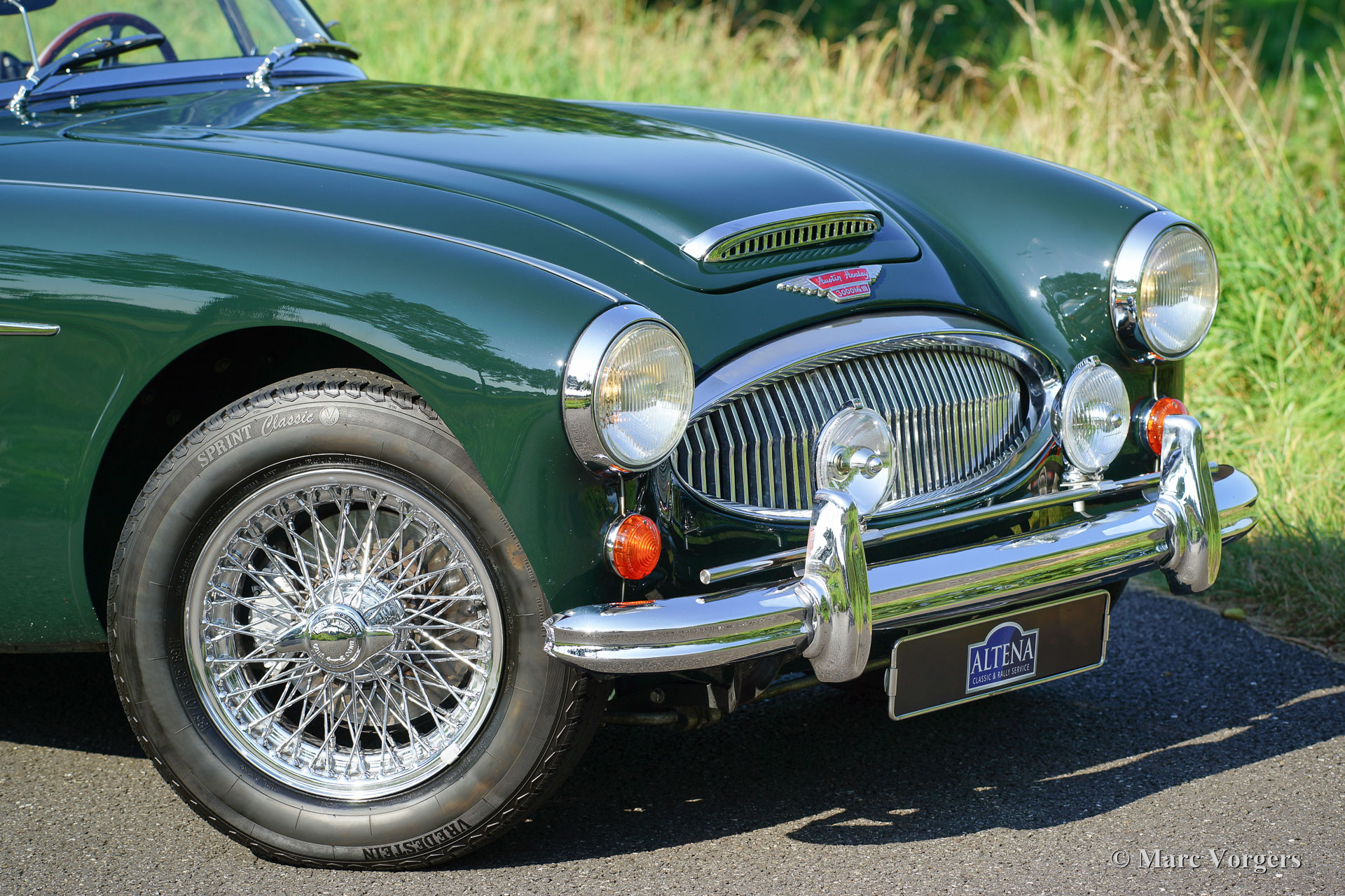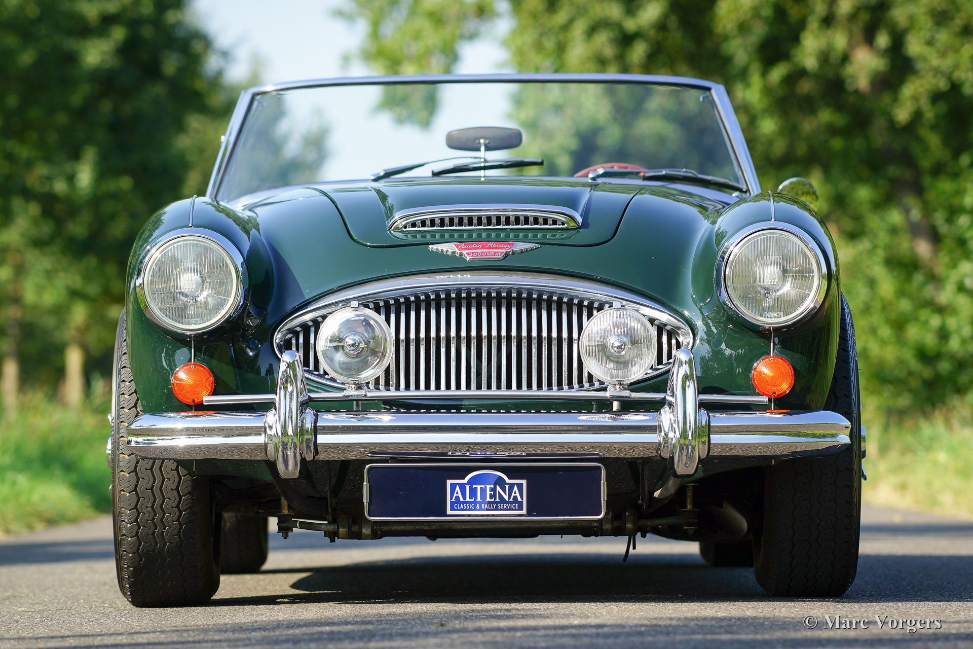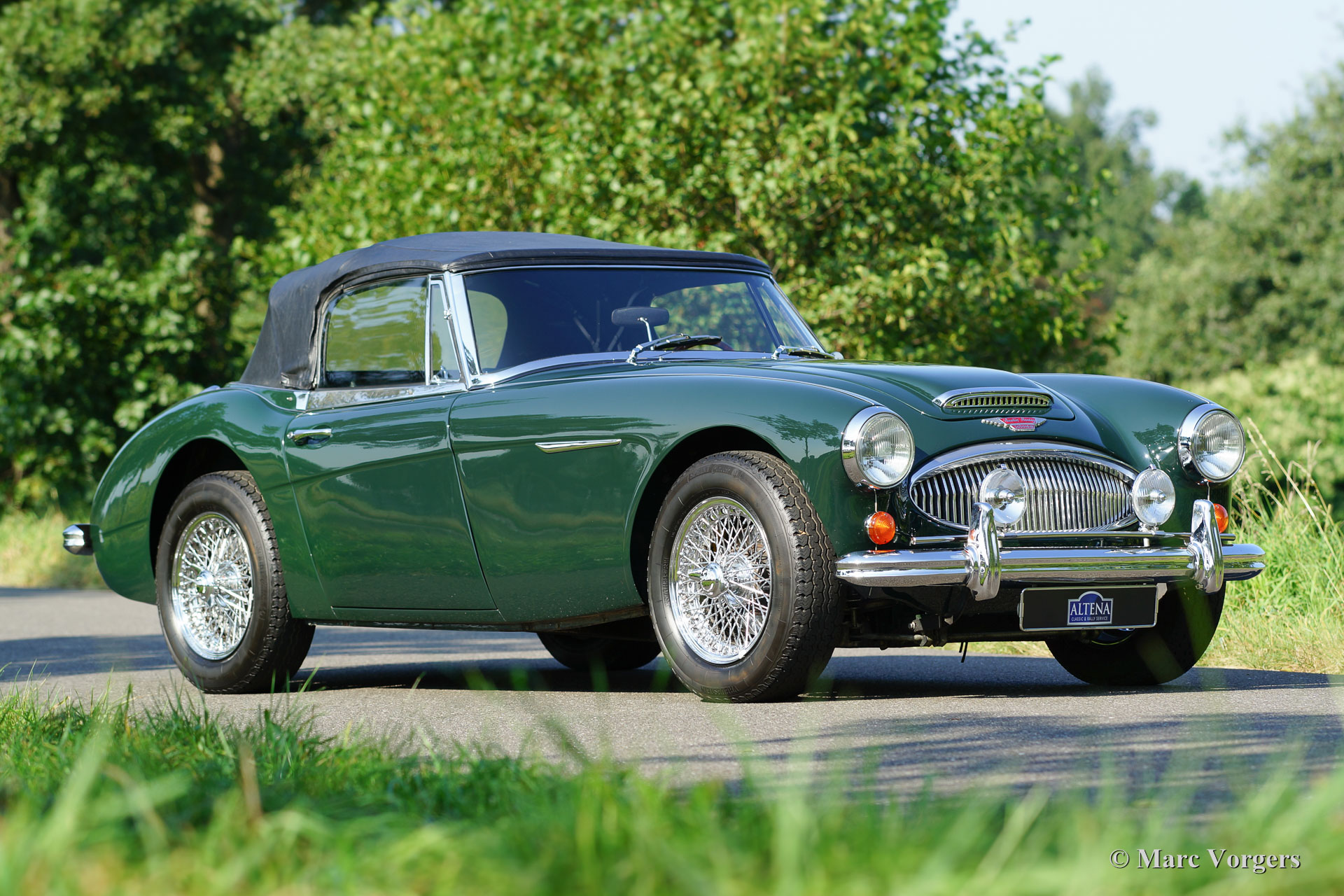 Austin Healey 3000 Mk III phase (BJ8), année 1966. Numéro de châssis HBJ8L301XX, numéro moteur 29K / RU / H167XX. Couleur British Racing Green avec un intérieur cuir vert et tapis vert. Capote en vinyle noir et le couvercle de la hotte noir. Ce fantastique Austin Healey 3000 a été restauré détaillé par un spécialiste allemand dans le passé. La carrosserie restaurée montre des lignes nettes et belle forme de panneau. Cette Austin Healey a été vendue au propriétaire actuel par Altena Classic Service en l’an 2003. Le Healey a été entretenu parfaitement ; la voiture est en excellent état et il conduit superbe ! La voiture dispose d'overdrive, roues de fil de chrome, chrome écrous de roue ‘knock off’, un porte-bagages chromé, un couvercle de tonneau, un cache-culbuteurs en aluminium, un badge-barre chromée avec des lampes supplémentaires, et un échappement latéral qui produit un magnifique son- Piste. Ceci est un délicieux 'Big Healey' !