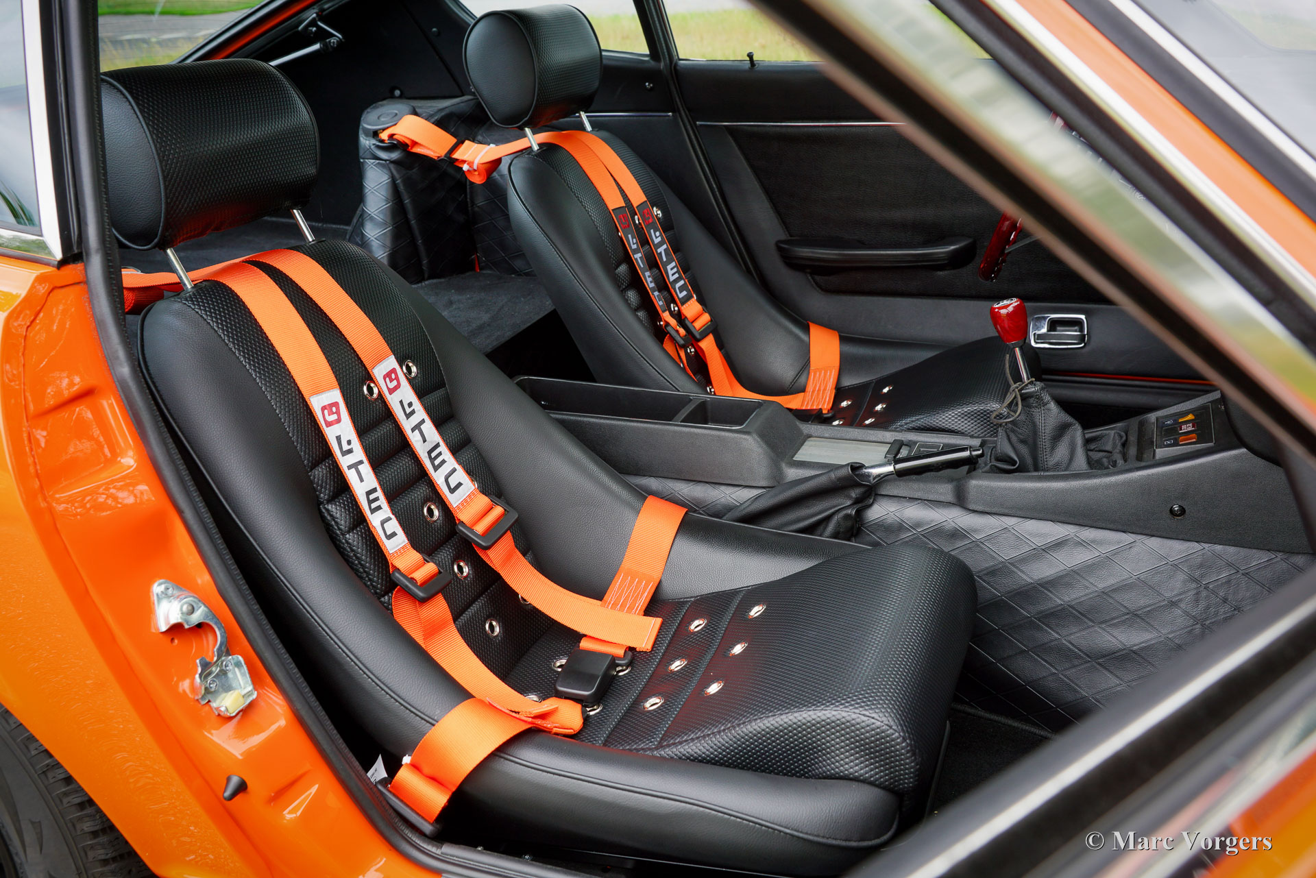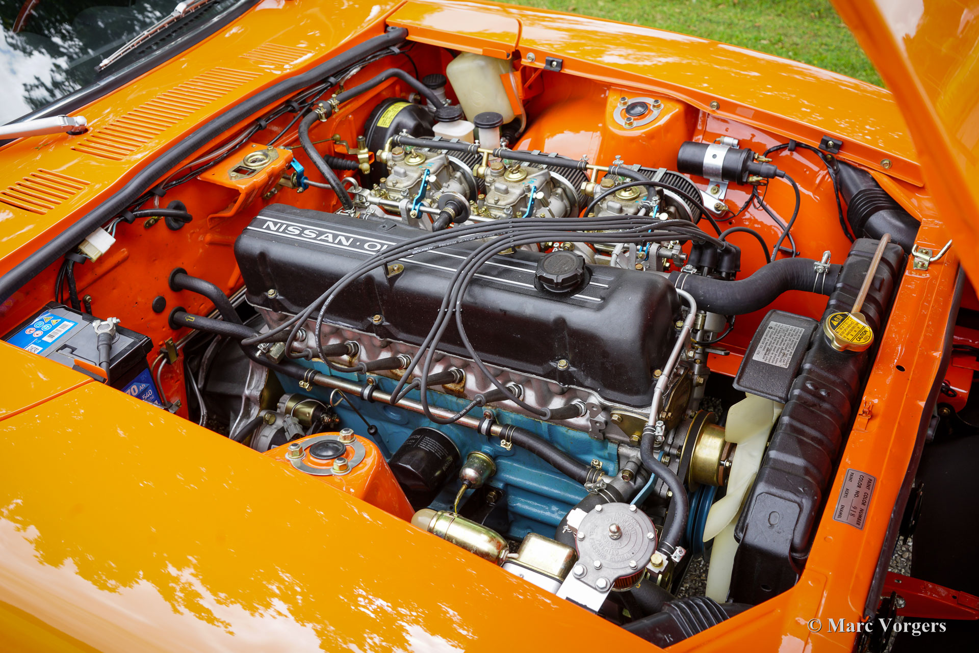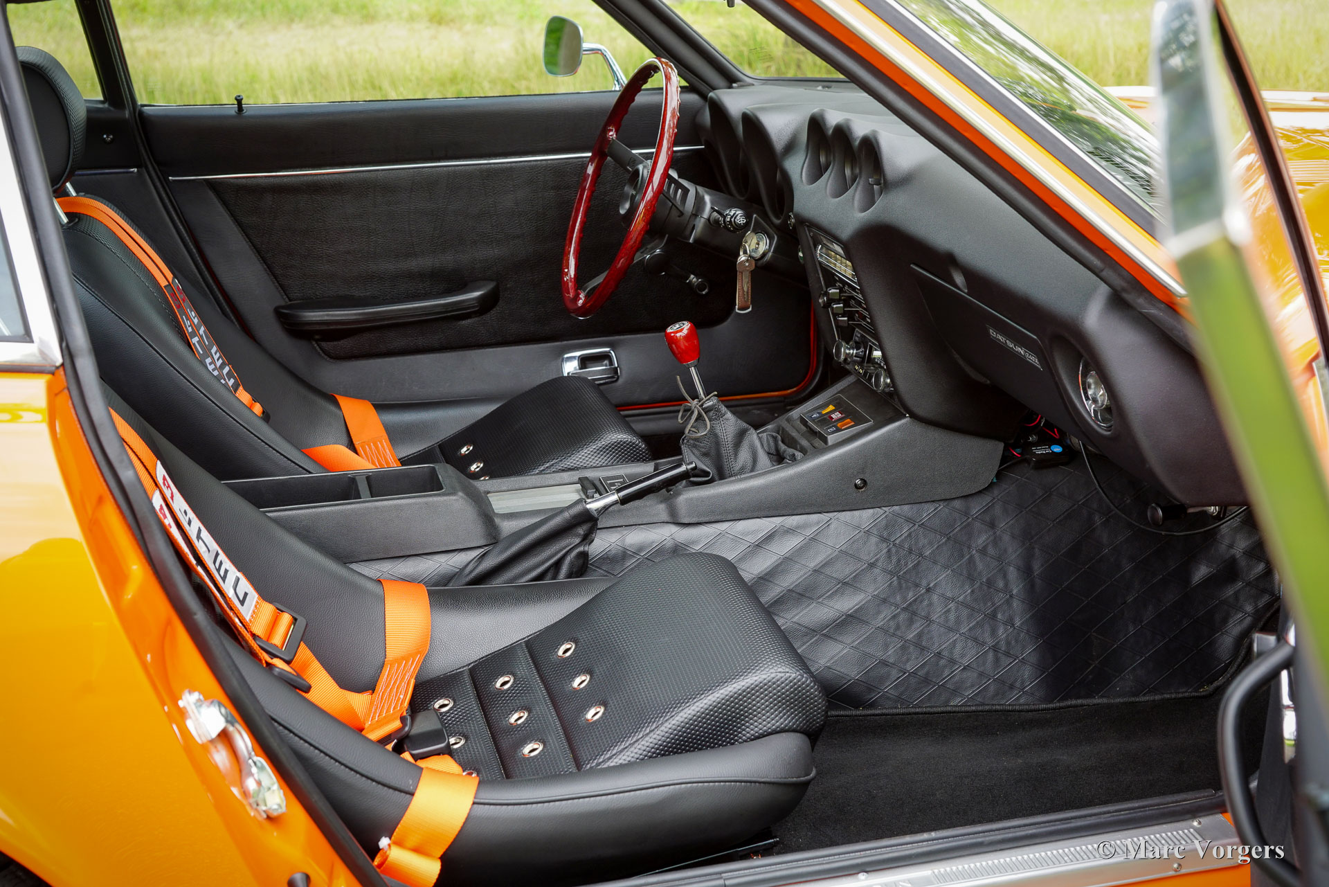 Datsun 240Z, année 1973. Couleur extérieure orange 918 associée à un intérieur noir et à des jantes alliage noires style GB. Cette magnifique et emblématique Datsun 240Z fut vendue neuve en Californie, aux États-Unis. En 2016, elle a été importée aux Pays-Bas. Entre 2017 et 2018, elle a bénéficié d'une restauration complète et impeccable par un spécialiste Datsun. Cette Californienne, exempte de rouille, fut restaurée selon les spécifications d'origine. Aucun effort n'a été épargné pour atteindre la perfection. La carrosserie fut repeinte à neuf (tous les panneaux d'origine et un ajustement parfait !) et présente les points de soudure d'origine. L'ensemble fut restauré et révisé. Un reportage photo détaillé des travaux est disponible, ainsi qu'un dossier avec les factures de restauration. Quelques améliorations furent apportées lors de la restauration. Une boîte de vitesses à cinq rapports, trois carburateurs Weber à double starter, une direction assistée, des sièges baquets d'époque, des harnais de sécurité à quatre points et un échappement sport furent ajoutés pour une expérience de conduite optimale. De plus, cette magnifique machine est chaussée de jantes alliage noires style GB chaussées de pneus Vredestein 185/70 de 14 pouces. Cette Datsun 240Z est en superbe état de TOP, et elle se conduit et se comporte parfaitement. Le son de l'échappement « six cylindres en ligne » est magnifique ! Il sera très difficile de trouver une autre Datsun 240Z restaurée en parfait état. C'est l'icône automobile japonaise, appréciée par de nombreux passionnés du monde entier. Une voiture de collection très désirable, à vous de jouer.