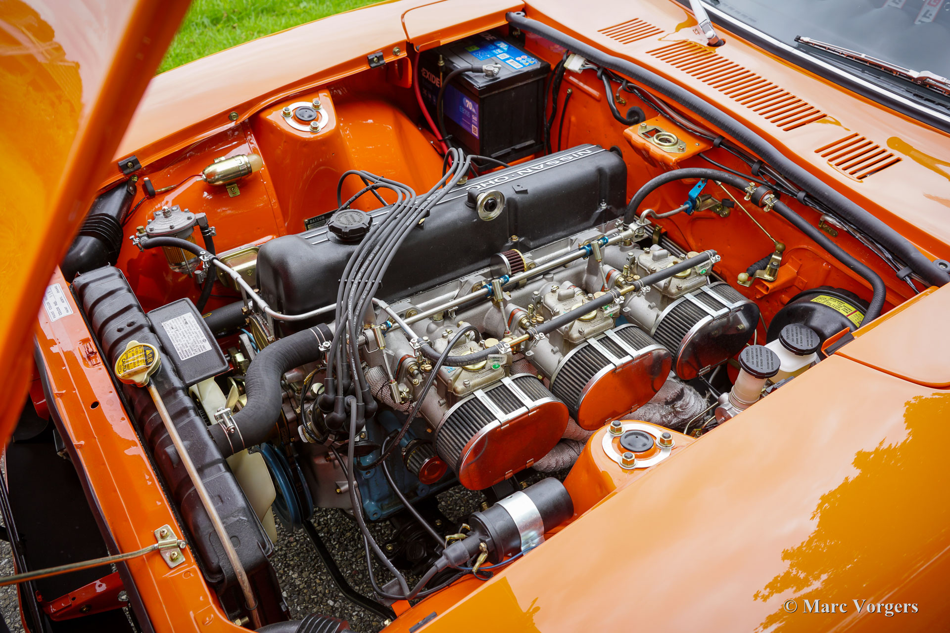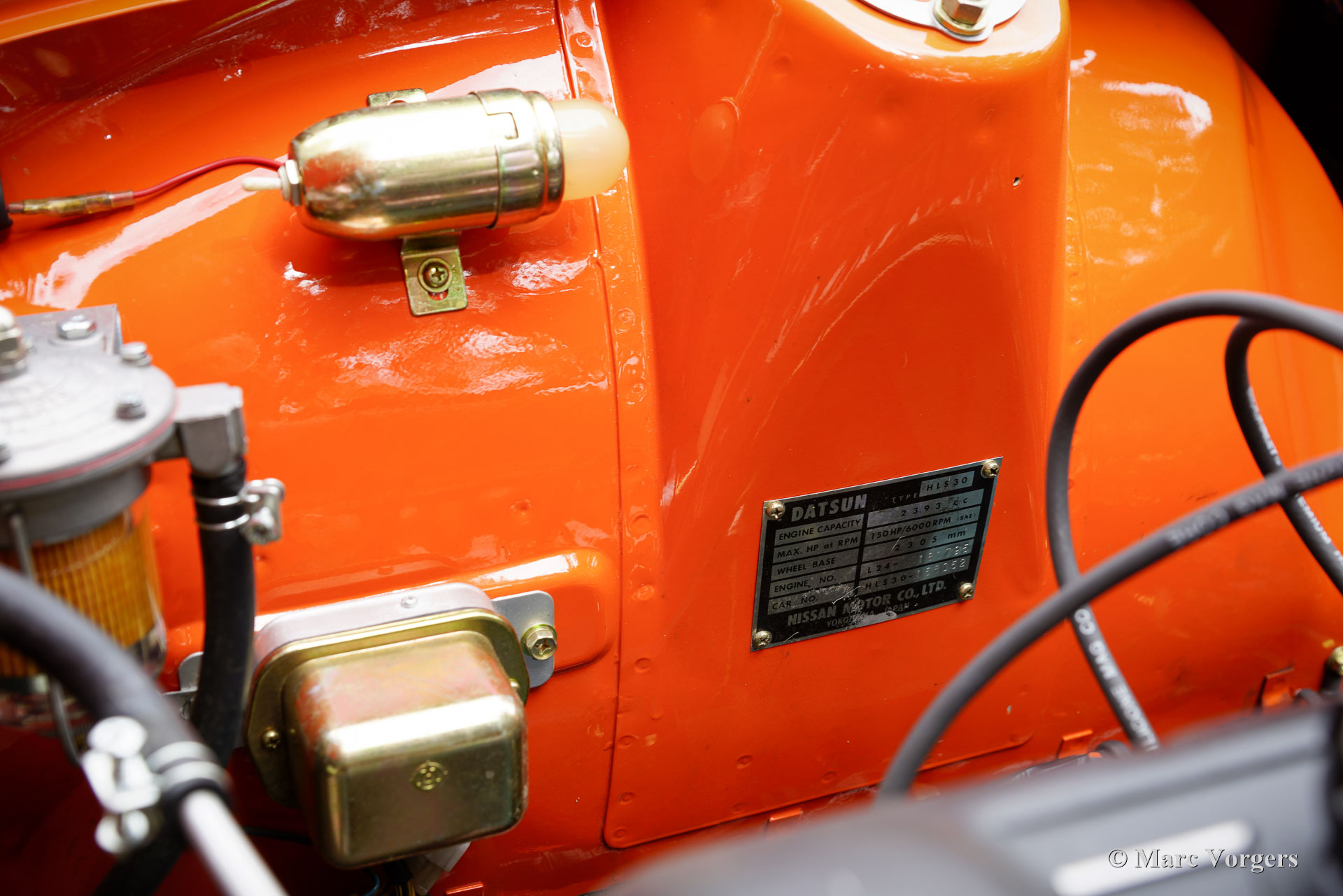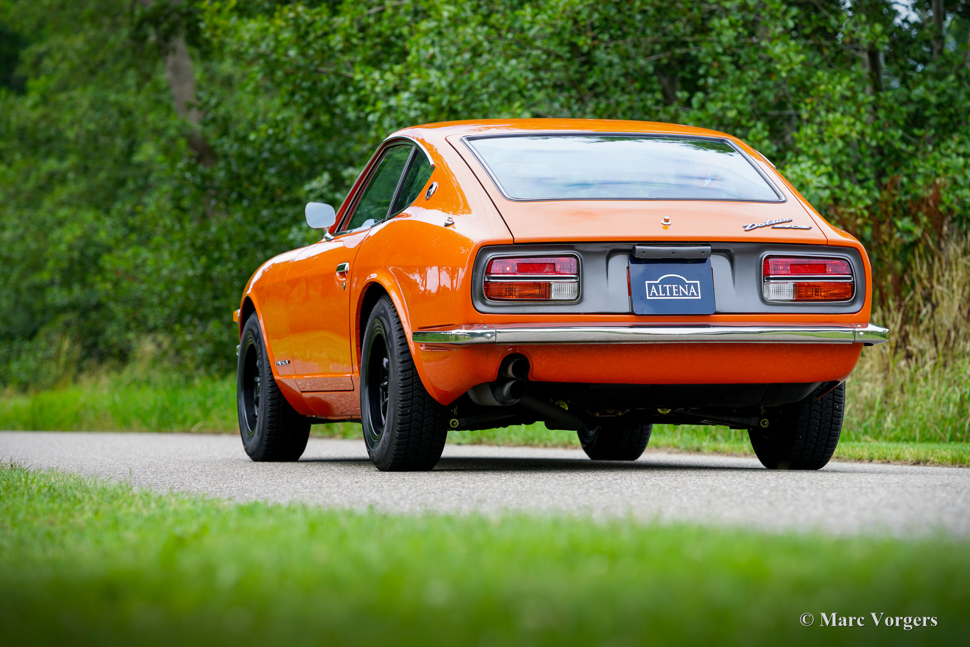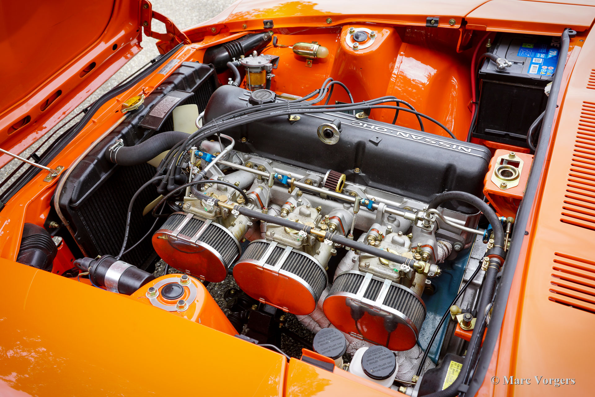 Datsun 240Z, année 1973. Couleur extérieure orange 918 associée à un intérieur noir et à des jantes alliage noires style GB. Cette magnifique et emblématique Datsun 240Z fut vendue neuve en Californie, aux États-Unis. En 2016, elle a été importée aux Pays-Bas. Entre 2017 et 2018, elle a bénéficié d'une restauration complète et impeccable par un spécialiste Datsun. Cette Californienne, exempte de rouille, fut restaurée selon les spécifications d'origine. Aucun effort n'a été épargné pour atteindre la perfection. La carrosserie fut repeinte à neuf (tous les panneaux d'origine et un ajustement parfait !) et présente les points de soudure d'origine. L'ensemble fut restauré et révisé. Un reportage photo détaillé des travaux est disponible, ainsi qu'un dossier avec les factures de restauration. Quelques améliorations furent apportées lors de la restauration. Une boîte de vitesses à cinq rapports, trois carburateurs Weber à double starter, une direction assistée, des sièges baquets d'époque, des harnais de sécurité à quatre points et un échappement sport furent ajoutés pour une expérience de conduite optimale. De plus, cette magnifique machine est chaussée de jantes alliage noires style GB chaussées de pneus Vredestein 185/70 de 14 pouces. Cette Datsun 240Z est en superbe état de TOP, et elle se conduit et se comporte parfaitement. Le son de l'échappement « six cylindres en ligne » est magnifique ! Il sera très difficile de trouver une autre Datsun 240Z restaurée en parfait état. C'est l'icône automobile japonaise, appréciée par de nombreux passionnés du monde entier. Une voiture de collection très désirable, à vous de jouer.