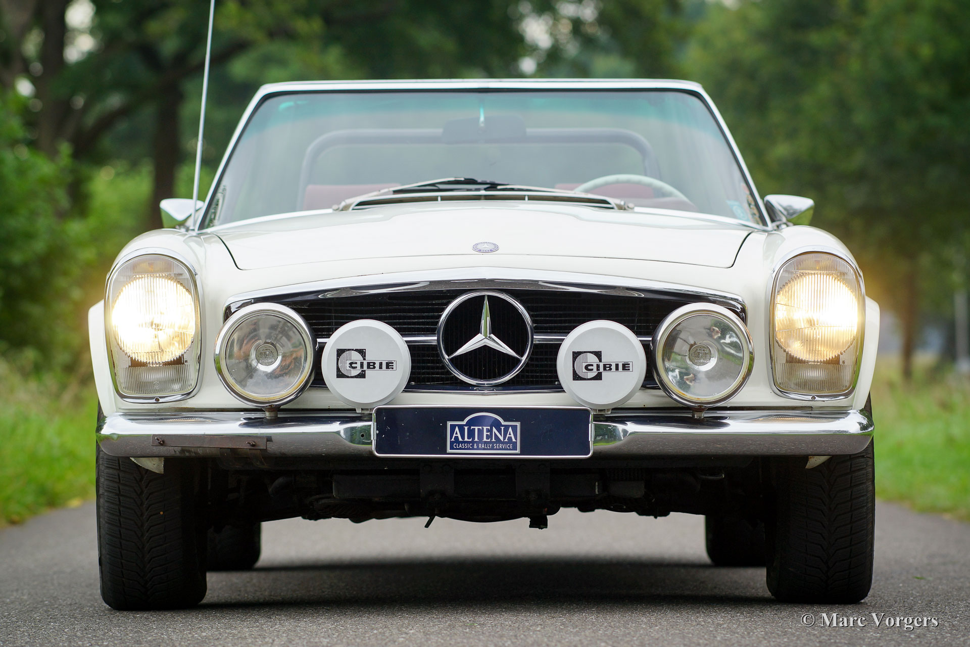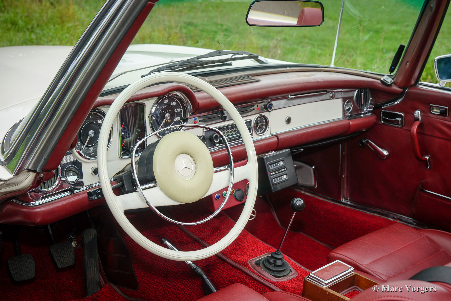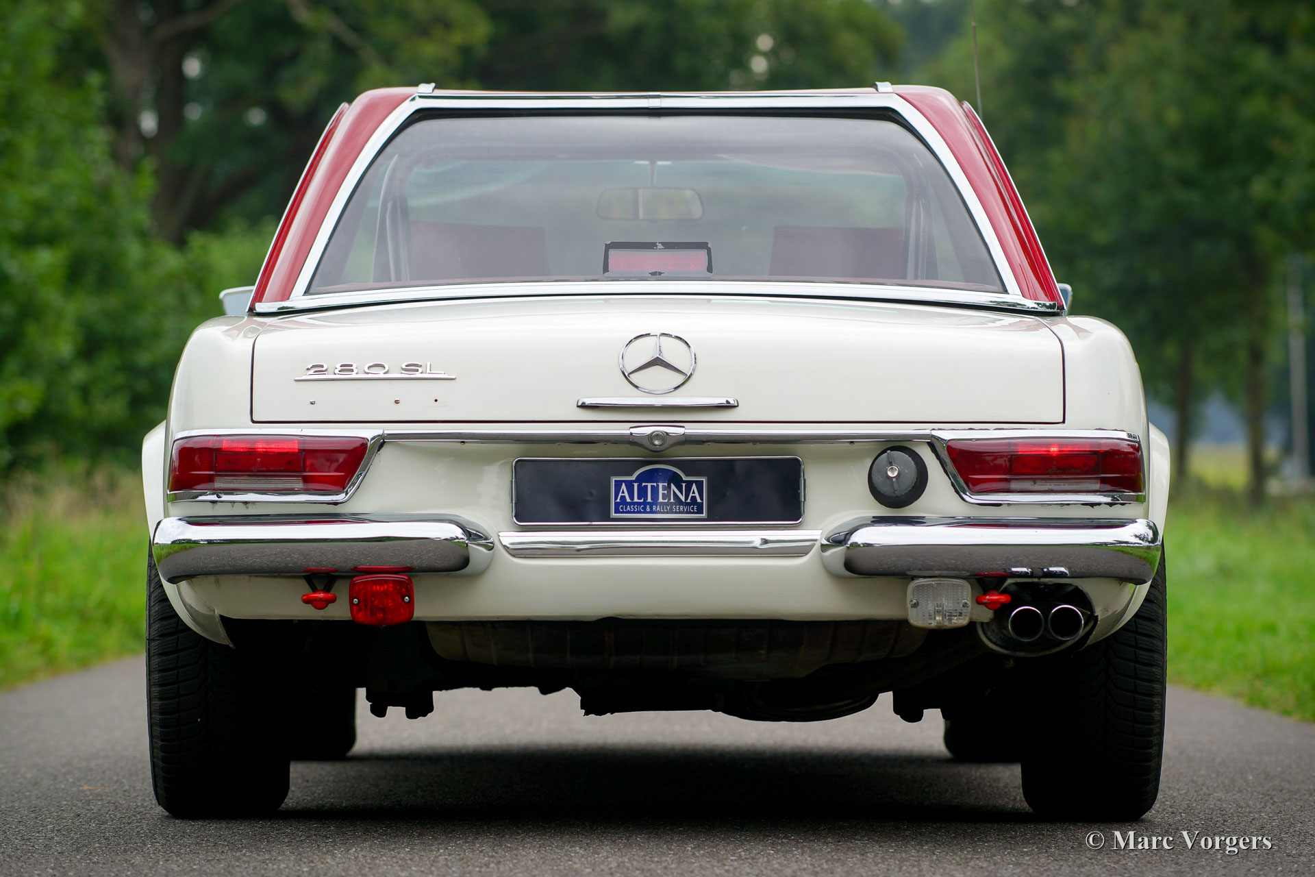 Mercedes-Benz 280 SL 'Pagode' (W113), année 1968. Numéro de châssis 113.044-120033XX. Couleur blanc avec un intérieur en cuir rouge et tapis rouge. Capot mohair noir et ‘hard-top’ rouge foncé original. Cette belle Mercedes 280 SL fut importé aux Pays-Bas en année 1999. Depuis 2008, la voiture fut entretenue dans les ateliers du Altena Classic Service. Toutes les factures du service sont présentes, ainsi que toutes les manuels d'origine. Ce 280 SL est en bon à très bon avec certains signes d'utilisation. La voiture fut légèrement modifiée (éclairage supplémentaire et intérieur) pour le rallye historique et la voiture conduit parfait. Au cours des années la voiture participé au «Tulip Rallye» dans les années 2011 jusqu'en 2017! La Mercedes vient de faire l'objet d'un service étendu afin que la voiture soit prête pour toute aventure ! La voiture dispose de jantes en alliage d'aluminium originales, d'autres feux de brouillard et de spot à l'avant, feu antibrouillard à l'arrière, une barre de roulement personnalisée, une GTI Rally-Twin, excellents sièges de sport, harnais de sécurité à 4 points, deux douilles 12V sous le tableau de bord et une radio Becker classique. Les sièges en cuir rouge d'origine sont également disponibles, la voiture peut être facilement retournée à l'état tout original.