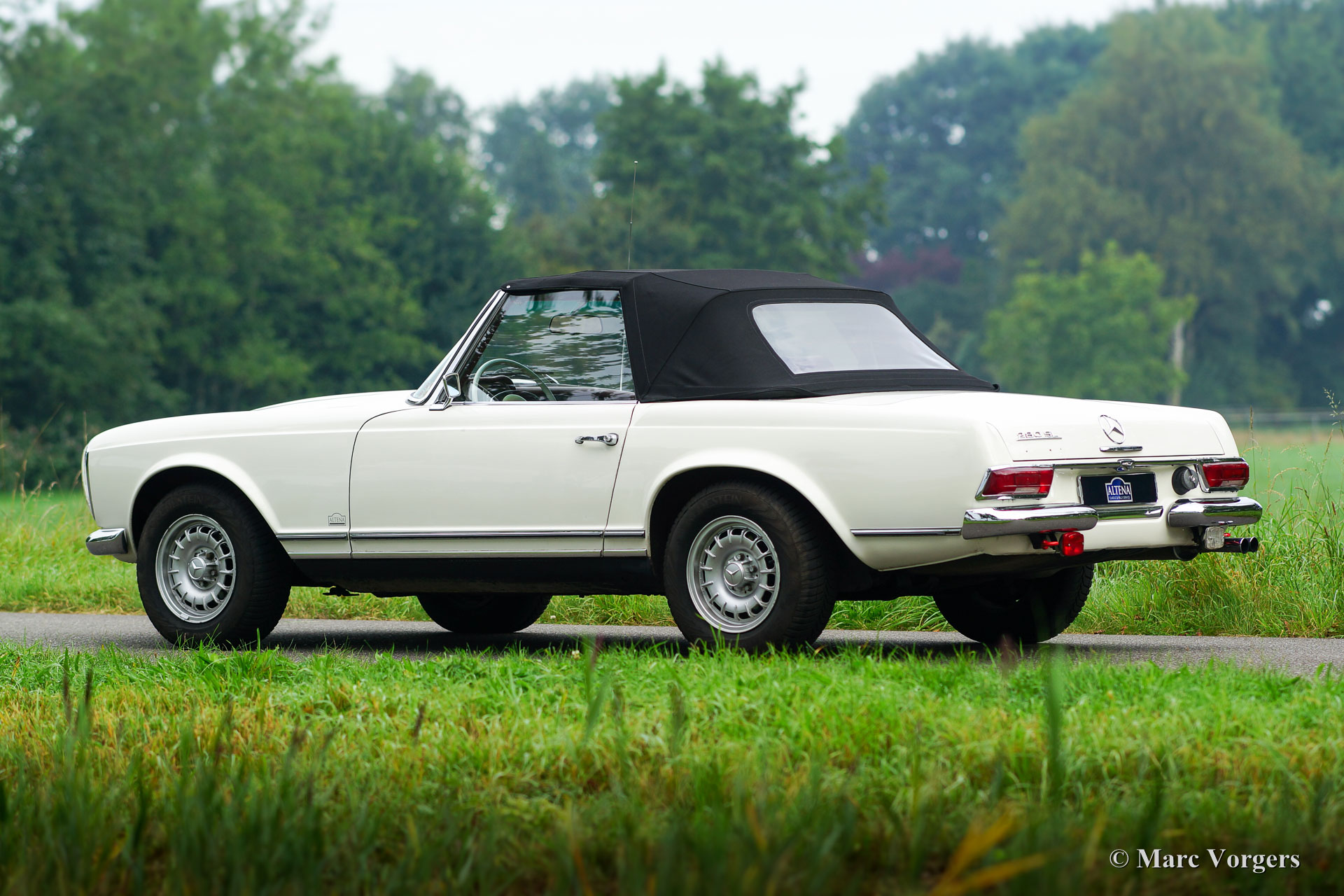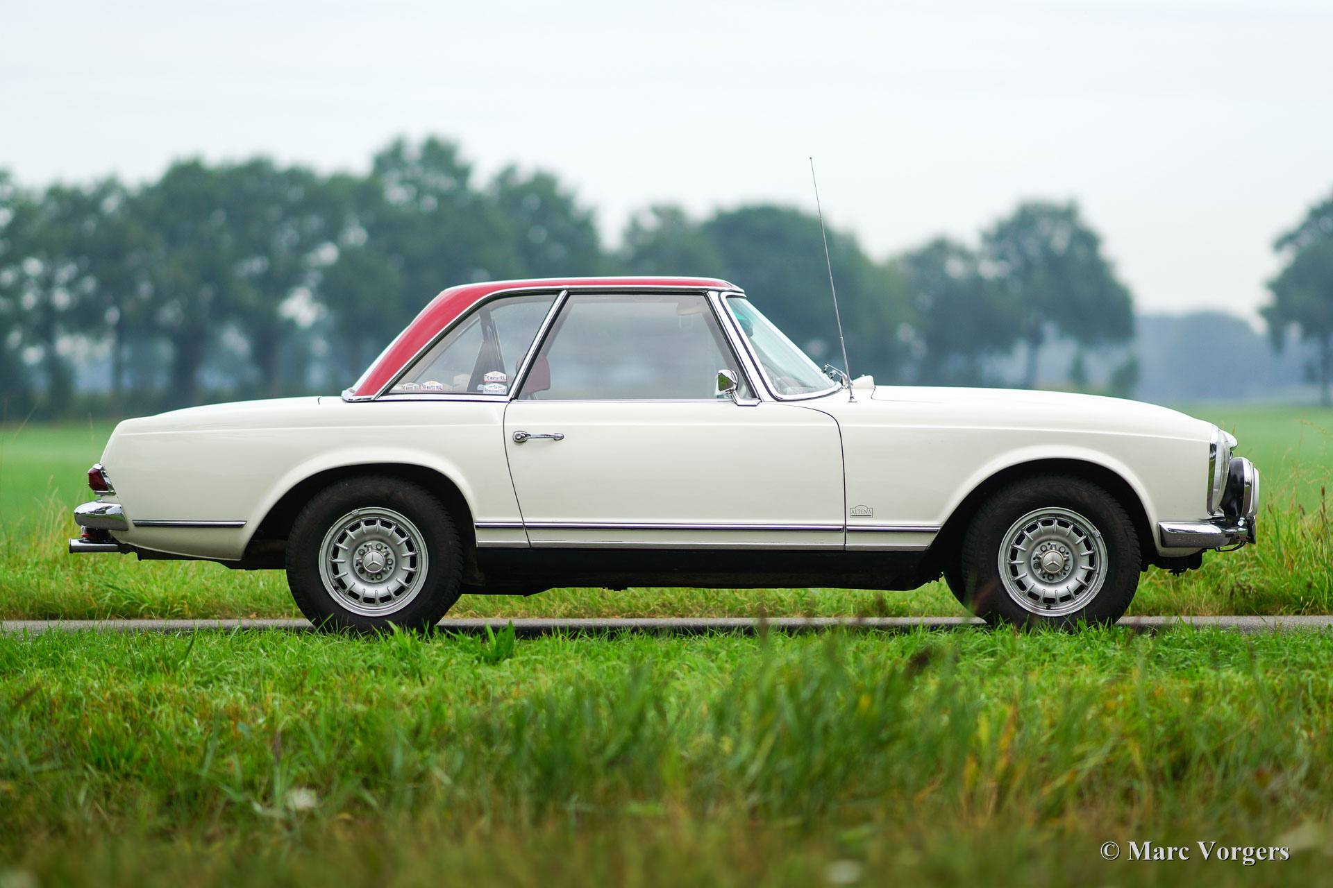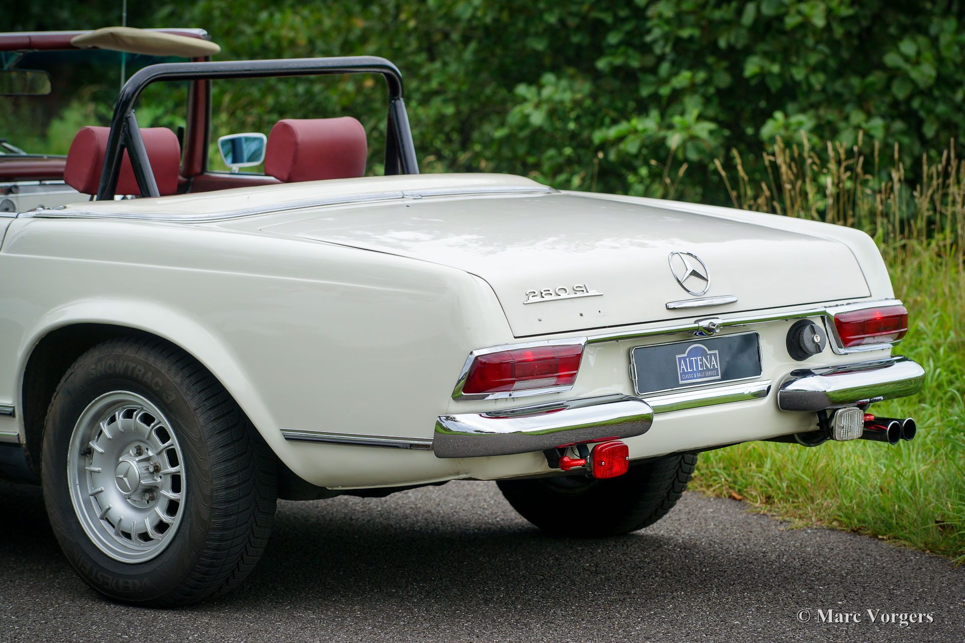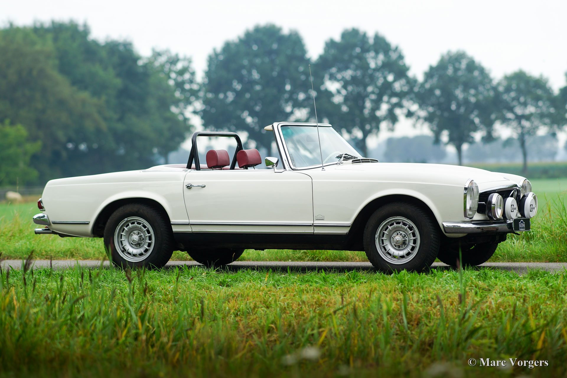 Mercedes-Benz 280 SL 'Pagode' (W113), année 1968. Numéro de châssis 113.044-120033XX. Couleur blanc avec un intérieur en cuir rouge et tapis rouge. Capot mohair noir et ‘hard-top’ rouge foncé original. Cette belle Mercedes 280 SL fut importé aux Pays-Bas en année 1999. Depuis 2008, la voiture fut entretenue dans les ateliers du Altena Classic Service. Toutes les factures du service sont présentes, ainsi que toutes les manuels d'origine. Ce 280 SL est en bon à très bon avec certains signes d'utilisation. La voiture fut légèrement modifiée (éclairage supplémentaire et intérieur) pour le rallye historique et la voiture conduit parfait. Au cours des années la voiture participé au «Tulip Rallye» dans les années 2011 jusqu'en 2017! La Mercedes vient de faire l'objet d'un service étendu afin que la voiture soit prête pour toute aventure ! La voiture dispose de jantes en alliage d'aluminium originales, d'autres feux de brouillard et de spot à l'avant, feu antibrouillard à l'arrière, une barre de roulement personnalisée, une GTI Rally-Twin, excellents sièges de sport, harnais de sécurité à 4 points, deux douilles 12V sous le tableau de bord et une radio Becker classique. Les sièges en cuir rouge d'origine sont également disponibles, la voiture peut être facilement retournée à l'état tout original.