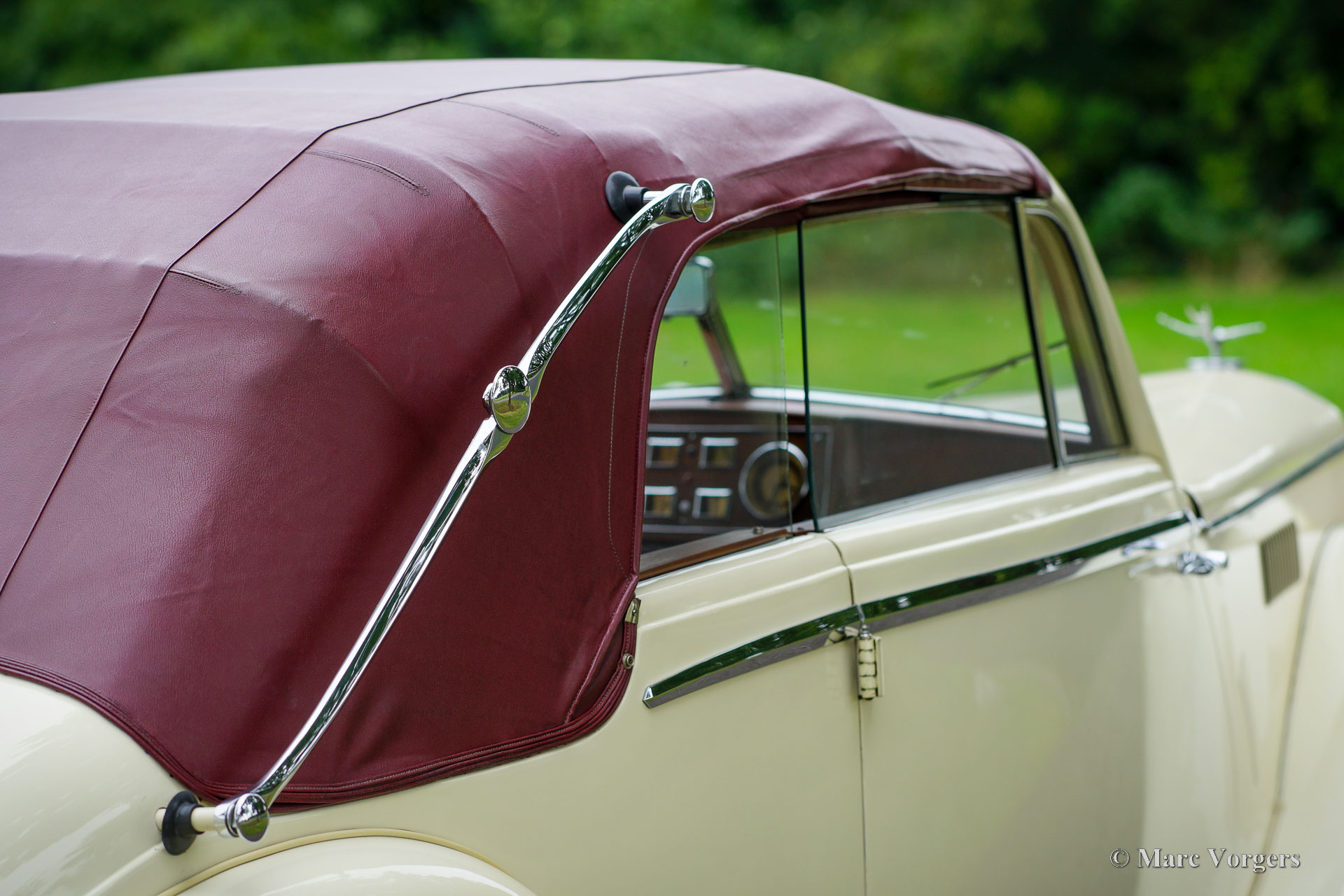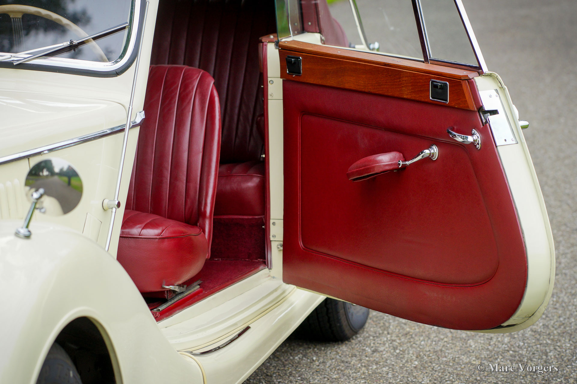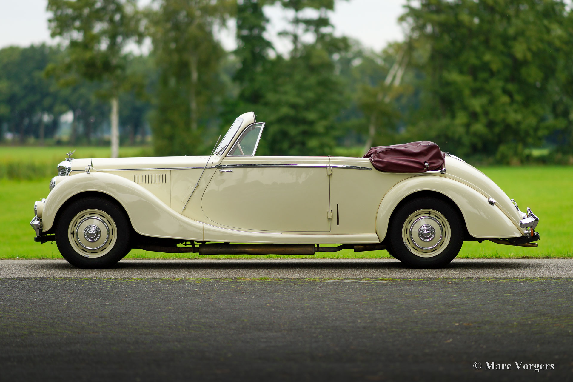 Riley RMD Cabriolet, année 1950. Couleur blanc crème combinée à un intérieur en cuir rouge foncé et un tapis rouge. Capot en vinyle rouge foncé avec garniture de toit marron clair et couvercle de capot en vinyle rouge foncé. Ce fantastique cabriolet Riley RMD avec conduite à gauche fut importé aux Pays-Bas en 1994. Depuis 2016, la voiture fait partie d'une collection de voitures classiques. La voiture a reçu beaucoup d'attention et de soin au fil des ans, l'automobile est dans un état très bon à excellent ! Le propriétaire a conduit la voiture régulièrement, ce cabriolet Riley RMD roule, sonne et se sent parfaitement. La voiture montre tous les détails d'origine et est équipée d'un autoradio d'origine des années 1950. Il s'agit d'un cabriolet britannique très désirable qui offre amplement d'espace pour quatre personnes. Un exemple fantastique pour le passionné et le collectionneur.