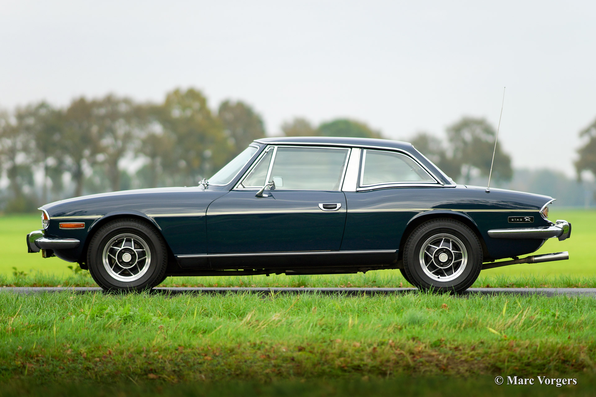 The Triumph Stag was presented in the year 1970. The Stag was not the successor of the famous TR range but an entirely new development for the important American market. In the late 1960'ies the safety of convertible models was questioned. For a while it seemed that convertibles and roadster would be banned. The Triumph Stag was designed with a sturdy, T-shape, roll over bar and the Triumph TR 7 was presented as a closed coupe for this reason. Like the TR 4, the Spitfire and many other Triumph models, the Stag was designed by the Italian Michelotti. De Stag was designed as a spacious and luxurious 2+2 touring convertible with a comfortable interior and safety seats. That was not all, Triumph even developed a brand new 3 Litre V8 engine for the Stag! This was quite strange because their British Leyland 'partner' Rover had the ideal V8 engine which was used for the Rover P5B since 1967. The Triumph Stag featured independent suspension and disc brakes all round. Power steering was a standard item. In the USA most Stags were ordered with an automatic gearbox. The story goes that designer Michelotti was 'not very happy' with the safety roll over bar. In his opinion the Stag would have been much better looking without this item. For that Michelotti invested in the design of the steel hard top which compliments the design of the Stag for sure!