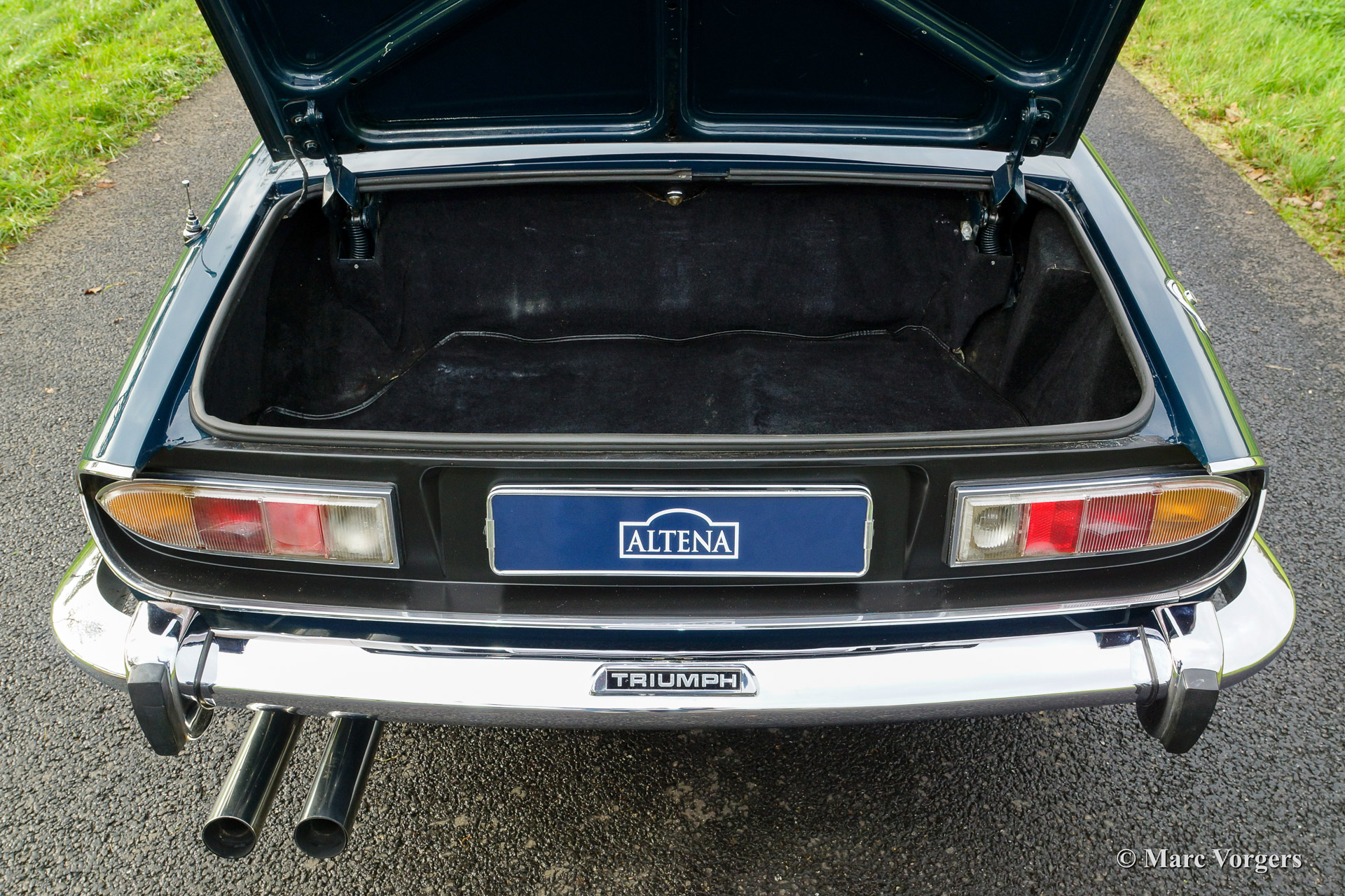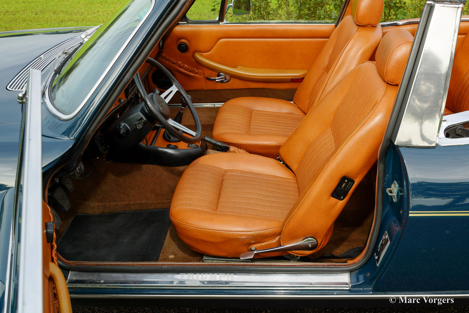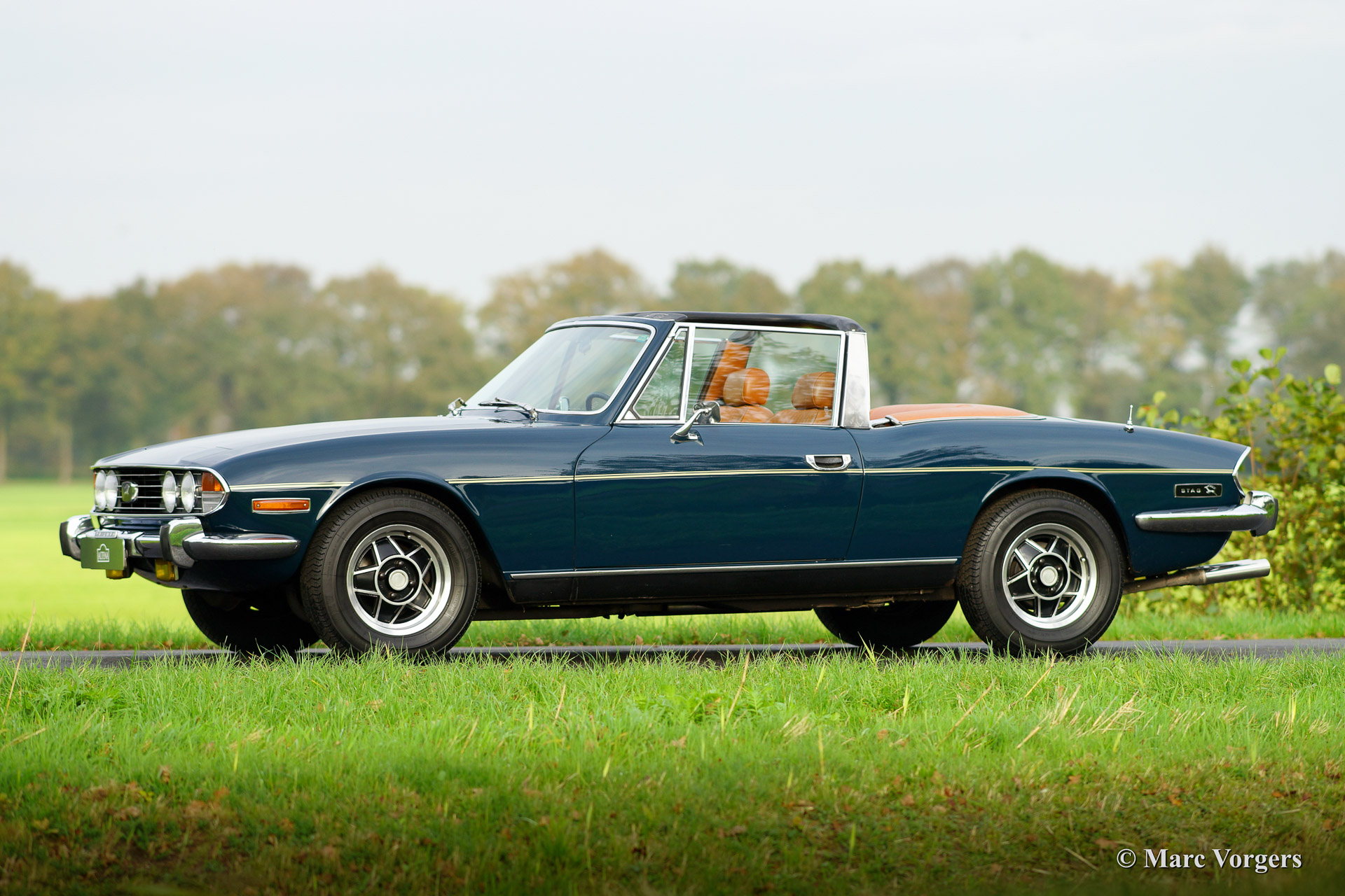 Triumph Stag, year 1974. Chassis number LD 3148X XX. Body colour blue with a cognac colour leatherette interior. This beautiful Triumph Stag was sold new in the Netherlands. The automobile is in excellent original condition! From new the car has known only three cautious owners who kept the car in fantastic shape. The body work, the interior, the engine room, the boot and the underside of the car look beautifully original with just slight traces of use. The Triumph V8 engine runs and sounds perfect and the car handles and drives superbly. This Stag features a manual gearbox (rare) and power steering. The cooling system has been up rated to improve the cooling capacity. The expansion tank was placed higher up, a high capacity radiator was fitted as was an electric Kenlow cooling fan. Furthermore the car sports electronic ignition (Lumenition) and a Smiths oil pressure meter (dashboard accessory). This fantastic Triumph Stag is complete with original hard top in body colour. The hard top sports a heated rear window! This is a wonderful and very original Triumph Stag, you will be hard pressed to find another specimen in this condition!
