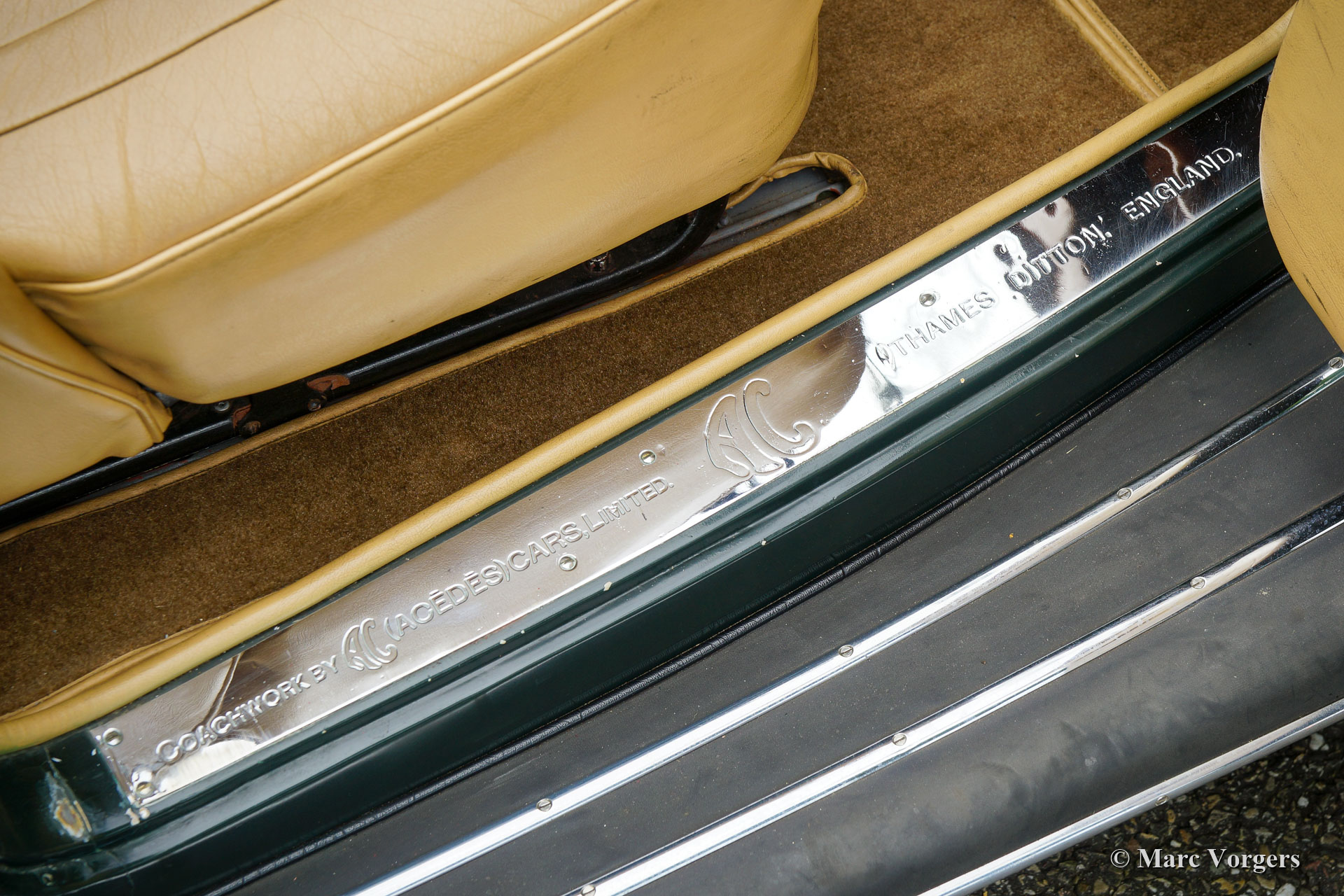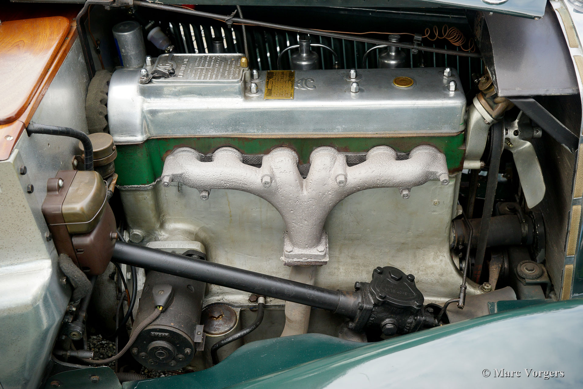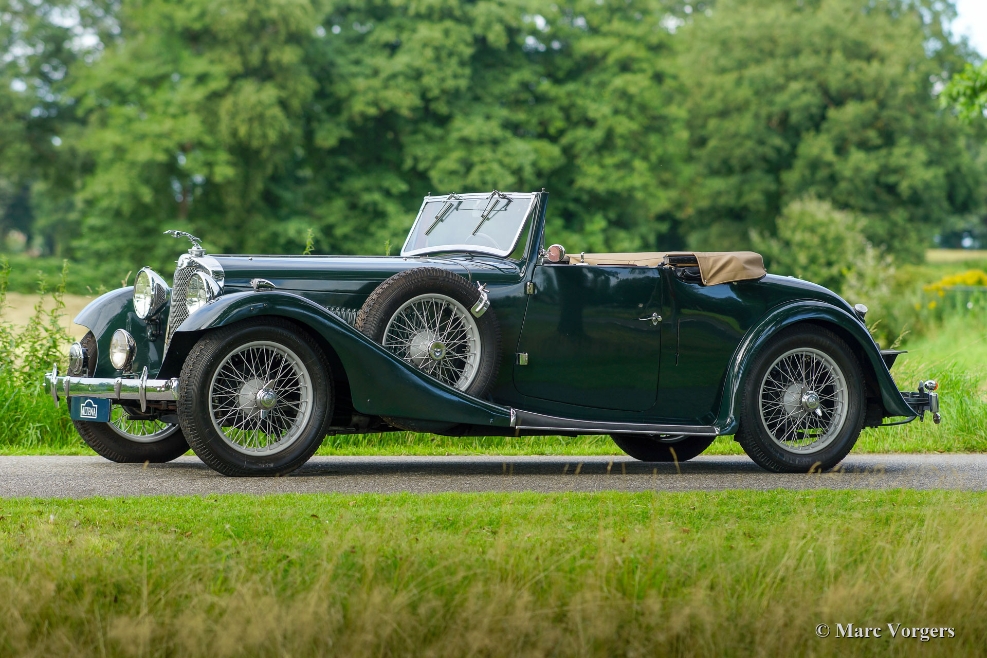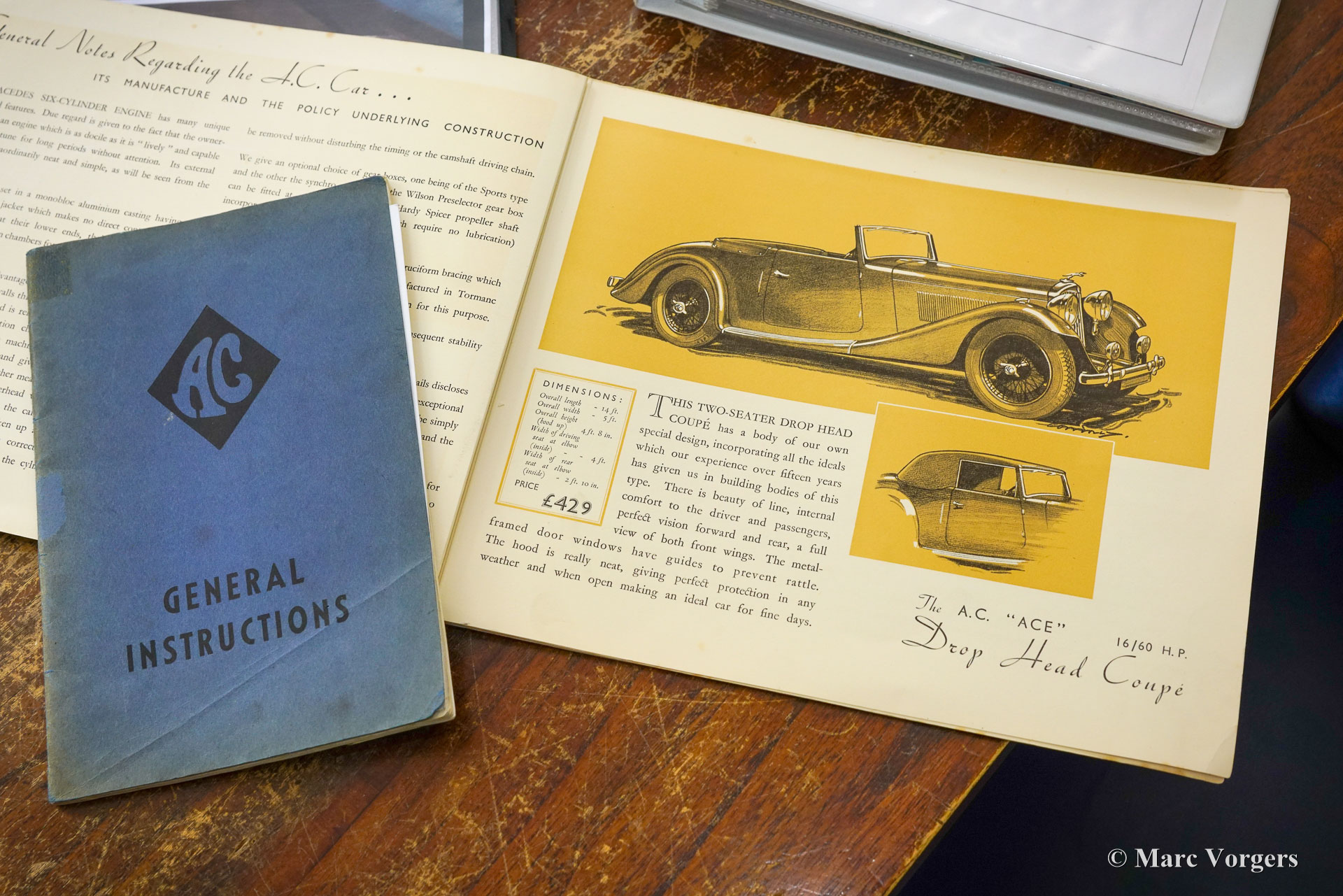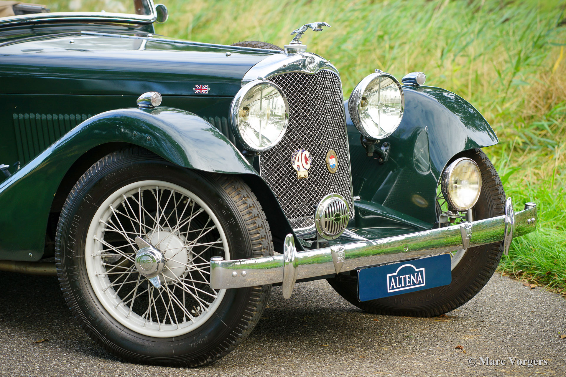 AC (Acédès) 16/66 Drophead Coupé, année 1935. Numéro de châssis L34X, numéro de moteur UBS.29X. Immatriculation d'origine au Royaume-Uni : DPC918. Couleur « British Racing Green » foncé combinée avec un intérieur en cuir beige et un tapis marron clair garni de bords beiges. La voiture est dotée d'un capot en vinyle noir et d'un couvre-caisse en mohair marron clair. Cette rare AC 16/66 DHC fut vendue neuve au Royaume-Uni. L'automobile fut exportée aux Pays-Bas en l'an 2000 où elle avait connu un propriétaire jusqu'en 2019. La voiture nous est connue, et en service dans notre atelier, depuis 2019. Cette AC 16/66 DHC est livrée avec un gros dossier historique de Nouveau. Photos de la voiture à l'état neuf, montrant également le premier propriétaire et l'immatriculation d'origine. Présent est un journal de bord avec les noms de tous les propriétaires précédents et le service et les réparations qui ont été effectuées au fil des ans. Sont également présents des livres originaux d'usine, une brochure et le document Anglais original V5c. Cette magnifique AC 16/66 DHC se conduit et se manie à merveille, et la boîte de vitesses manuelle à 4 vitesses fonctionne parfaitement. Le moteur six cylindres en ligne est la même unité de 1991 cc avec arbre à cames en tête et trois S.U. carburateurs tels qu'équipés dans la voiture de sport AC Ace de 1953. L'AC 16/60 DHC est une voiture pour deux personnes dotées d'un « Dickey Seat » dans le coffre offrant deux sièges « d'urgence » supplémentaires. Cette AC rare est une voiture super originale qui montre tous les détails d'origine. L'ancienne peinture montre des signes d'âge mais est toujours très belle, une patine d'avant-guerre fantastique ! Il s'agit d'un rare AC 16/66 Drophead Coupé en super état d'origine et magnifique ! L'automobile peut être importée et admise dans n'importe quel pays du monde.