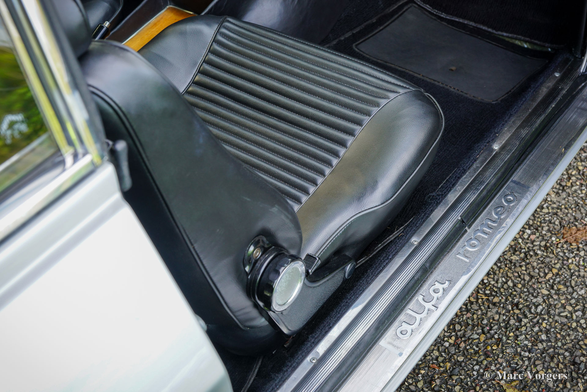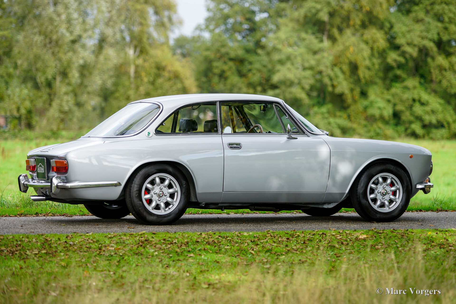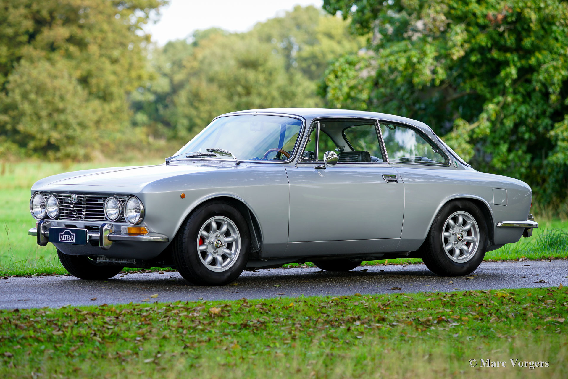 Alfa Romeo Giulia 2000 GTV « Bertone », année 1974. Numéro de châssis AR2439136, numéro de moteur 00512 – S10507. Carrosserie argent métallisé, intérieur en similicuir noir et moquette noire. L'Alfa Romeo Giulia GT (série 105), présentée pour la première fois en 1963, est un coupé aux proportions élégantes qui a contribué à forger l'identité de marque d'Alfa Romeo. Le designer Giorgetto Giugiaro n'avait que 22 ans lorsqu'il a créé ce modèle. La Giulia GT fut l'une de ses premières commandes, mais aussi la plus importante, et celle dont il était le plus fier. Cette magnifique Giulia 2000 GTV a été vendue neuve en Suède. Elle est accompagnée d'un historique complet, d'un manuel d'instructions en anglais, d'un livret de garantie et d'une carte d'entretien d'origine. La Giulia 2000 GTV est le modèle haut de gamme, équipé d'un moteur double arbre à cames de 150 ch et d'un différentiel à glissement limité sur l'essieu arrière. Avec ses freins à disque autour et sa boîte à cinq rapports, la 2000 GTV est un véritable coupé sport, dans la pure tradition des GT italiennes. La carrosserie fut restaurée en Suède et la mécanique est en excellent état. Elle conserve tous les détails d'origine, seule la suspension fut modifiée avec de nouveaux silentblocs et ressorts, et un échappement sport en acier (de série) fut installé. Sous le capot, tout semble d'origine et comme neuf ! L'intérieur est en excellent état ; nous pensons que la sellerie des sièges a été renouvelée lors de la restauration. Le tableau de bord, les compteurs, la console centrale et le ciel de toit sont tous en excellent état d'origine ! La voiture est actuellement équipée de jantes alliage GB « Minilite » de 14 pouces (option disponible sur les Giulia de la série 105 depuis plusieurs décennies) et de pneus Vredestein T-Track 2 de 185/70 14. Un jeu de quatre jantes alliage ATS est également présent, la roue de secours étant un exemplaire en acier d'origine. Rapide et agile, cette Alfa Romeo Giulia GTV 2000 est un excellent exemplaire, décliné dans une superbe combinaison de couleurs et bénéficiant d'équipements qui raviront les passionnés et les conducteurs d'Alfa Romeo sportive !