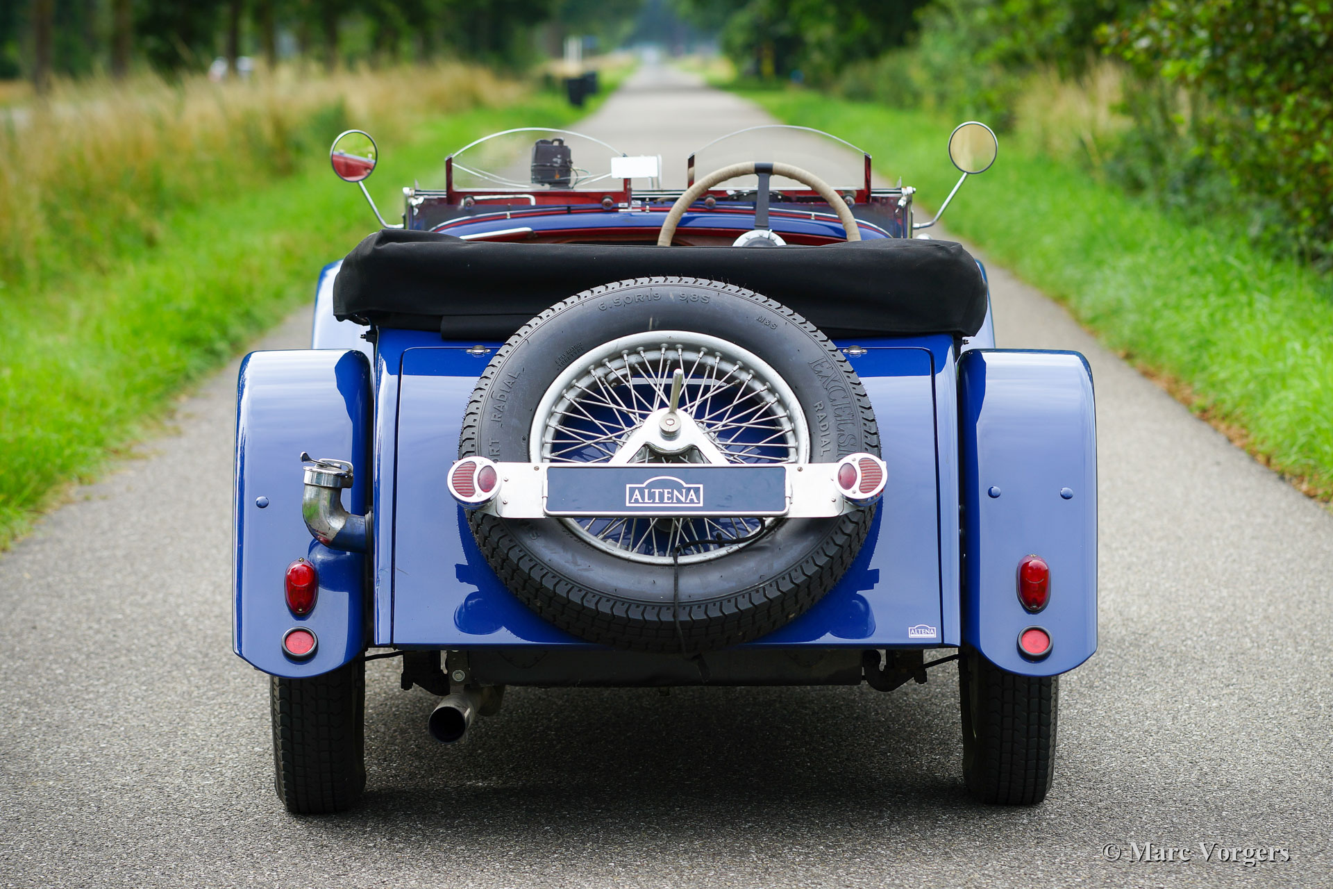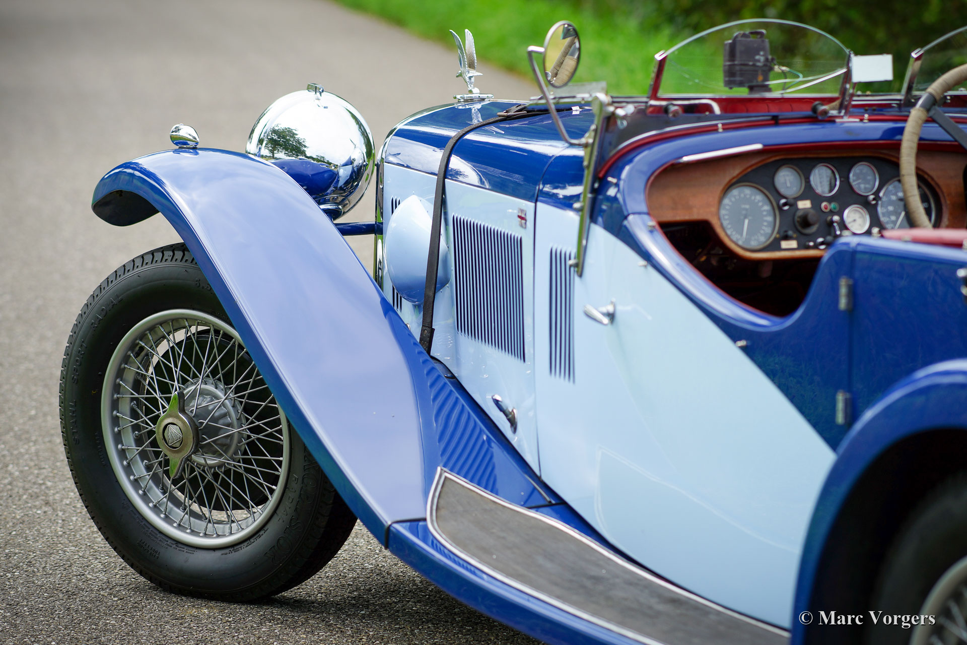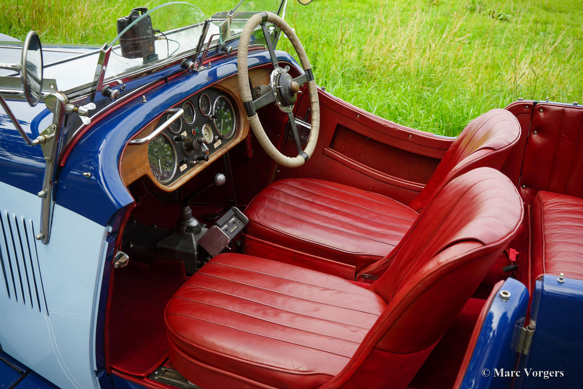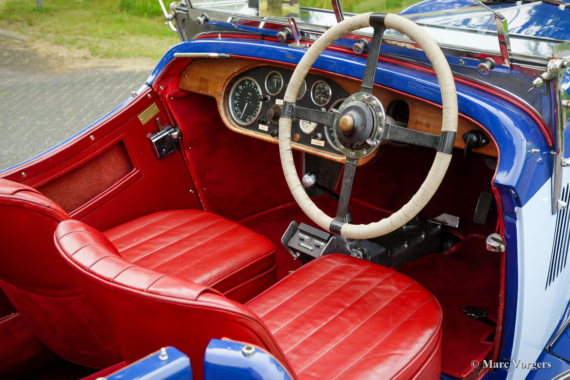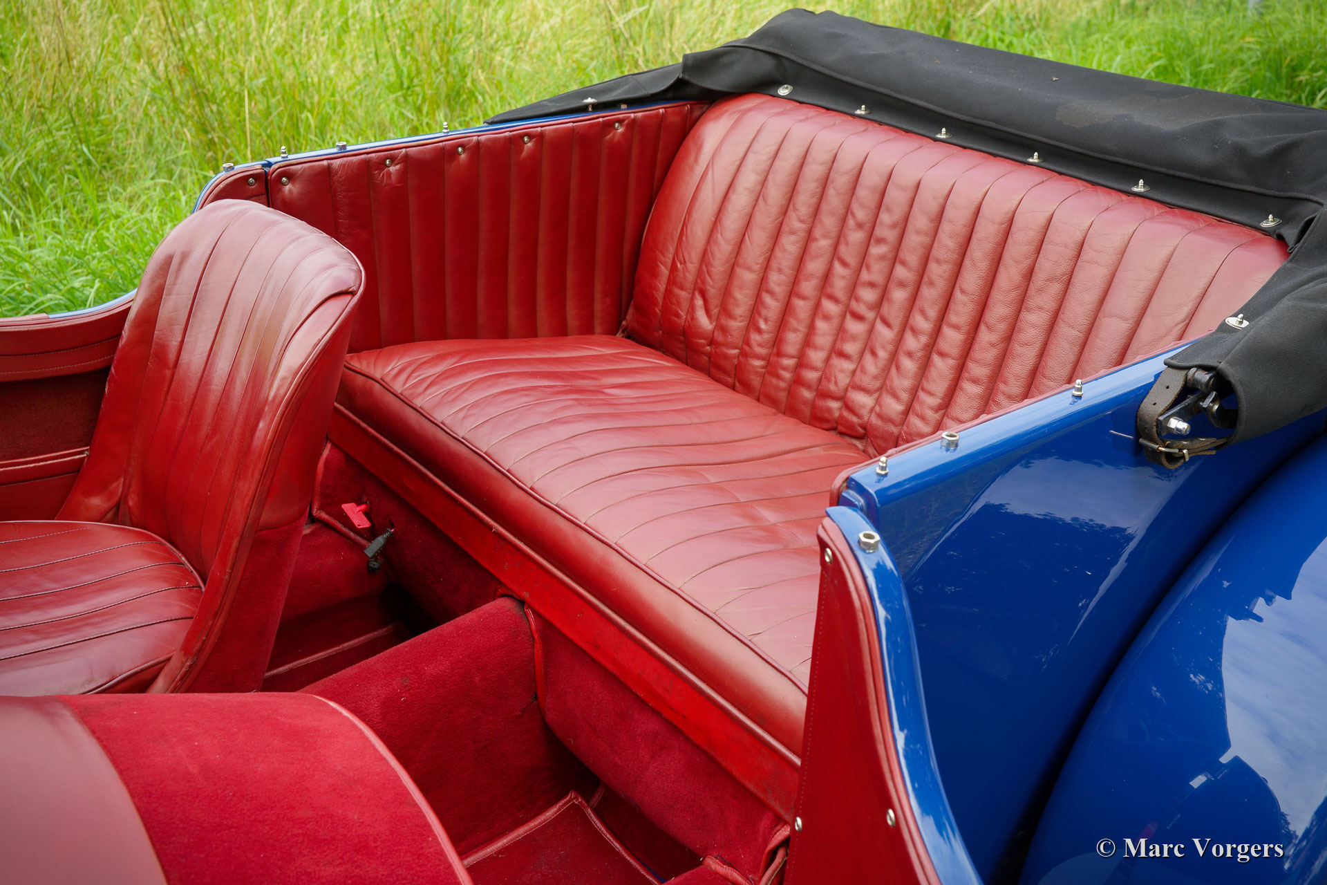 Alvis Speed 20 SA Open Tourer, année 1933. Couleur bleu bicolore associée à un intérieur en cuir rouge et à un capot noir. Cette magnifique Alvis Speed 20 SA Open Tourer fut vendue neuve en Grande-Bretagne sous le numéro AJJ 585. La voiture présente sa carrosserie originale Vanden Plas Open Tourer. Cette belle voiture est en très bon à excellent état d'origine, avec tous les détails d'origine et une fantastique patine vintage. Au fil des ans, les pièces mécaniques furent révisées (le moteur il y a quelques années) et le corps a été décapé et repeint dans le passé. Les freins et le boîtier de direction furent récemment révisés et les ressorts arrière et l'embrayage furent renouvelés. Un alternateur a également été installé. L'historique complet est connu et documenté, et tous les propriétaires précédents sont connus. La voiture a participé à plusieurs événements historiques aux Pays-Bas. Cette belle voiture est inscrite au registre Alvis et est livrée avec un manuel du propriétaire original et une photo de la voiture entre les mains de son premier propriétaire. Cette belle Alvis Speed 20 a été parfaitement entretenue dans les ateliers d’Altena Classic Service; Tout est à jour.
