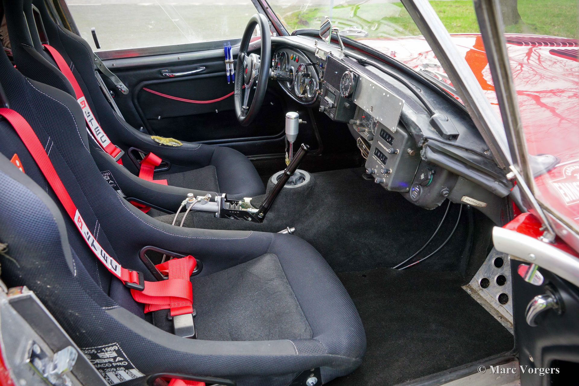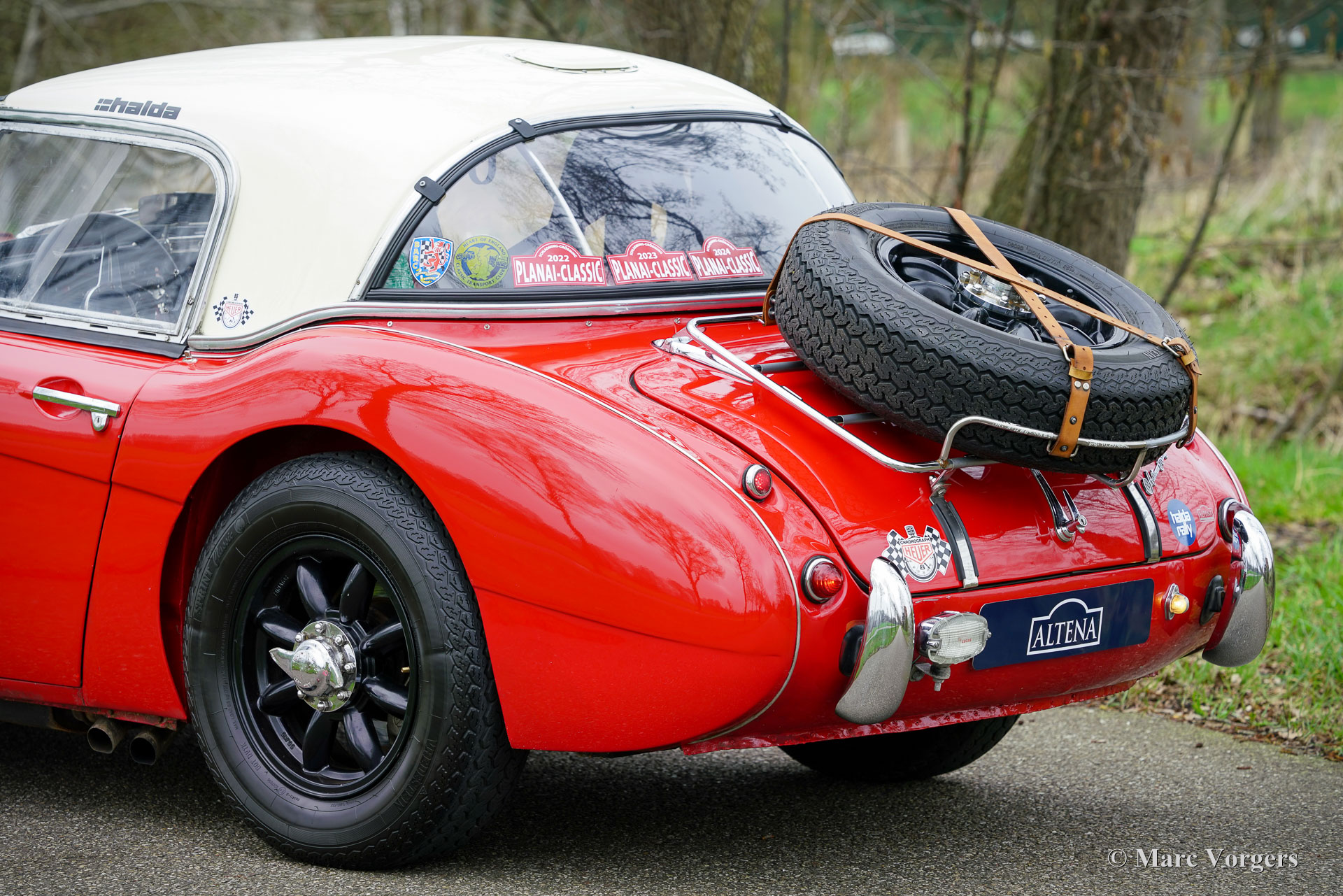 Austin Healey 100/6, année 1958. Couleur rouge avec un toit rigide blanc crème et un intérieur rallye noir/anthracite. Cette fantastique voiture de rallye Austin Healey fut entièrement et magnifiquement préparée pour le rallye par un spécialiste aux Pays-Bas. Les coûts et les efforts n'ont pas été épargnés pour créer une voiture de rallye idéale. Le moteur fut amélioré en interne, trois carburateurs furent installés, la suspension fut améliorée, le système électrique fut amélioré, des instruments de navigation furent installés, une multitude de feux de projecteur et de virage furent ajoutés à l'avant et un feu de recul à l'arrière. De plus, des roues Minilite peintes en noir sont installées et des pneus Vredestein Sprint Classic. L'Austin Healey a toujours été une voiture de course et de rallye compétitive. Ce magnifique exemplaire est très puissant, sonne superbement grâce à l'échappement latéral spécial et roule de manière impressionnante. Le nouveau propriétaire sera impressionné par les qualités sportives de cette voiture de rallye « Big Healey ». L'automobile est dans un très bon état et la voiture est prête à être appréciée par un pilote (de rallye) et un navigateur passionné. Cette voiture de rallye Austin Healey peut être engagée dans toutes les épreuves européennes de régularité (rallye) appropriées.