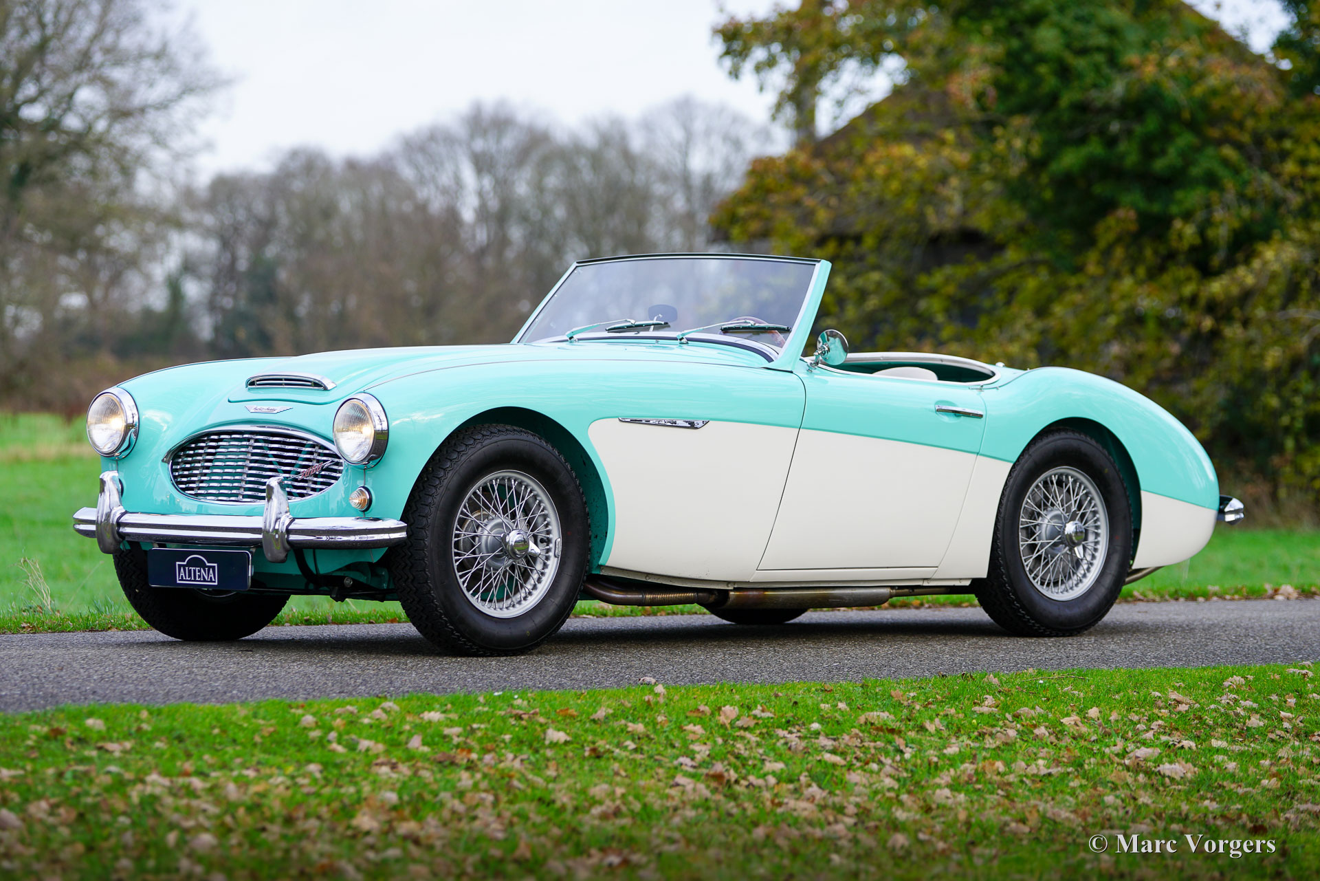 Austin Healey 3000 MK I (BN7 biplace), année 1960. Un document Heritage atteste de la concordance des numéros et des couleurs de cette Austin Healey. La carrosserie, le châssis, le moteur et la boîte de vitesses sont d'origine, et les couleurs de la carrosserie sont exactement celles d'origine, telles qu'elles étaient à sa sortie d'usine en 1960. Cette magnifique « Big Healey » est peinte en vert Floride sur blanc crème et présente un intérieur en cuir beige clair (Magnolia) avec passepoil et moquette vert bleuté. Seuls 2825 exemplaires de l'Austin Healey MK II BN7 furent produits ce qui en fait le modèle Healey rare. Ce superbe exemplaire a été importé du Texas (États-Unis) aux Pays-Bas en 2020, puis entièrement restauré selon les spécifications d'usine. Les travaux ont été achevés en 2023. Des photos d'avant restauration et des clichés illustrant le processus de restauration sont disponibles. Les factures des spécialistes sont également fournies, offrant un aperçu détaillé des révisions et des remplacements effectués. Le moteur fut révisé par l’atelier van Giersbergen, la carrosserie fut réalisée par un carrossier spécialisé, la boîte de vitesses par van Munching et les carburateurs par BCCP, tous aux Pays-Bas. Cette magnifique Austin Healey est dans un état exceptionnel et roule parfaitement. Elle est équipée de roues à rayons peintes en argent chaussées de pneus rétro 185 R15, de freins à disque à l'avant, d'un volant sport MotoLita à jante en bois, d'une capote et de vitres latérales neuves. Cette Austin Healey superbement restaurée, dans sa couleur d'origine unique, est une excellente affaire pour les passionnés et les collectionneurs. Vous ne trouverez pas d'autre exemplaire dans un état aussi impeccable à ce prix. Cette rare beauté peut être à vous !