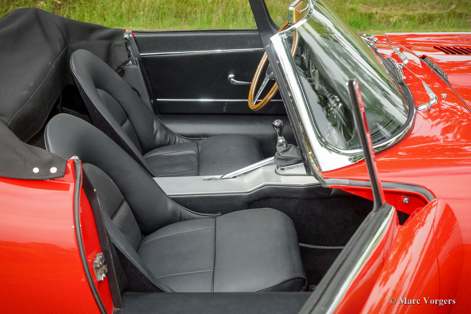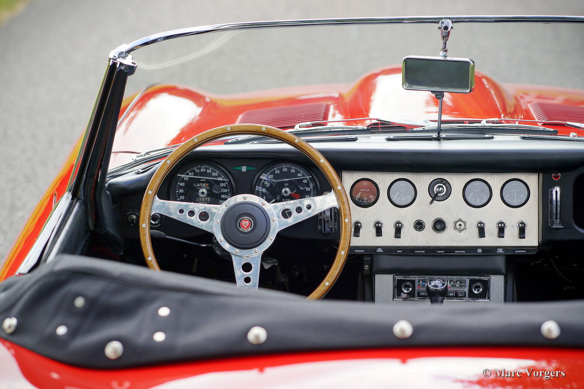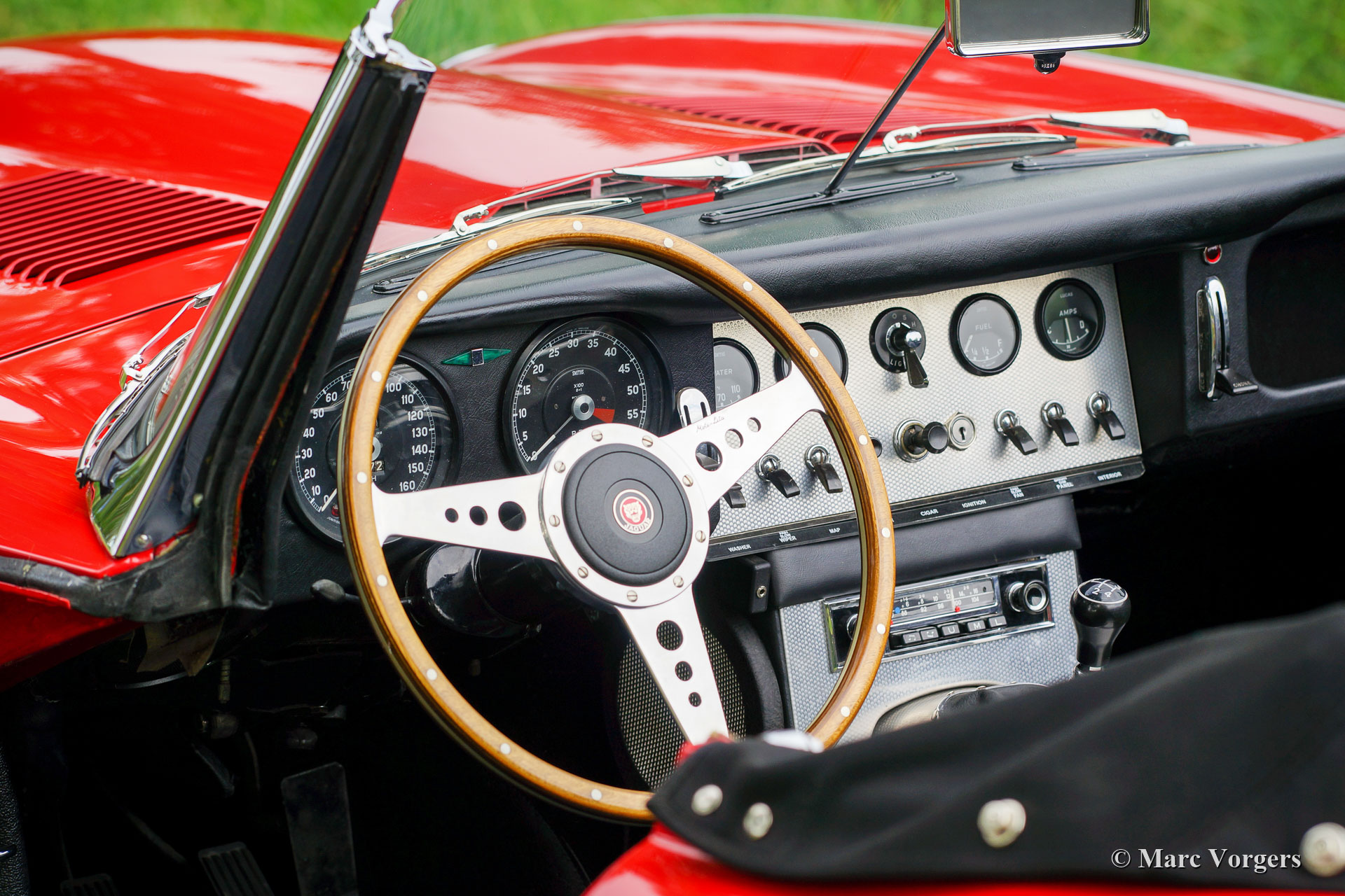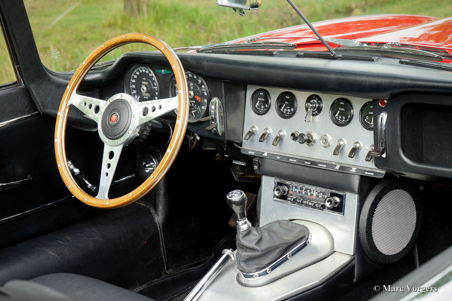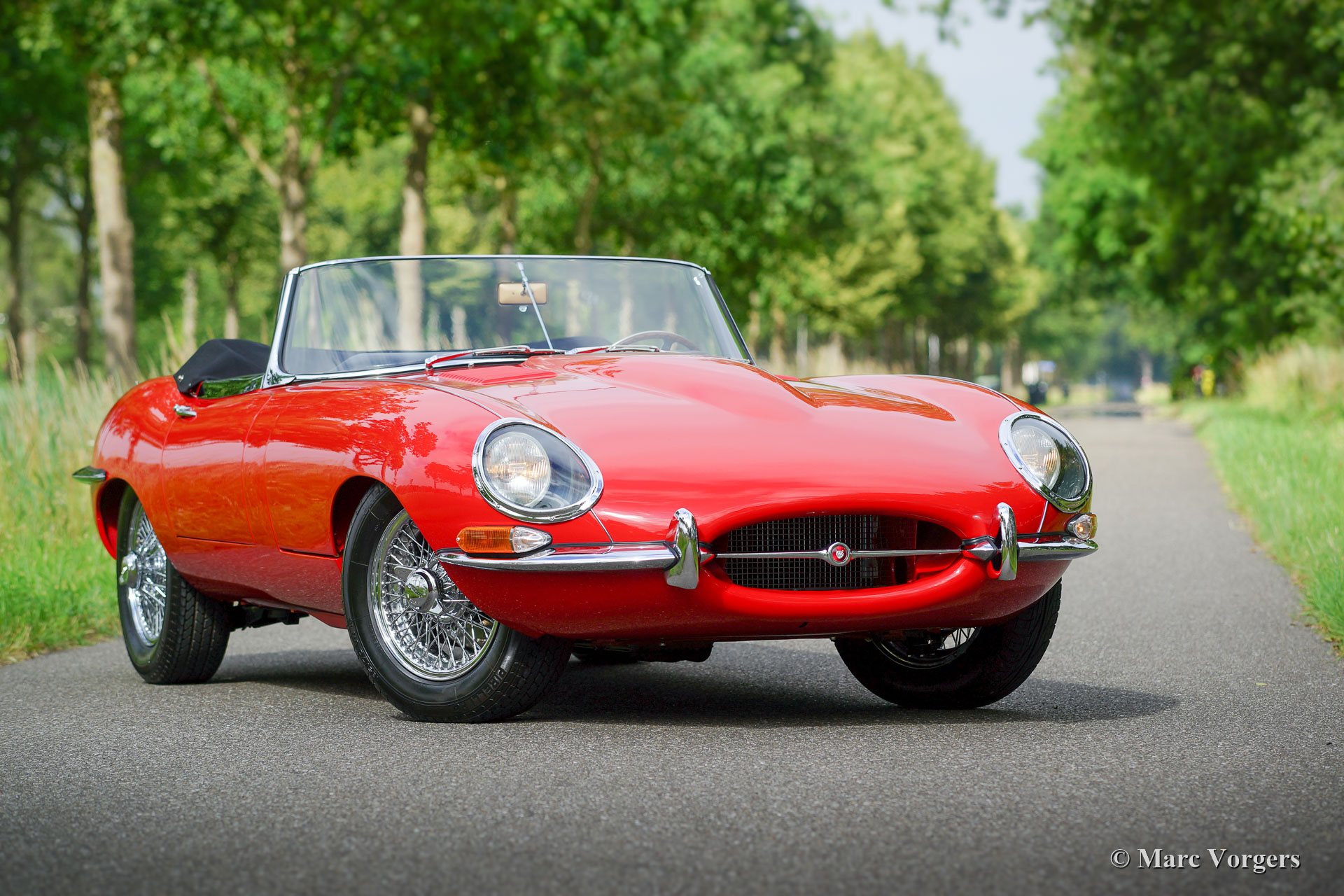 Jaguar E-Type 3.8 litres OTS, année 1962. Numéro de châssis 87845X, numéro de moteur R7356-X, numéro de carrosserie R505X, numéro de boîte de vitesses EB 646X JS. « Matching numbers and colours » ! Couleur rouge Carmen combinée avec un intérieur noir et un tapis noir. Capote mohair noir et couvercle de la hotte noir. Cette fantastique Jaguar E-type vient de la première série très recherchée. La voiture a été vendue neuve à New York, aux États-Unis, le 16 novembre 1962. Les Jaguar de série 1 sont équipées du très sportif moteur de 3,8 litres à six cylindres en ligne, avec trois SU carburateurs, et l'intérieur spécial avec sièges baquets et le tableau de bord revêtu d'aluminium.