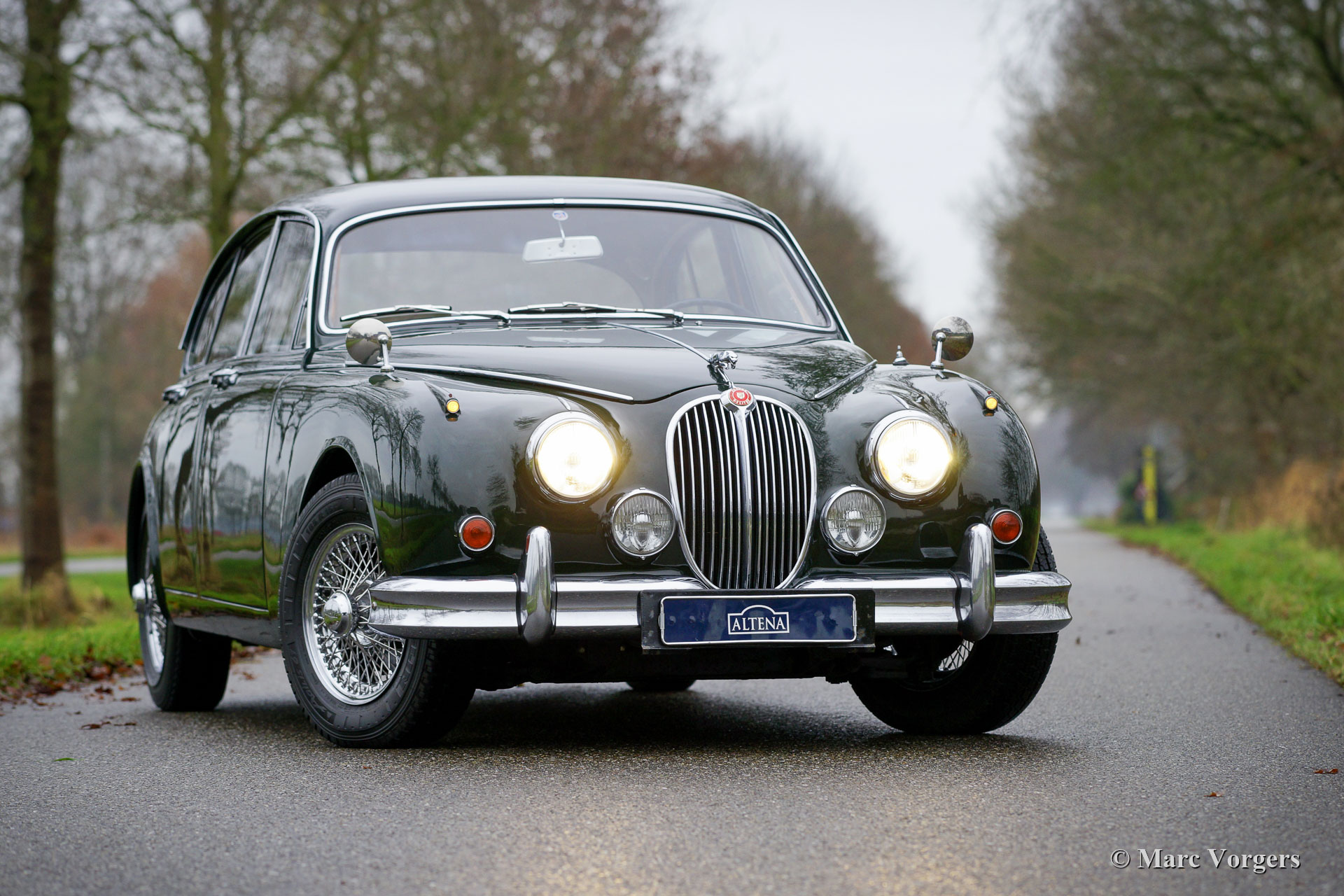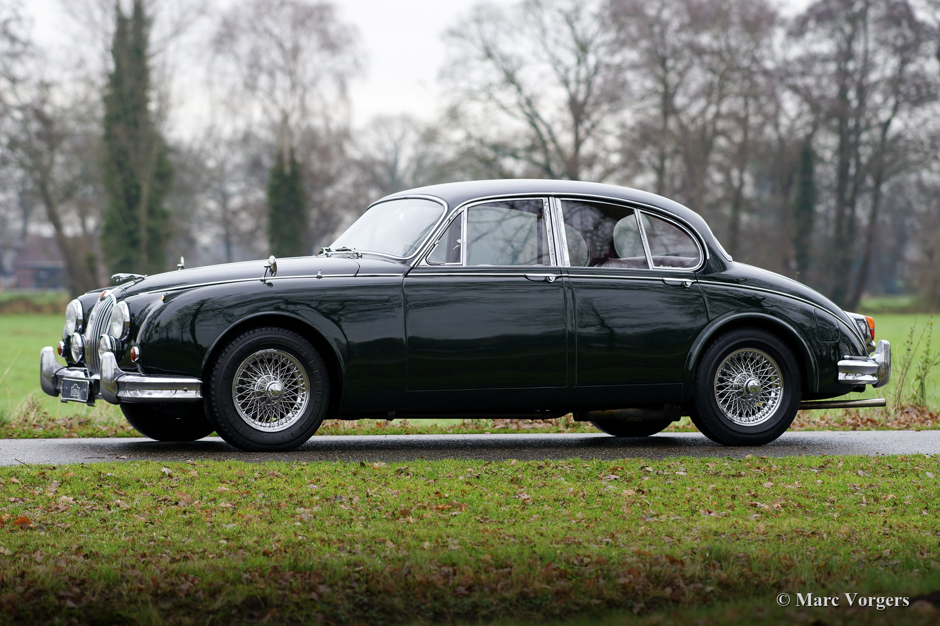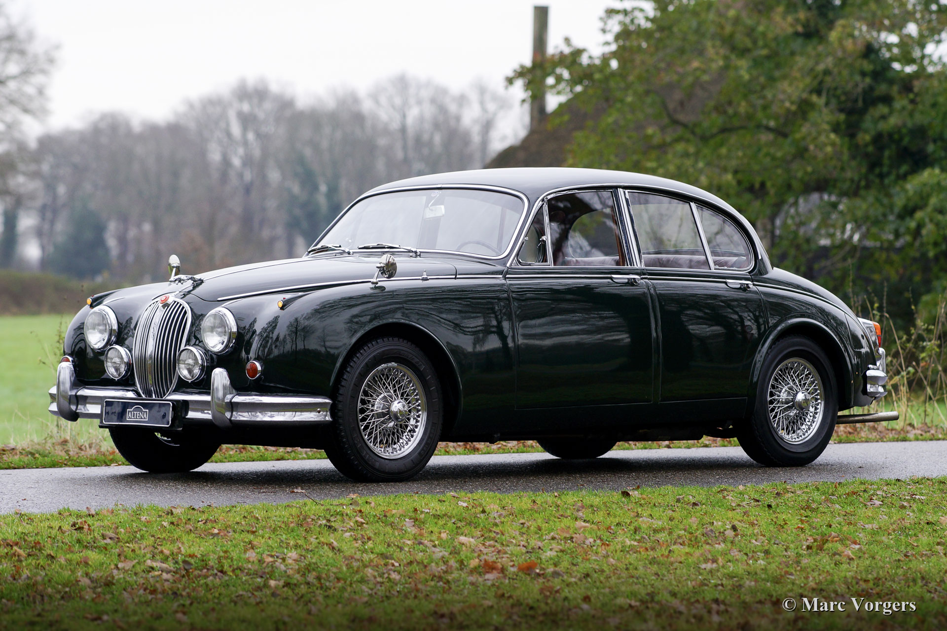 Jaguar Mk II 3,4 litres, année 1963. Numéros correspondants. Couleur British Racing Green foncé combinée avec un intérieur en cuir rouge et un tapis rouge. Cette magnifique Jaguar Mk II 3.4 Litres fut vendue neuve aux Etats-Unis (US). En 1977, l'automobile fut exportée aux Pays-Bas. Au fil des ans, l'automobile fut chérie par les passionnés de Jaguar. La voiture fut vendue pour et aux propriétaires successifs par Altena Classic Service au cours des dernières décennies, et la voiture fut parfaitement entretenue dans leurs ateliers. Cette Jaguar est livrée avec un magnifique dossier d'historique (d'entretien). La carrosserie a reçu une peinture neuve parfaite dans le passé et la mécanique de la voiture fut parfaitement mise à jour. La voiture dispose toujours de son parfait intérieur en cuir d'origine ! L'intérieur somptueux respire la merveilleuse atmosphère haut de gamme des années 1960 avec une abondance de cuir, de bois de noyer et de garnitures chromées. L'intérieur est complété par de petites tables de « pick nick » pour les passagers arrière et une belle radio AM Motorola d'époque. Cette magnifique Jaguar Mk II est équipé en usine de la boîte de vitesses manuelle à 4 vitesses, une combinaison délicieuse et sportive avec le moteur six cylindres de 3,4 litres ! De plus, la Jaguar est équipée de roues à rayons chromées chaussées de pneus Michelin 185/15, de harnais de sécurité Kangol d'époque, d'un allumage électronique 123, d'une dynamo améliorée et d'un système d'échappement en acier inoxydable. Dans le coffre, vous trouverez l'ensemble d'outils d'origine ! Il s'agit d'une Jaguar Mk II très originale et très désirable en très bel état !
