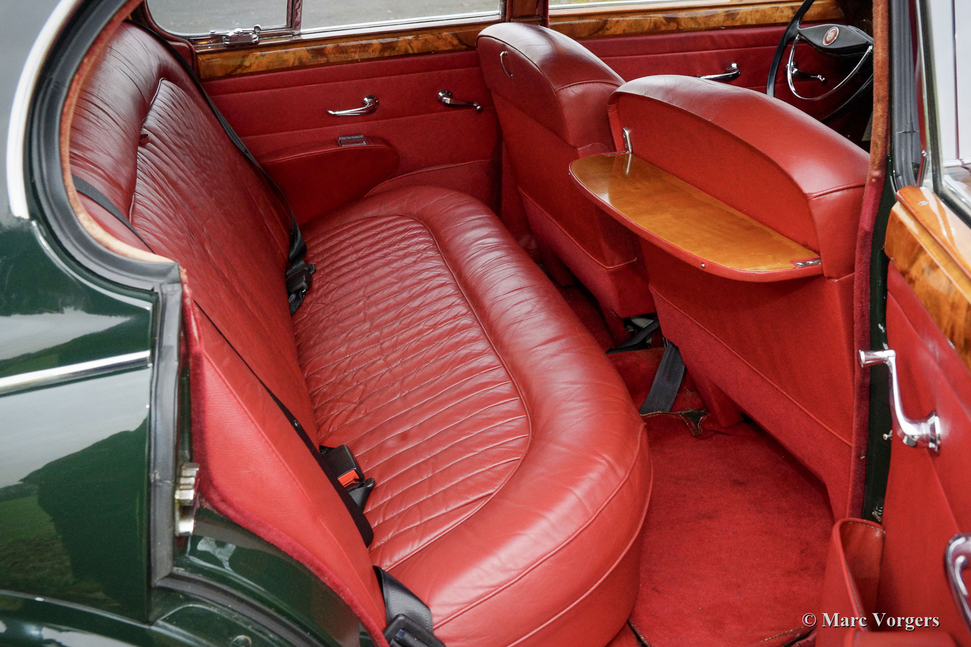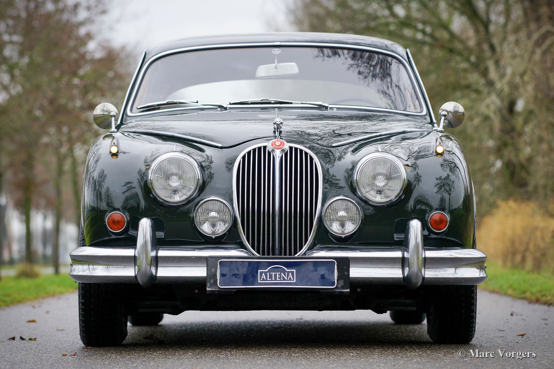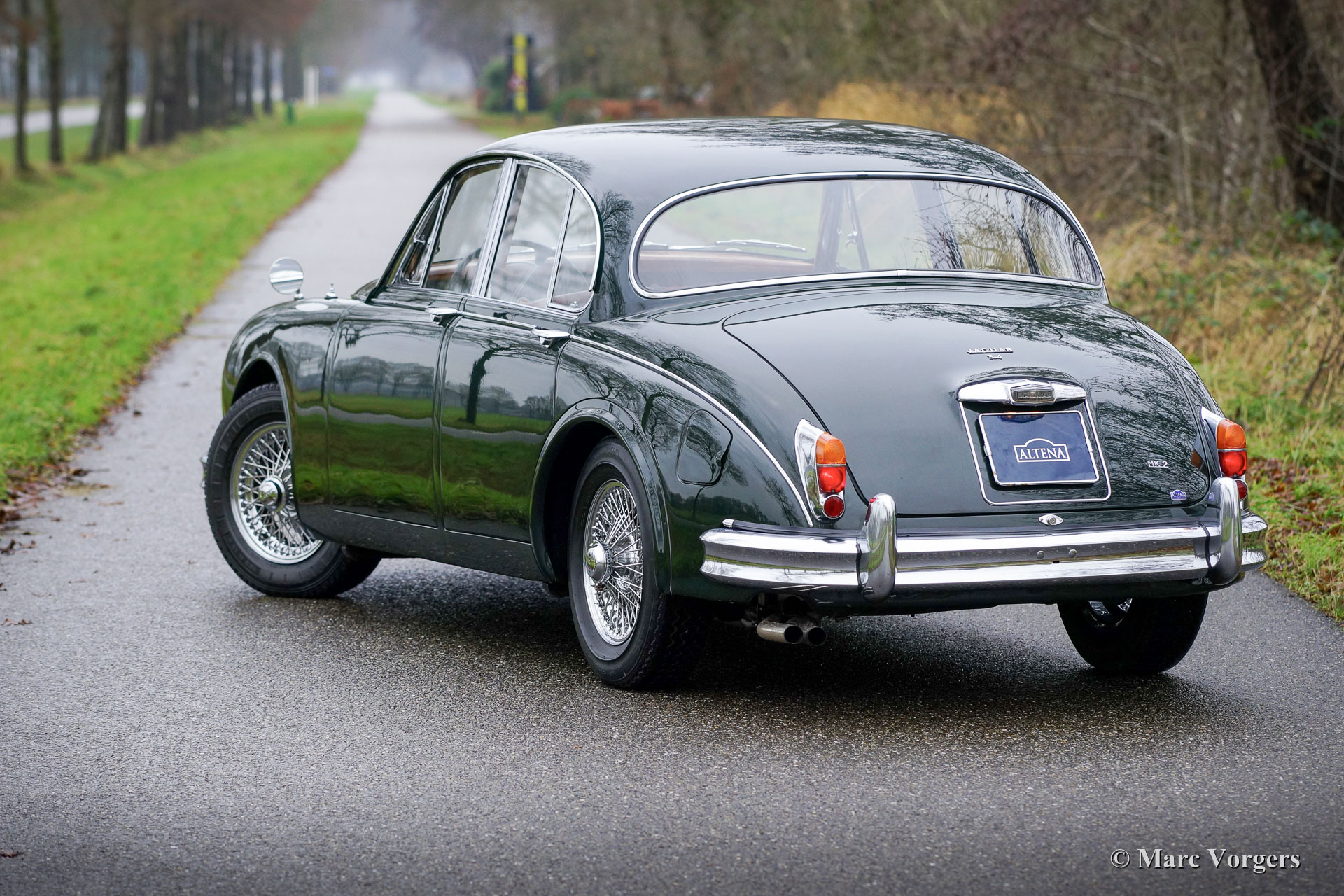 Jaguar Mk II 3,4 litres, année 1963. Numéros correspondants. Couleur British Racing Green foncé combinée avec un intérieur en cuir rouge et un tapis rouge. Cette magnifique Jaguar Mk II 3.4 Litres fut vendue neuve aux Etats-Unis (US). En 1977, l'automobile fut exportée aux Pays-Bas. Au fil des ans, l'automobile fut chérie par les passionnés de Jaguar. La voiture fut vendue pour et aux propriétaires successifs par Altena Classic Service au cours des dernières décennies, et la voiture fut parfaitement entretenue dans leurs ateliers. Cette Jaguar est livrée avec un magnifique dossier d'historique (d'entretien). La carrosserie a reçu une peinture neuve parfaite dans le passé et la mécanique de la voiture fut parfaitement mise à jour. La voiture dispose toujours de son parfait intérieur en cuir d'origine ! L'intérieur somptueux respire la merveilleuse atmosphère haut de gamme des années 1960 avec une abondance de cuir, de bois de noyer et de garnitures chromées. L'intérieur est complété par de petites tables de « pick nick » pour les passagers arrière et une belle radio AM Motorola d'époque. Cette magnifique Jaguar Mk II est équipé en usine de la boîte de vitesses manuelle à 4 vitesses, une combinaison délicieuse et sportive avec le moteur six cylindres de 3,4 litres ! De plus, la Jaguar est équipée de roues à rayons chromées chaussées de pneus Michelin 185/15, de harnais de sécurité Kangol d'époque, d'un allumage électronique 123, d'une dynamo améliorée et d'un système d'échappement en acier inoxydable. Dans le coffre, vous trouverez l'ensemble d'outils d'origine ! Il s'agit d'une Jaguar Mk II très originale et très désirable en très bel état !
