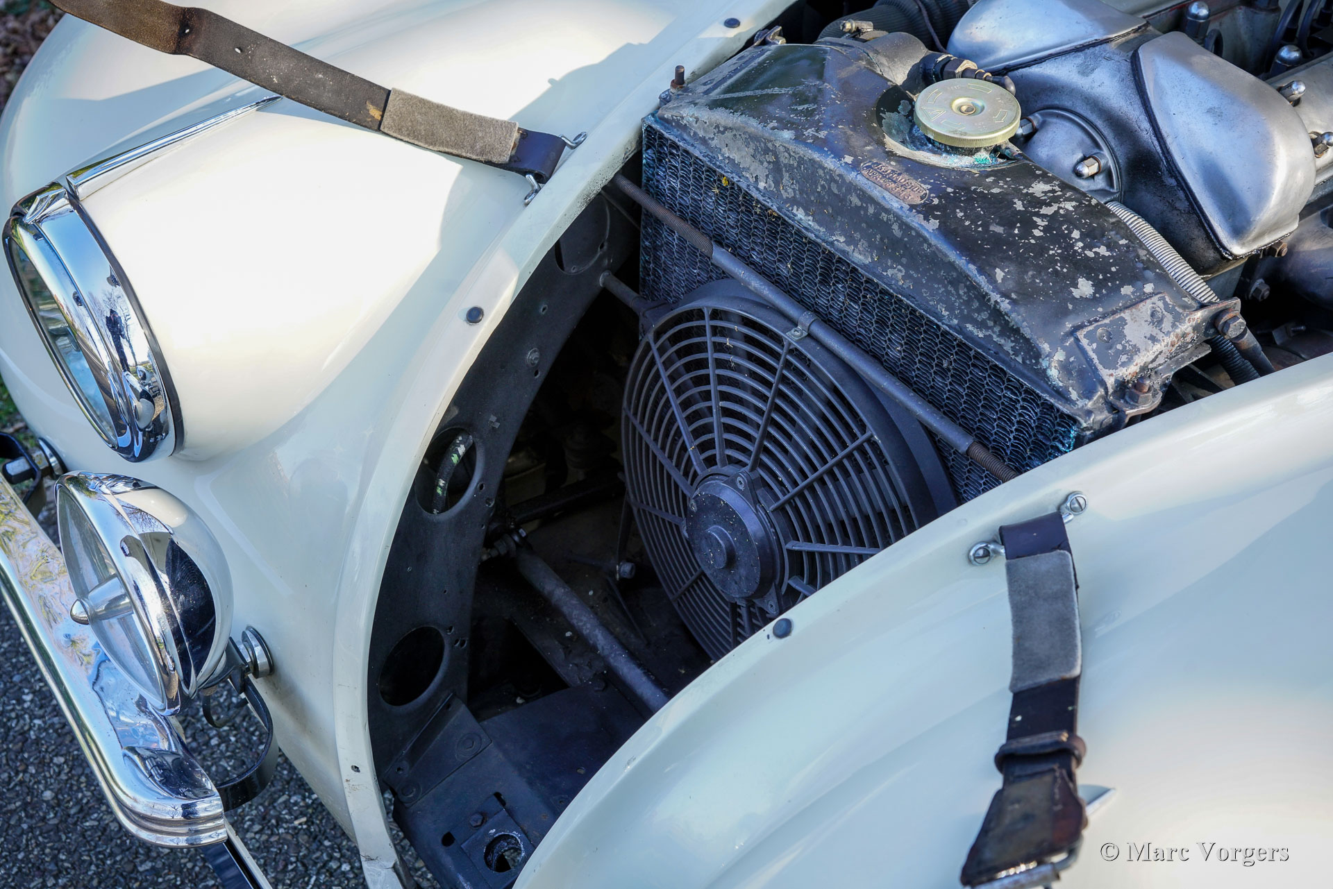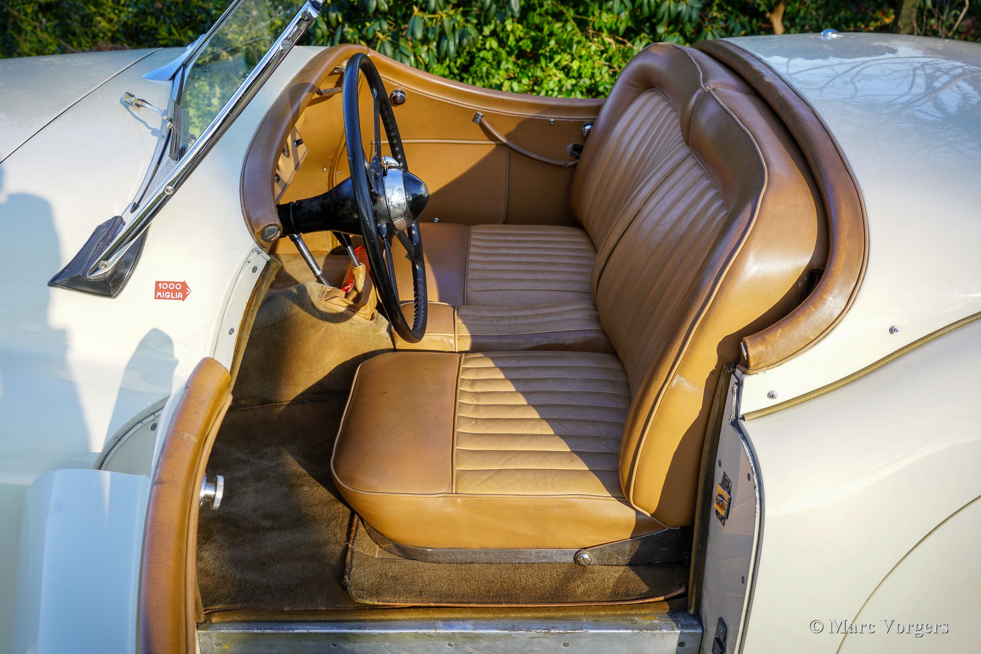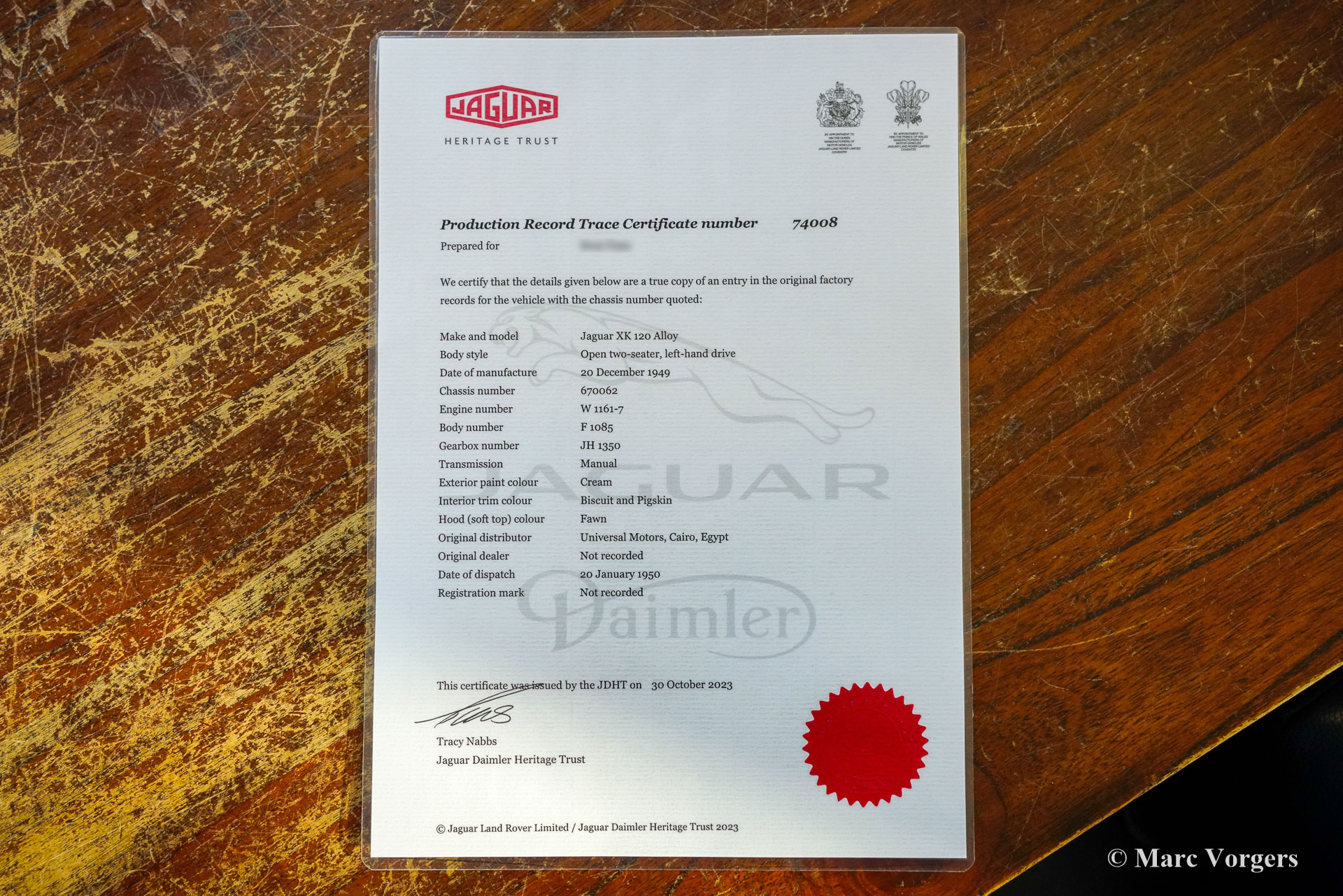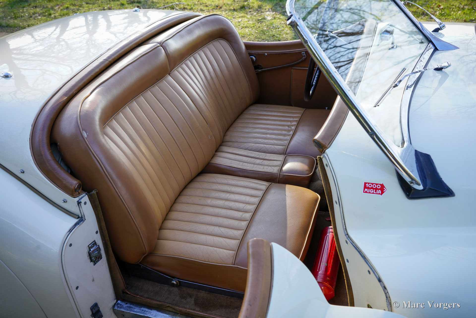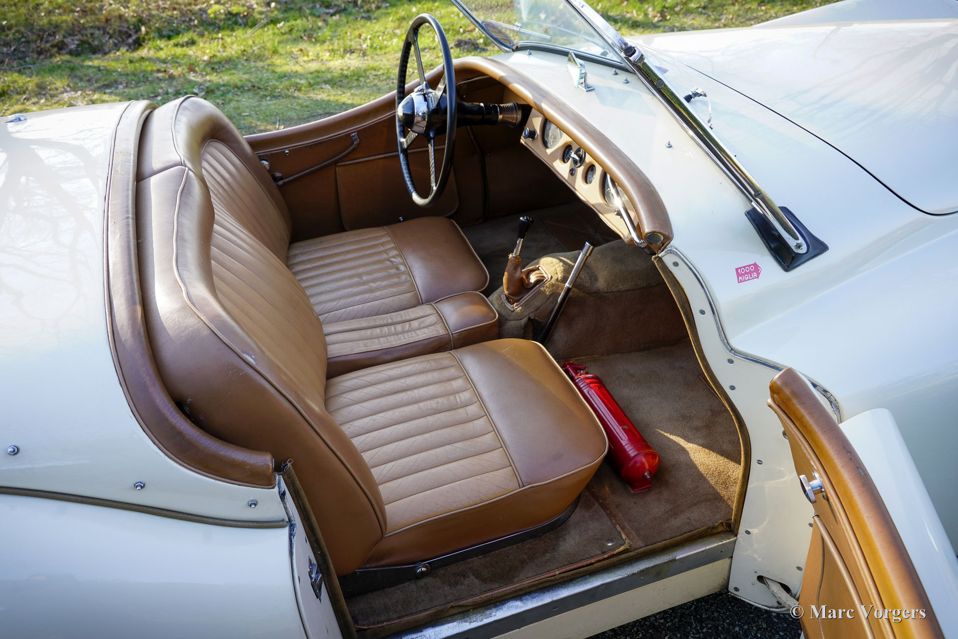 Jaguar XK 120 Alloy MILLE MIGLIA Roadster, année 1949. Numéro de châssis 670062, numéro de moteur W1161-7, numéro de boîte de vitesses JH1350. Un certificat Heritage est présent confirmant que le châssis et le moteur ont des numéros correspondants d’origine. La culasse fut échangée dans le passé. L'extérieur crème et l'intérieur en cuir beige foncé correspondent aux couleurs de sortie d'usine de la voiture en 1949. La Jaguar XK 120 Alloy est une voiture de collection historiquement importante qui marque l'introduction du célèbre moteur Jaguar XK à double arbre à cames en tête six cylindres. La Jaguar XK 120 a été conçue comme un « banc d'essai » pour le nouveau moteur XK. Présentée au salon de l'automobile de Londres en 1948, les chiffres de performance (vitesse de pointe garantie de 120 mph) et le magnifique design biplace ouvert ont fait sensation, poussant le fondateur et président de Jaguar, William Lyons, à la mettre en production. Les 242 premières voitures furent équipées de carrosseries en alliage d'aluminium fabriquées à la main avant que la production des voitures à carrosserie en acier embouti ne démarre en 1950. Le 30 mai 1949, la Jaguar XK 120 devint la voiture de série la plus rapide au monde avec un record de vitesse de 132,6 mph établi sur l'autoroute de Jabbeke en Belgique. Cette rare Jaguar XK 120 Alloy avec le numéro de châssis 670062 est la voiture numéro 62 des 242 voitures en alliage construites. Cette XK 120 Alloy est l'une des 184 construites avec la conduite à gauche et la voiture fut vendue neuve au Caire, en Égypte, en décembre 1949. En 1996, l'automobile fut restaurée détaillée, des factures donnant un bon aperçu des travaux effectués sont présentes. À la fin des années 1990, la voiture appartenait à M. G.R. Lang, fondateur de Chronoswiss, le célèbre fabricant de montres. À cette époque, l'alliage XK 120 figurait en bonne place dans le matériel promotionnel de l'entreprise. En 1999, la Jaguar XK 120 a participé au Silvretta Classic Rallye Montafon en Autriche, où elle a remporté la 1ère place. Par la suite, la voiture a remporté un autre prix lors du Bensberg Classic allemand. En 2003, la Jaguar XK 120 a participé à la prestigieuse Mille Miglia Storica. L'histoire complète de la XK 120 est connue et présentée dans deux grands dossiers. Cette rare et très désirable Jaguar XK 120 Alloy est en bon état et présente une patine merveilleuse. Le moteur XK six cylindres tourne avec puissance et la boîte Moss à quatre rapports passe les vitesses comme il se doit. L'expérience de conduite et toutes les impressions de vitesse et de son sont magnifiques ; cette XK 120 Alloy est une formidable capsule temporelle. La voiture présente tous les détails d'origine et est équipée d'une paire de grands projecteurs Lucas SLR700 à l'avant, d'une ceinture en cuir sur le capot et de pare-brise latéraux avec des cadres beiges. La voiture est accompagnée d'un formulaire d'identification de véhicule historique de la FIA et peut être inscrite à n'importe quel événement historique dans le monde, y compris la légendaire Mille Miglia. La XK 120 n'est pas une voiture très adaptée aux conducteurs de très grande taille. Pour eux, nous avons la possibilité d'installer des sièges baquets spéciaux offrant plus d'espace pour les jambes. La Jaguar XK 120 Alloy MILLE MIGLIA est le « Saint Graal » dans le monde des voitures Jaguar. C'est une splendide opportunité d'acheter votre billet pour la crème de la crème des événements automobiles historiques.