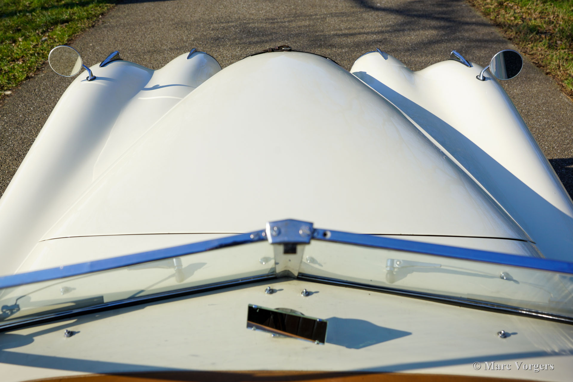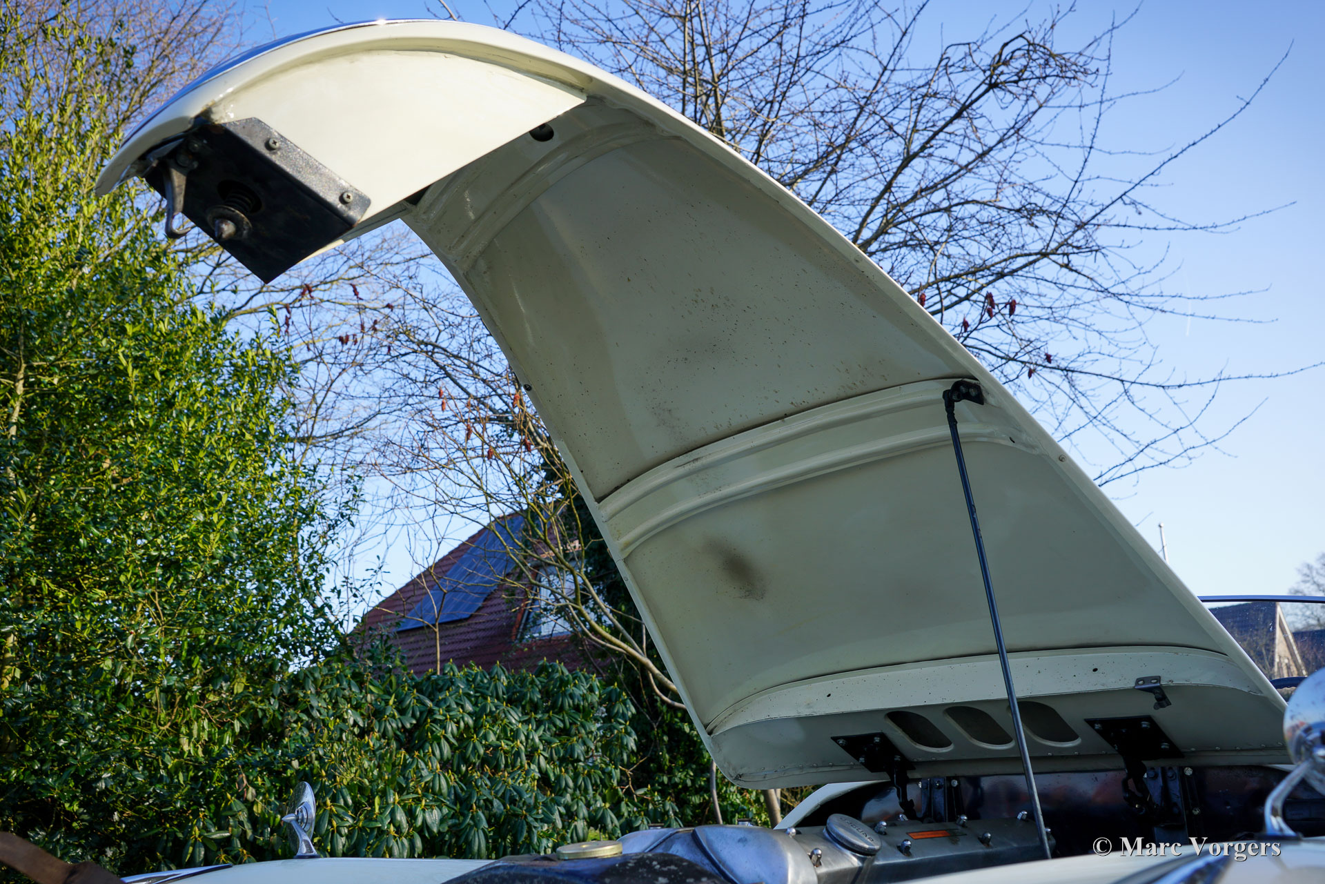 The Jaguar XK 120 was introduced in 1948, and caused an immediate sensation. The XK 120 had a top speed of 120 miles an hour (about. 200 km/h) and was the fastest production car for sale at that time. The XK 120 was designed by Jaguar’s boss and founder William Lyons. The bodywork had an almost sculptural design, with sober, well-chosen flowing lines and beautiful curves. With its exquisite long bonnet and elongated wing lines, the XK 120 has a very dynamic charisma.