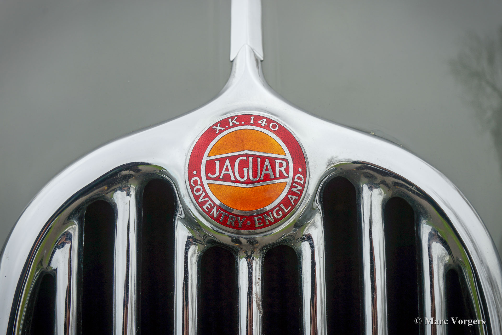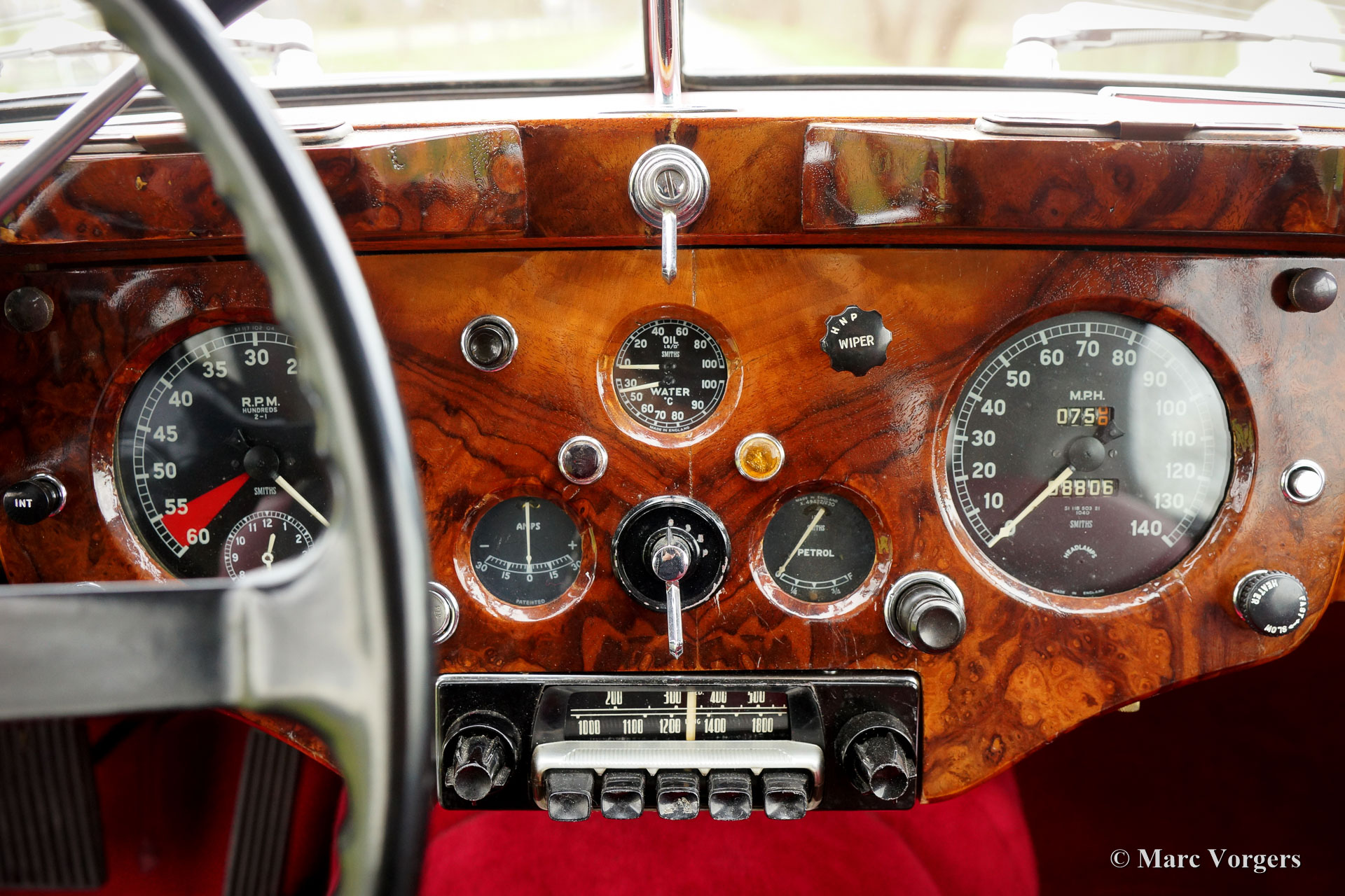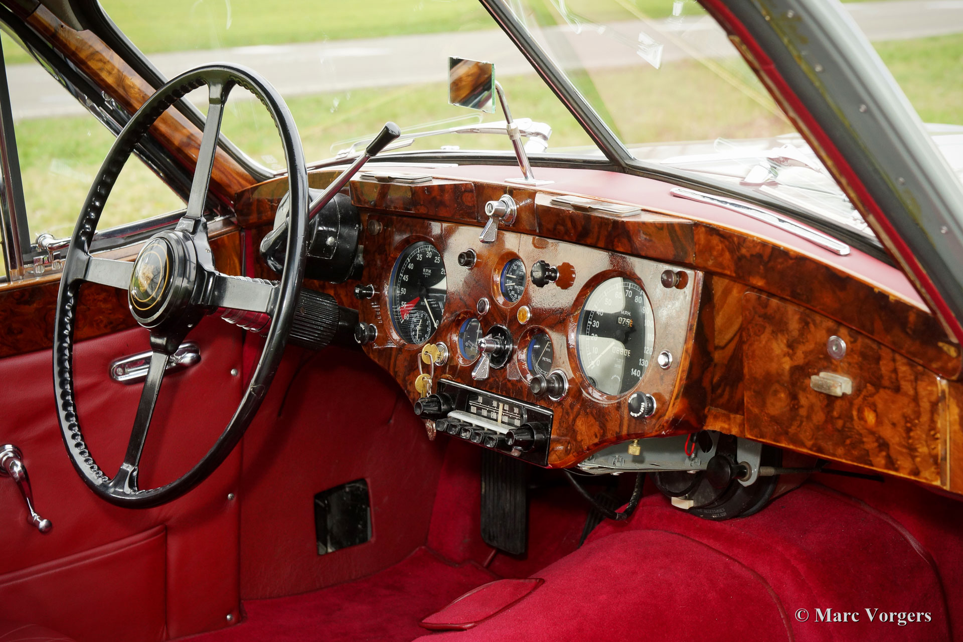 The Jaguar XK 140 replaced the famous XK 120 and was brought onto the market in 1954. The XK 140 was an evolution of the XK 120 with some visual differences and technical improvements. The handsome and dynamic features remained largely unchanged. New was the grille, which counted fewer vertical bars; the rear lights were larger, the bumpers were thicker, and the front indicators, which were placed on the front of the front wing. The important technical improvement was that the XK 140 was provided with a rack and pinion steering which greatly improved steering and driving.