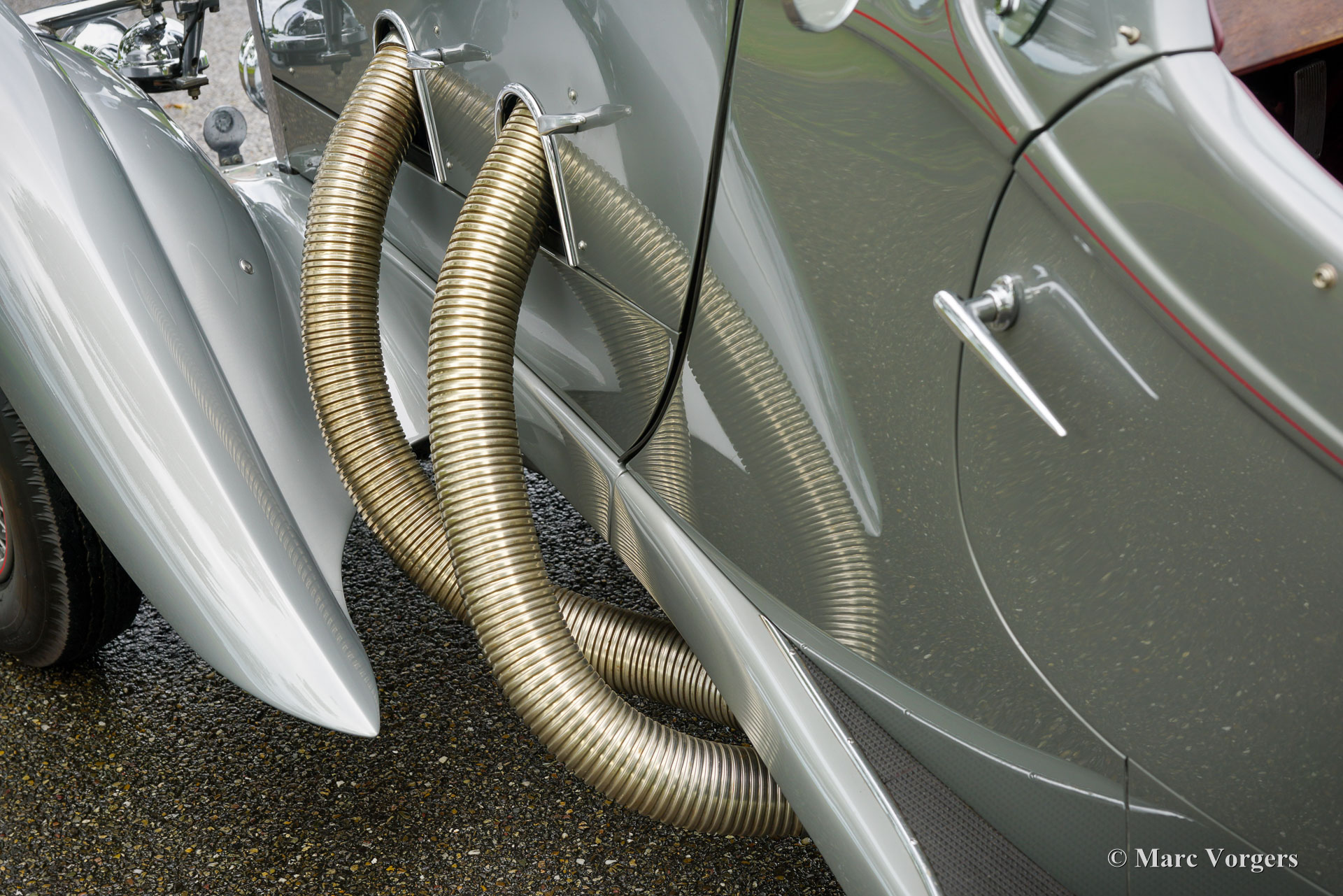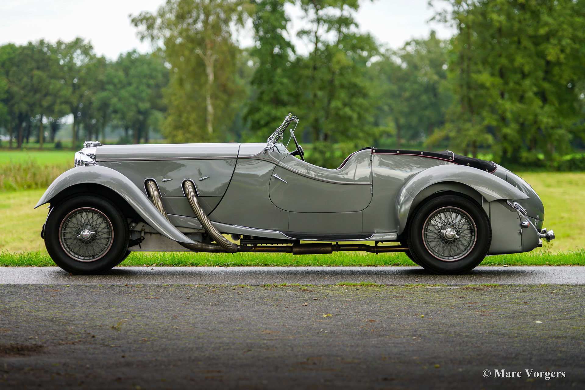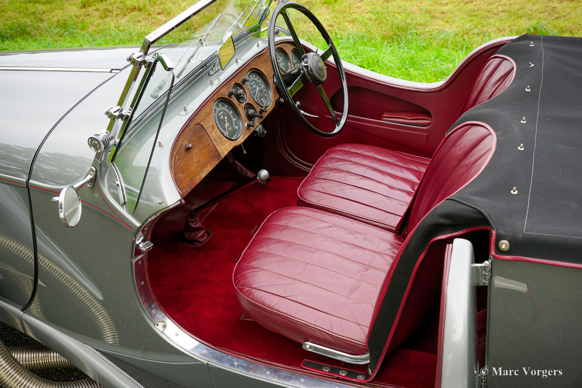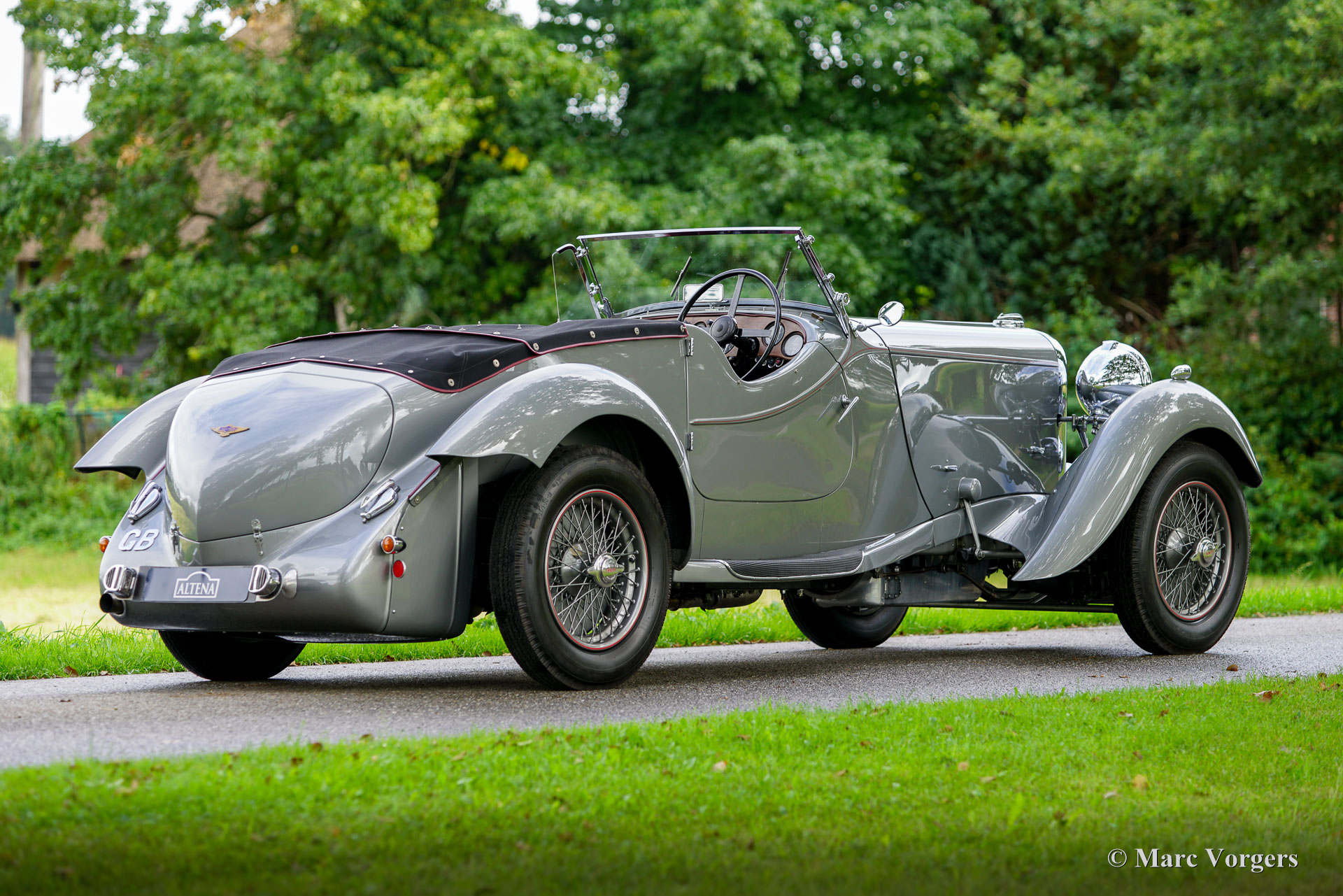 Lagonda LG45 ‘Rapide’ Tourer quatre places, année 1937. Numéro de châssis 12178, numéro de moteur M45/160, numéro de boîtier de direction 6087/47. Couleur gris métallisé combinée à un intérieur en cuir rouge foncé et un capot et un couvre-caisse en mohair noir. La Lagonda LG45 est une automobile très rare, seuls 278 exemplaires furent construits dans les années 1936 – 1937. Le moteur affiche le S.U. carburateurs directement boulonnés sur la culasse, une marque du dernier modèle « sanction trois » avec collecteur à flux transversal intégré coulé dans la culasse. La voiture fut vendue neuve avec une carrosserie berline « De Ville ». En 1994, le châssis fut équipé de la spectaculaire carrosserie Tourer quatre places « Rapide » actuelle, construite à la main par le célèbre carrossier britannique Rod Jolley. Mécaniquement et techniquement, la voiture fut entièrement et magnifiquement restaurée et révisée par LMB en Belgique. La boîte de vitesses d'origine (avec seulement une synchronisation sur le 2ème rapport) fut remplacée par une boîte de vitesses Alvis entièrement synchronisée. Une modification coûteuse et complexe qui a grandement amélioré la facilité d'utilisation et l'expérience de conduite. Cette Lagonda LG45 Rapide est dans un superbe état, et la voiture roule et se comporte à merveille. Le style de carrosserie Tourer quatre places « Rapide » est très spécial, cette Lagonda fait vraiment tourner les têtes. L'automobile présente des détails fantastiques complétant le style extravagant. Cette Lagonda fut chérie par son propriétaire et entretenue par des professionnels. Cette automobile vintage exclusive peut être exportée et immatriculée dans n’importe quel pays du monde. Une magnifique Lagonda LG 45 en superbe état !