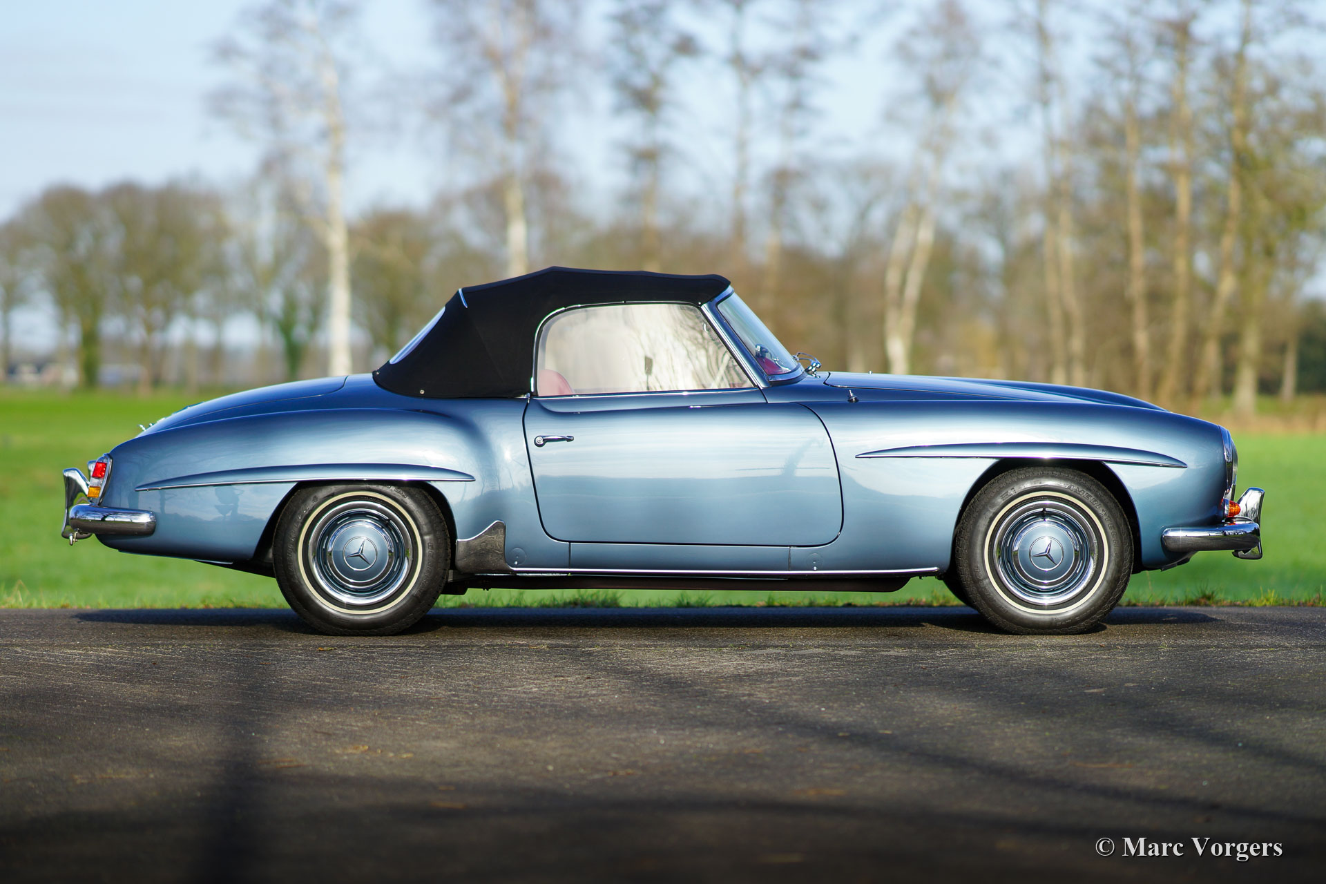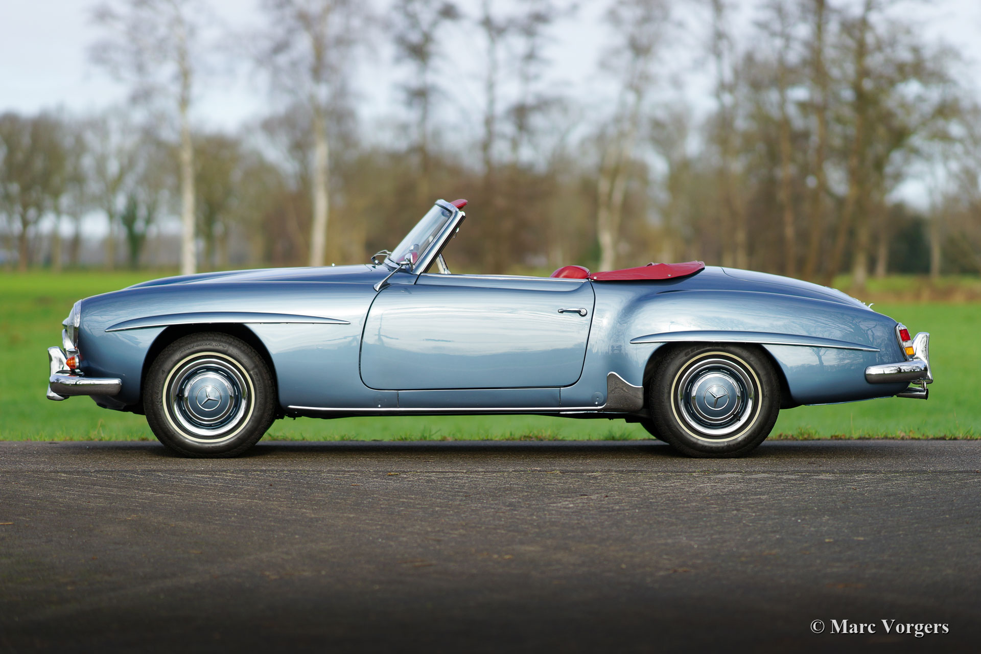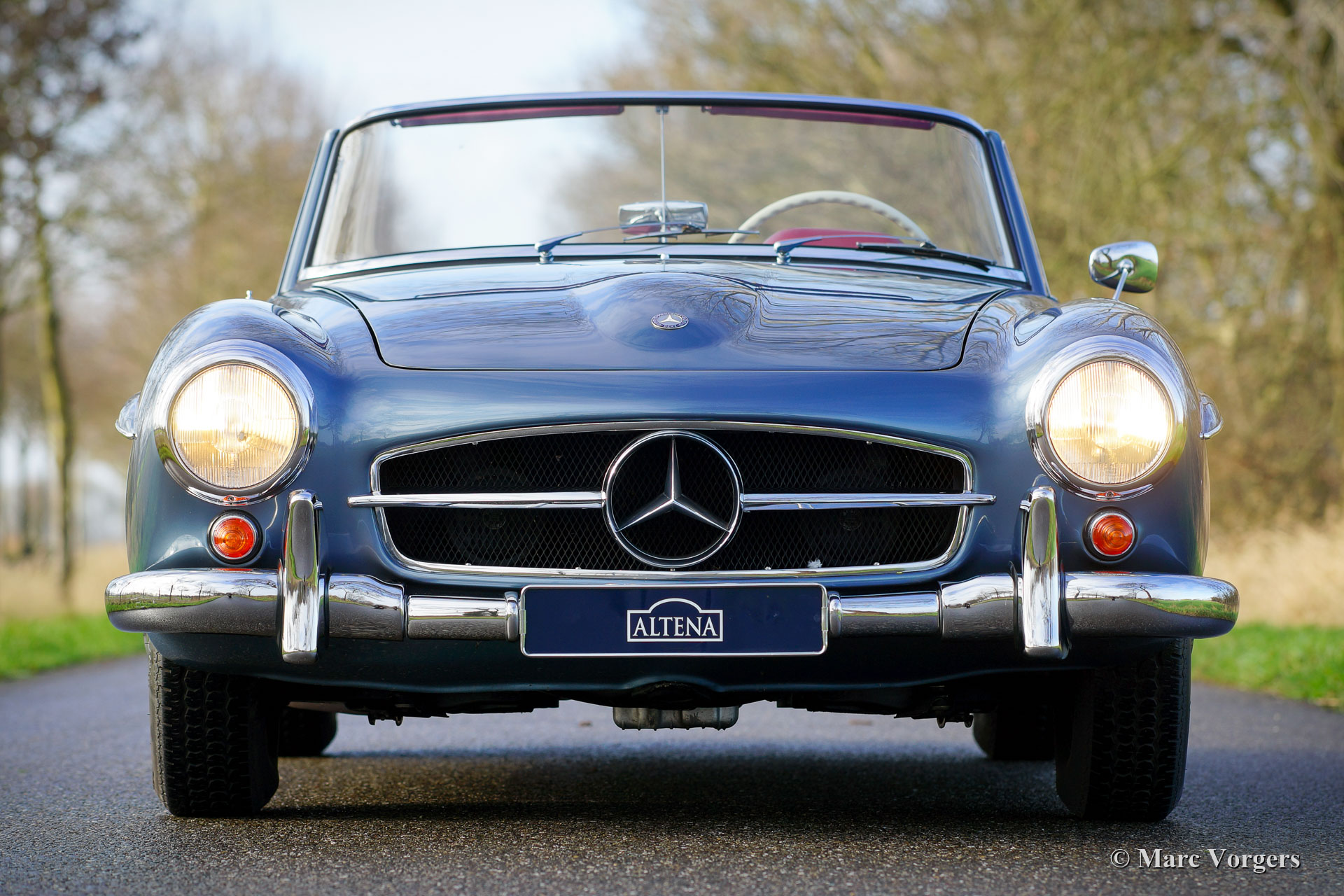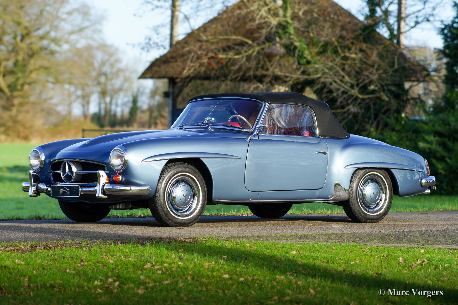 Mercedes-Benz 190 SL, année 1962. Couleur bleu métallisé (numéro de couleur 396) combinée avec un intérieur en cuir rouge et un tapis rouge. Capote en mohair noir (Sonnenland), capuche en cuir rouge et hard top original de couleur carrosserie ! Cette fabuleuse Mercedes 190 SL a été importée aux Pays-Bas en 1998. Il y a à peine dix ans, l'automobile a été largement remise en état de compétition (concours). La carrosserie fut parfaitement restaurée (toutes les soudures par points d'origine encore visibles) avec un ajustement parfait des panneaux et un superbe système de peinture. Toutes les pièces mécaniques furent révisées (y compris les jauges du tableau de bord), le chrome fut renouvelé et un nouveau faisceau de câbles fut installé. Cette magnifique Mercedes 190 SL est en superbe état et la voiture roule et pilote parfaitement ! Au cours des dernières années, la voiture a été en service chez Altena Classic Service ; Le 190 SL est entièrement à jour. Cette magnifique Mercedes-Benz 190 SL montre tous les détails d'origine. Cela comprend un 3e siège en option derrière le siège passager et la bonne radio automatique Becker Mexico. Un exemple de première classe !