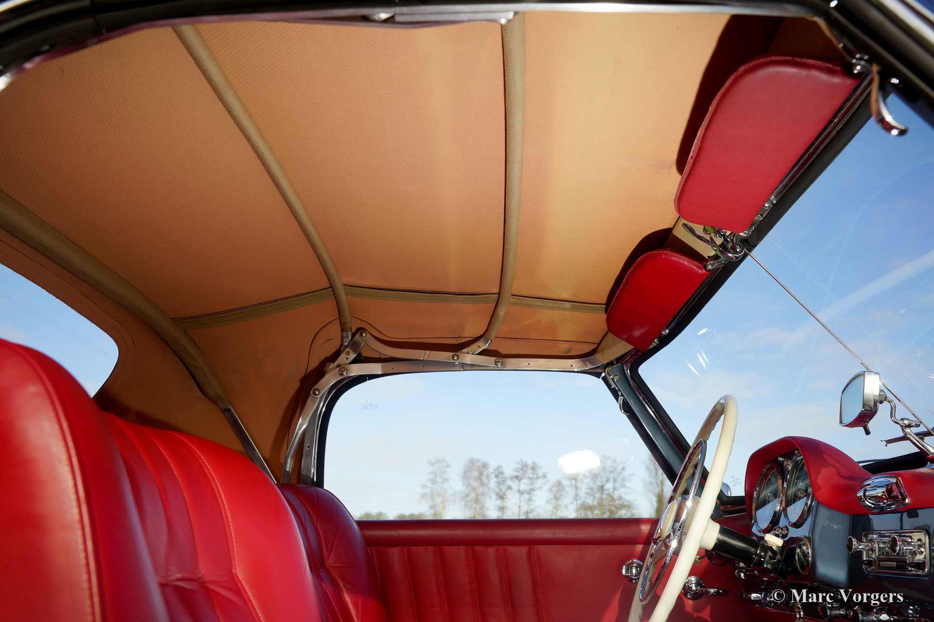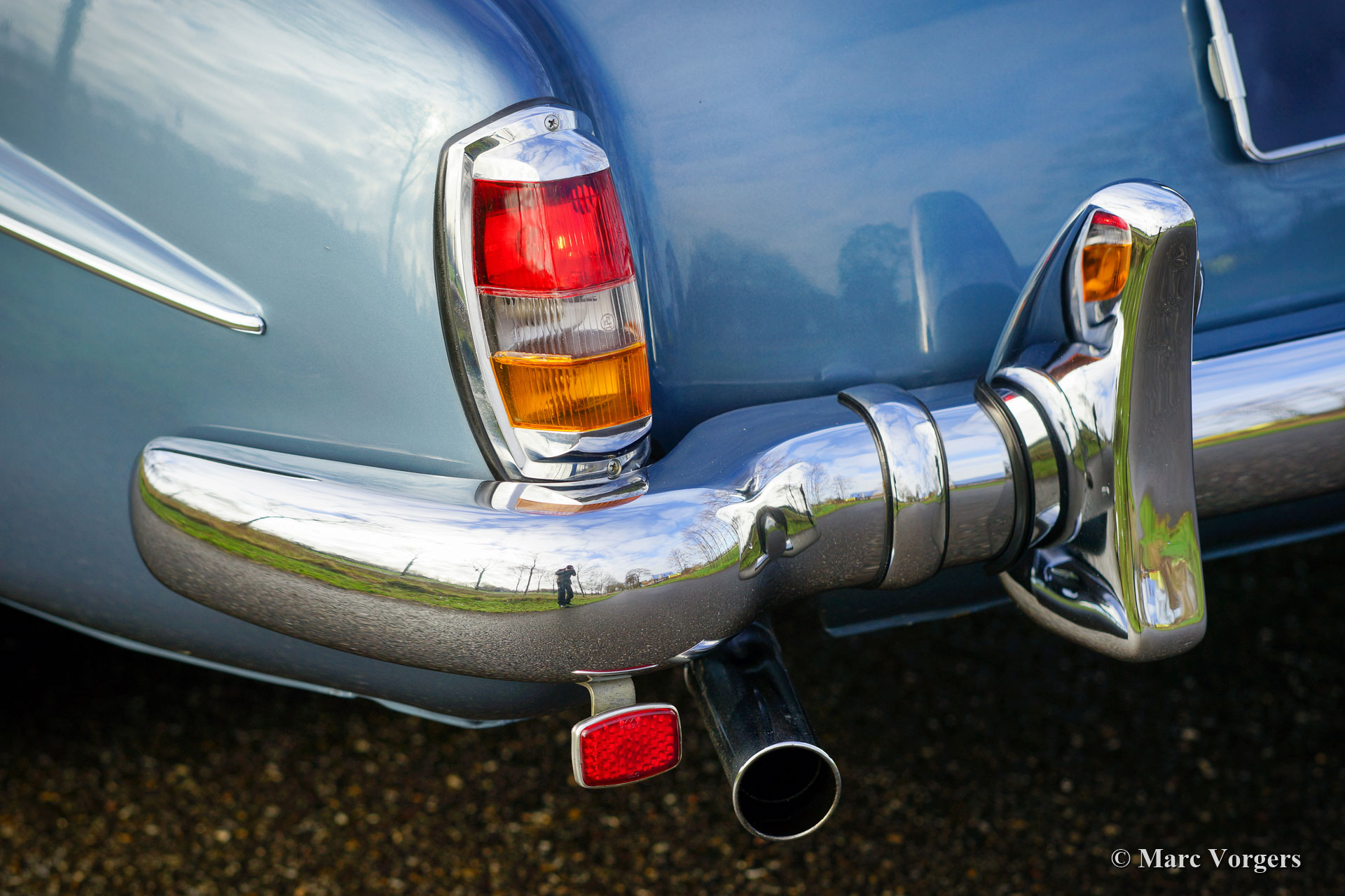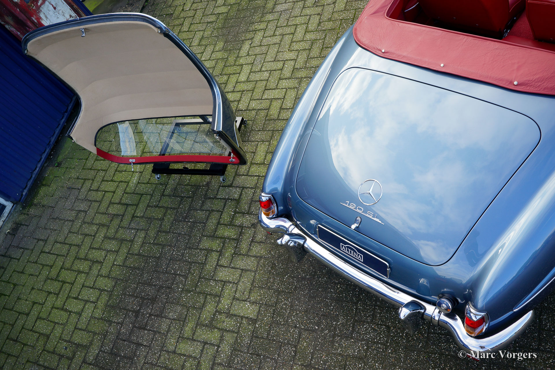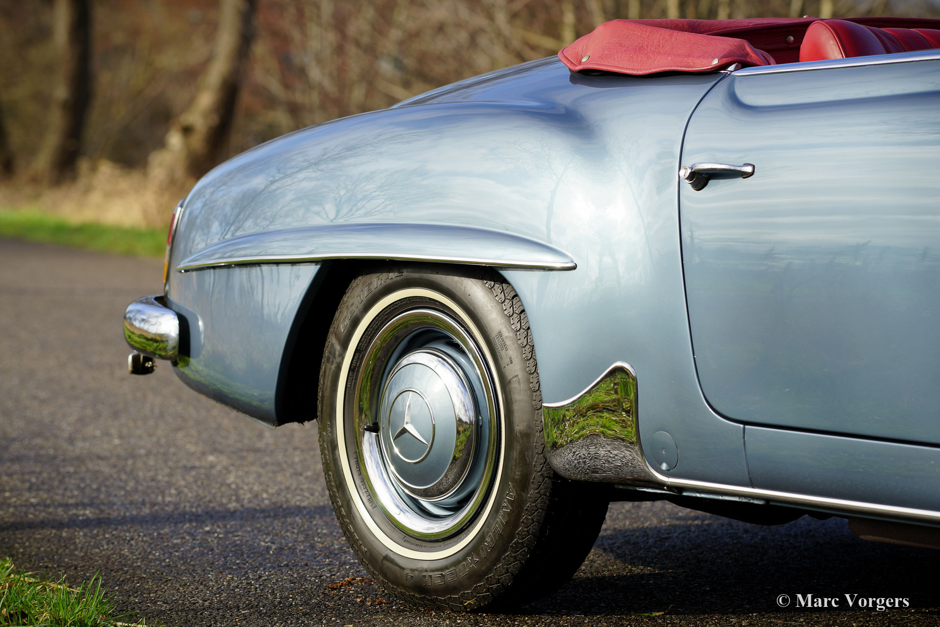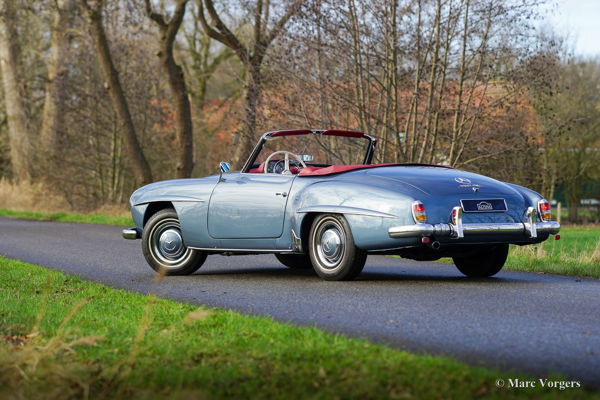 Mercedes-Benz 190 SL, année 1962. Couleur bleu métallisé (numéro de couleur 396) combinée avec un intérieur en cuir rouge et un tapis rouge. Capote en mohair noir (Sonnenland), capuche en cuir rouge et hard top original de couleur carrosserie ! Cette fabuleuse Mercedes 190 SL a été importée aux Pays-Bas en 1998. Il y a à peine dix ans, l'automobile a été largement remise en état de compétition (concours). La carrosserie fut parfaitement restaurée (toutes les soudures par points d'origine encore visibles) avec un ajustement parfait des panneaux et un superbe système de peinture. Toutes les pièces mécaniques furent révisées (y compris les jauges du tableau de bord), le chrome fut renouvelé et un nouveau faisceau de câbles fut installé. Cette magnifique Mercedes 190 SL est en superbe état et la voiture roule et pilote parfaitement ! Au cours des dernières années, la voiture a été en service chez Altena Classic Service ; Le 190 SL est entièrement à jour. Cette magnifique Mercedes-Benz 190 SL montre tous les détails d'origine. Cela comprend un 3e siège en option derrière le siège passager et la bonne radio automatique Becker Mexico. Un exemple de première classe !