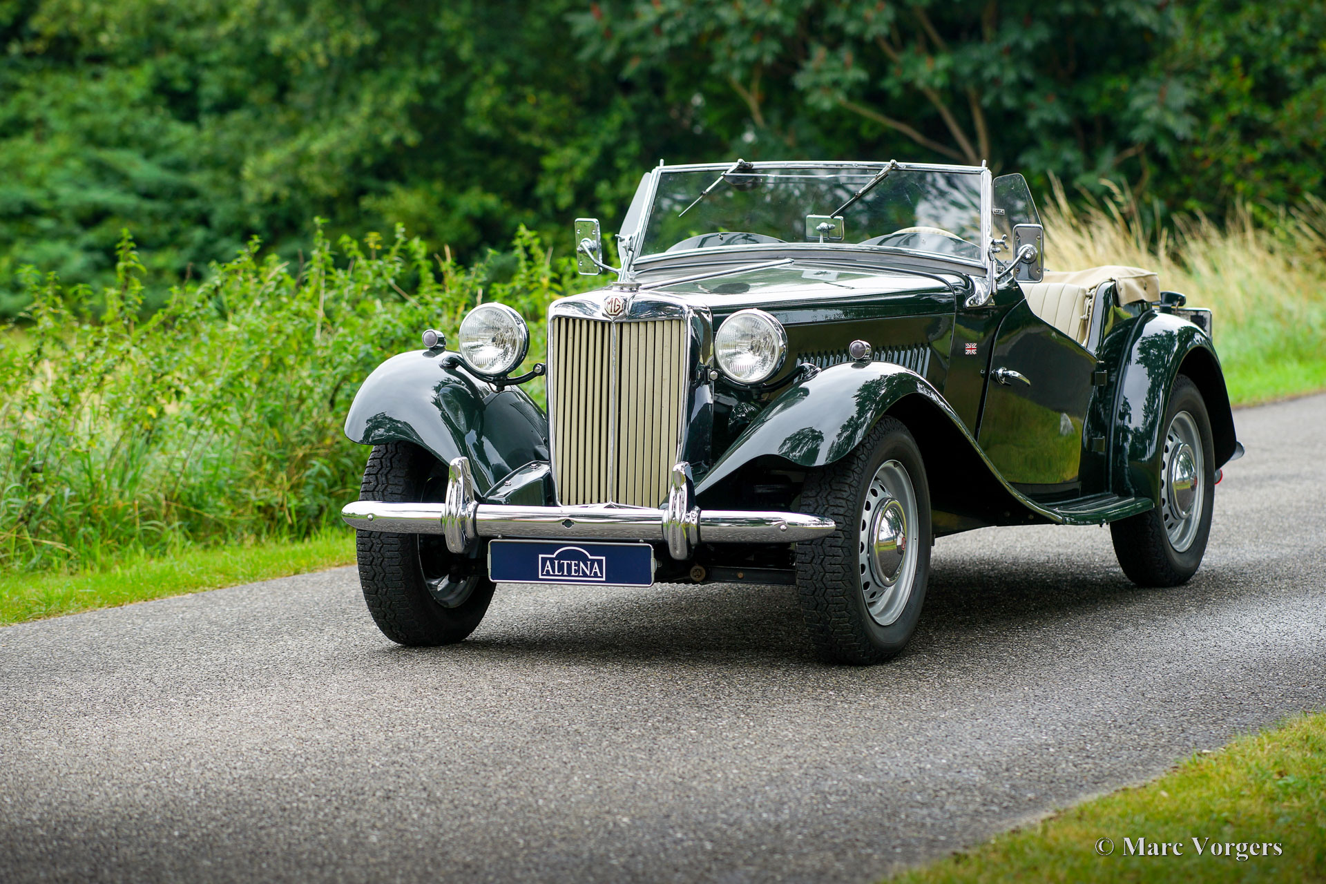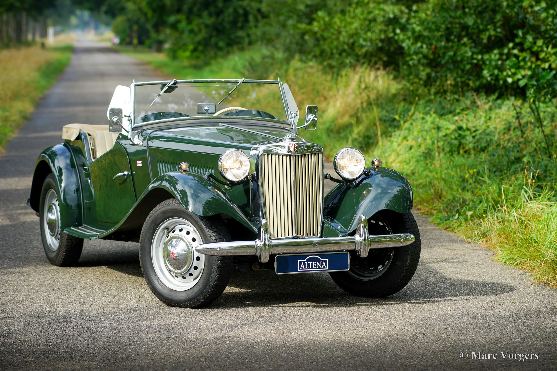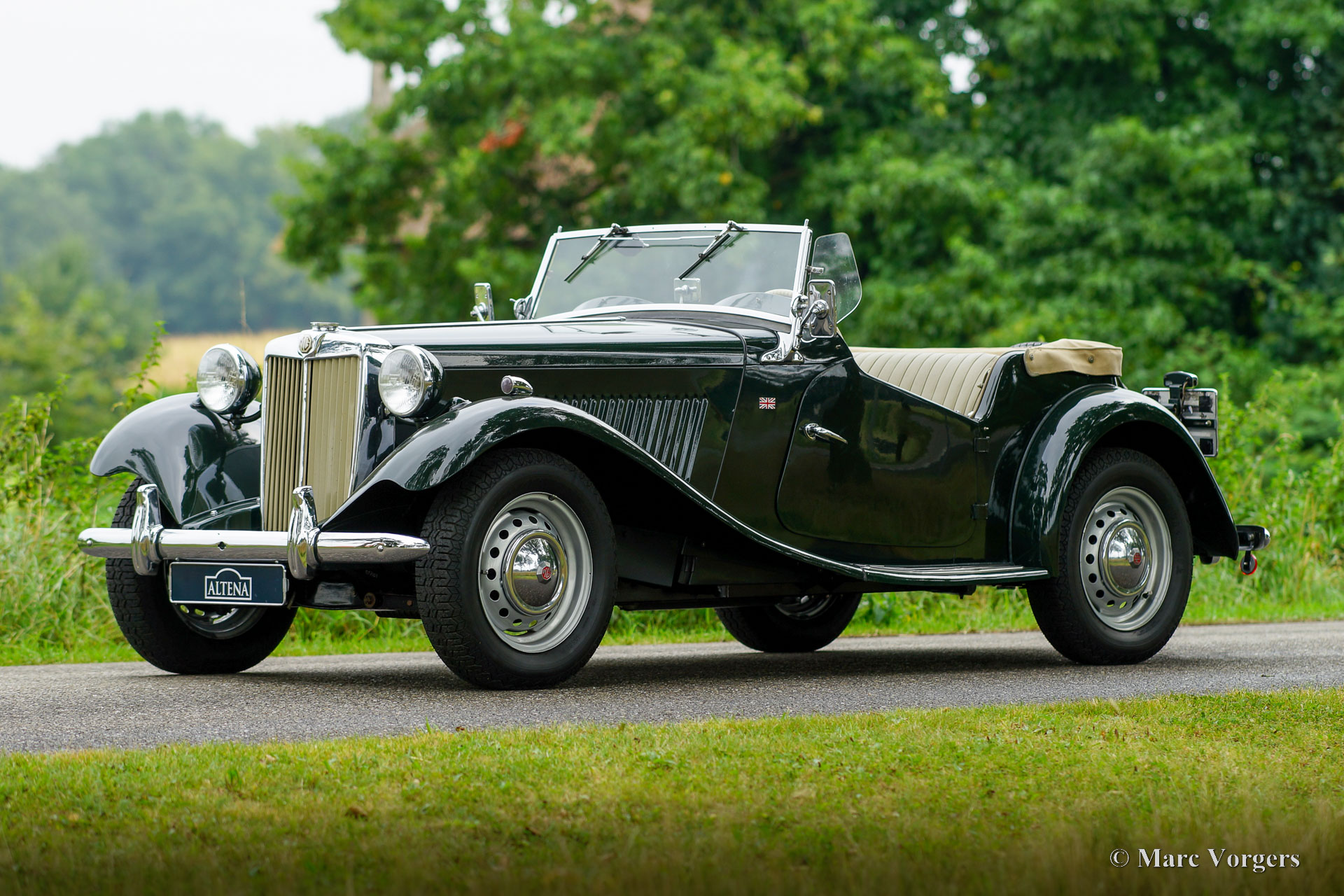 MG TD, année 1952. Couleur British Racing Green combinée avec des sièges en cuir magnolia (beige pâle) et un tapis noir. Capote en vinyle beige et couvre tonneau en mohair beige. Cette magnifique MG TD fut vendu neuve aux États-Unis, la voiture fut importée aux Pays-Bas en l'an 2000. Après son arrivée aux Pays-Bas, la voiture fut restaurée détaillée (y compris le faisceau électrique) à la perfection, et la voiture n'a parcouru que 4852 miles puisque. Au cours des 22 dernières années, la MG fut chérie par les passionnés de MG qui ont gardé la voiture en excellent état ! Le moteur MG 'EPAG' fonctionne parfaitement et toutes les commandes fonctionnent comme elles le devraient. Cette MG TD montre tous les détails d'origine comme le volant d'origine et les roues à disque en acier avec enjoliveurs chromés. Cette merveilleuse et super originale MG TD peut être importée dans n'importe quel pays. Cette belle MG TD est un véritable "joyau" pour les passionnés.