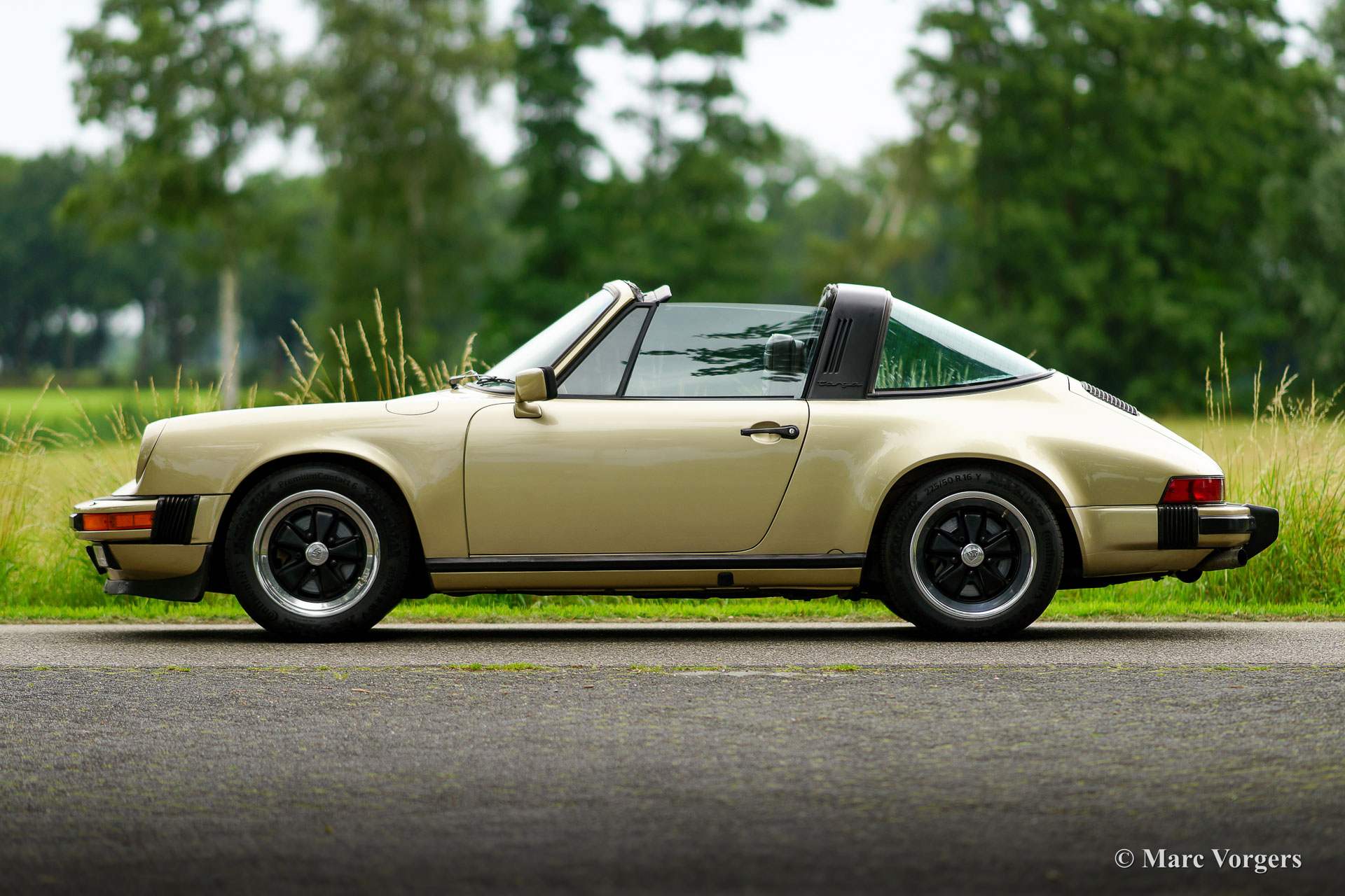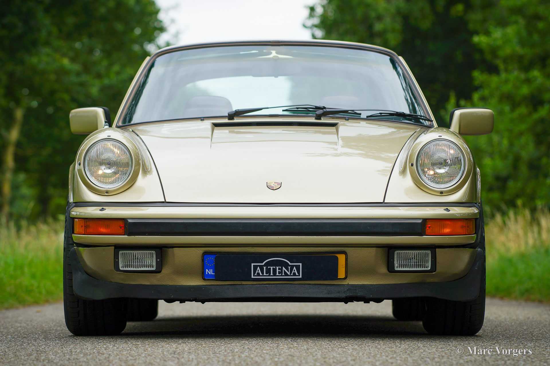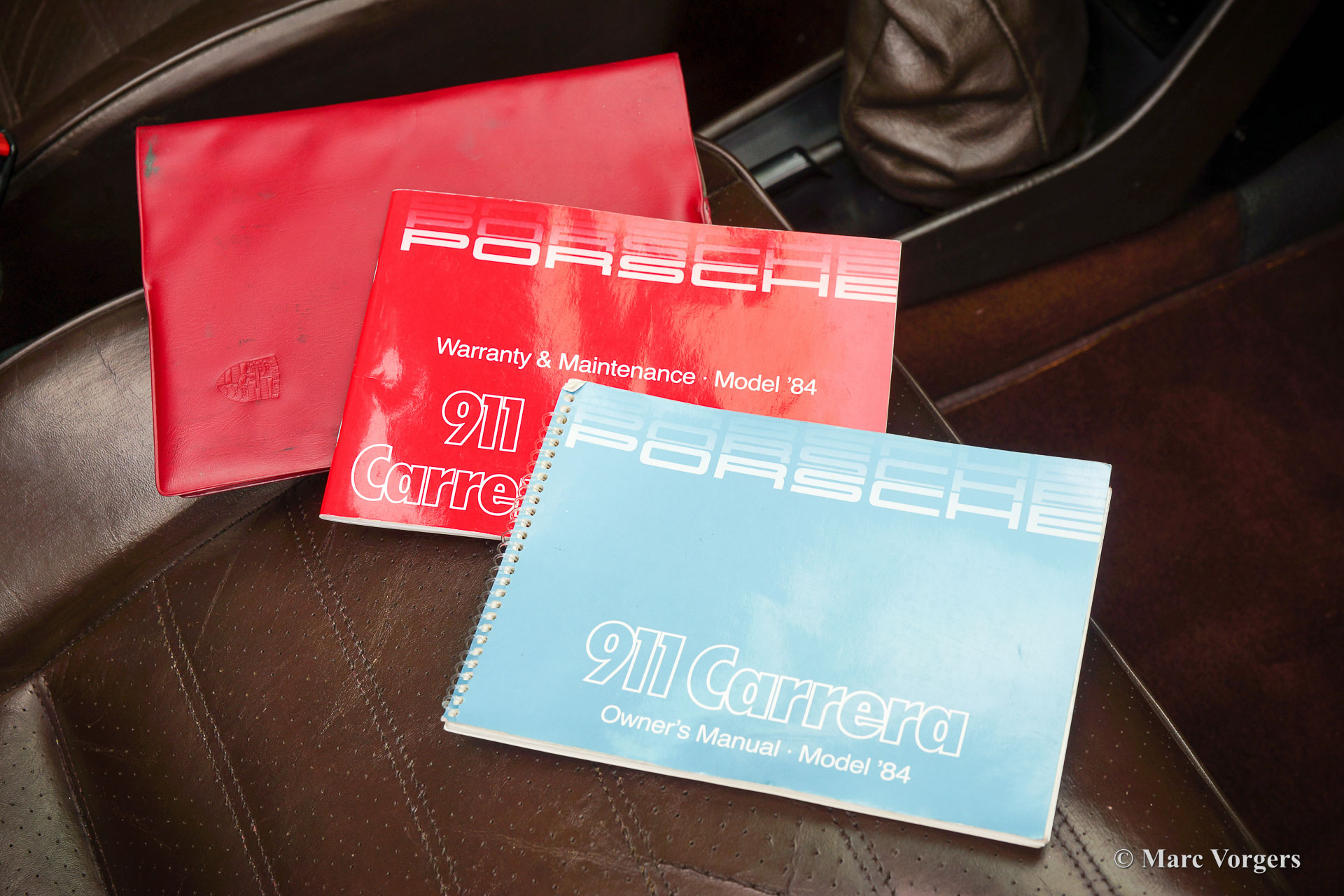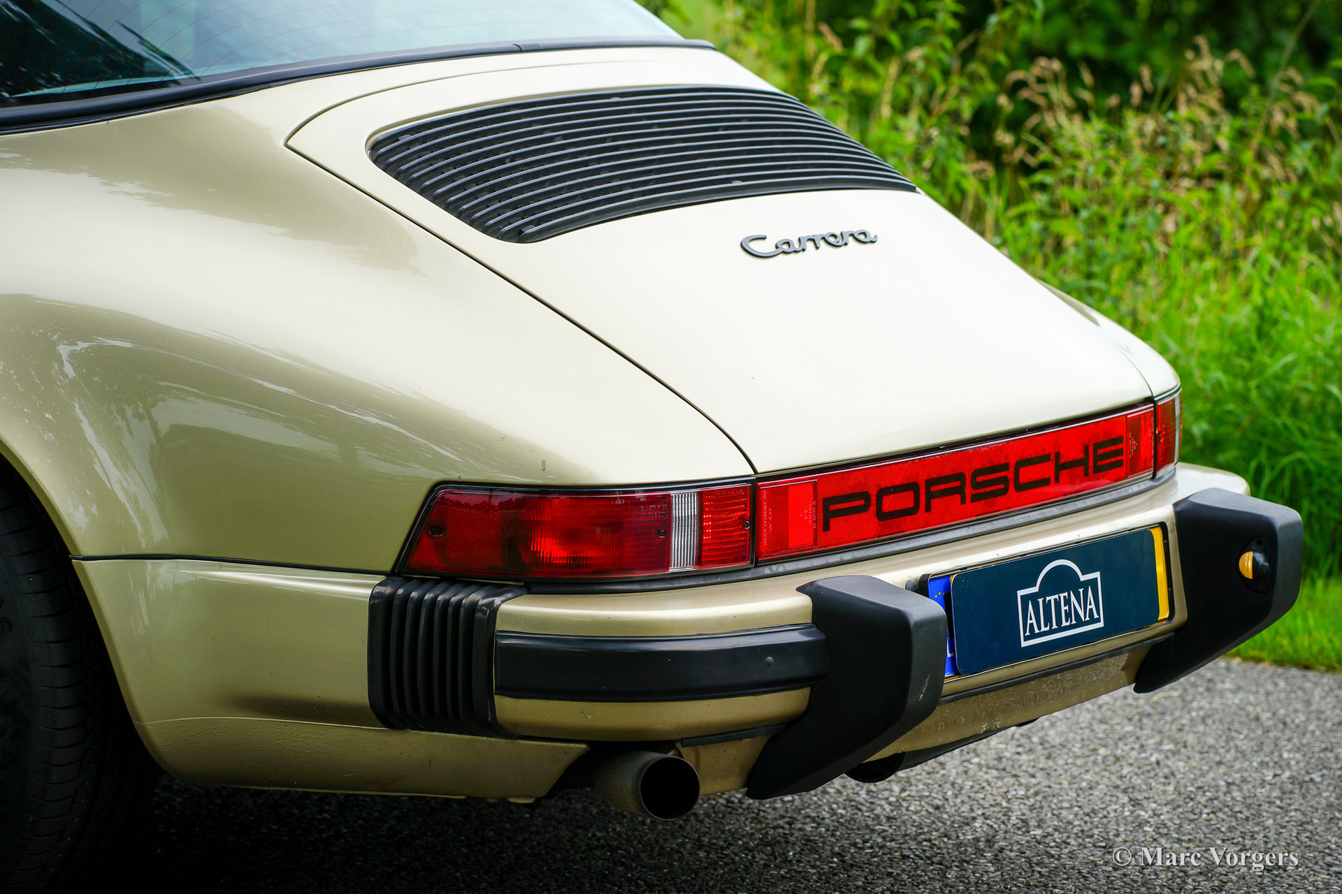Porsche 911 Targa 3.2 Carrera, année 1983. Couleur « Bright Bronze » métallisé (code couleur 966) combiné avec un intérieur en cuir marron et un tapis marron. Cette fantastique Porsche 911 de la série G a été vendue neuve en Géorgie aux États-Unis. La voiture fut récemment importée des États-Unis et adaptée à la législation de l'UE en installant des lampes de spécifications européennes et une lecture du compteur kilométrique. La voiture est désormais immatriculée aux Pays-Bas. Cette magnifique Porsche 911 Targa est dans un super état d'origine et en bon état, une véritable capsule temporelle ! La voiture montre tous les détails d'origine, et tous les autocollants d'usine d'origine sont toujours présentes. Cette 911 super originale montre quelques signes d'utilisation et d'âge, la voiture roule très bien et le moteur tourne parfaitement. La voiture est entièrement documentée et est livrée avec les manuels d'utilisation d'origine. Cette Porsche 911 Carrera 3.2 est équipée de superbes jantes Fuchs en alliage de 16 pouces avec des pneus Continental 205/55-16 à l'avant et des pneus 225/55/16 à l'arrière. La roue de secours d'origine et les outils sont présents. Il s'agit d'une Porsche pour les passionnés qui recherchent une 911 Targa en bon état d'origine, jamais restaurée !