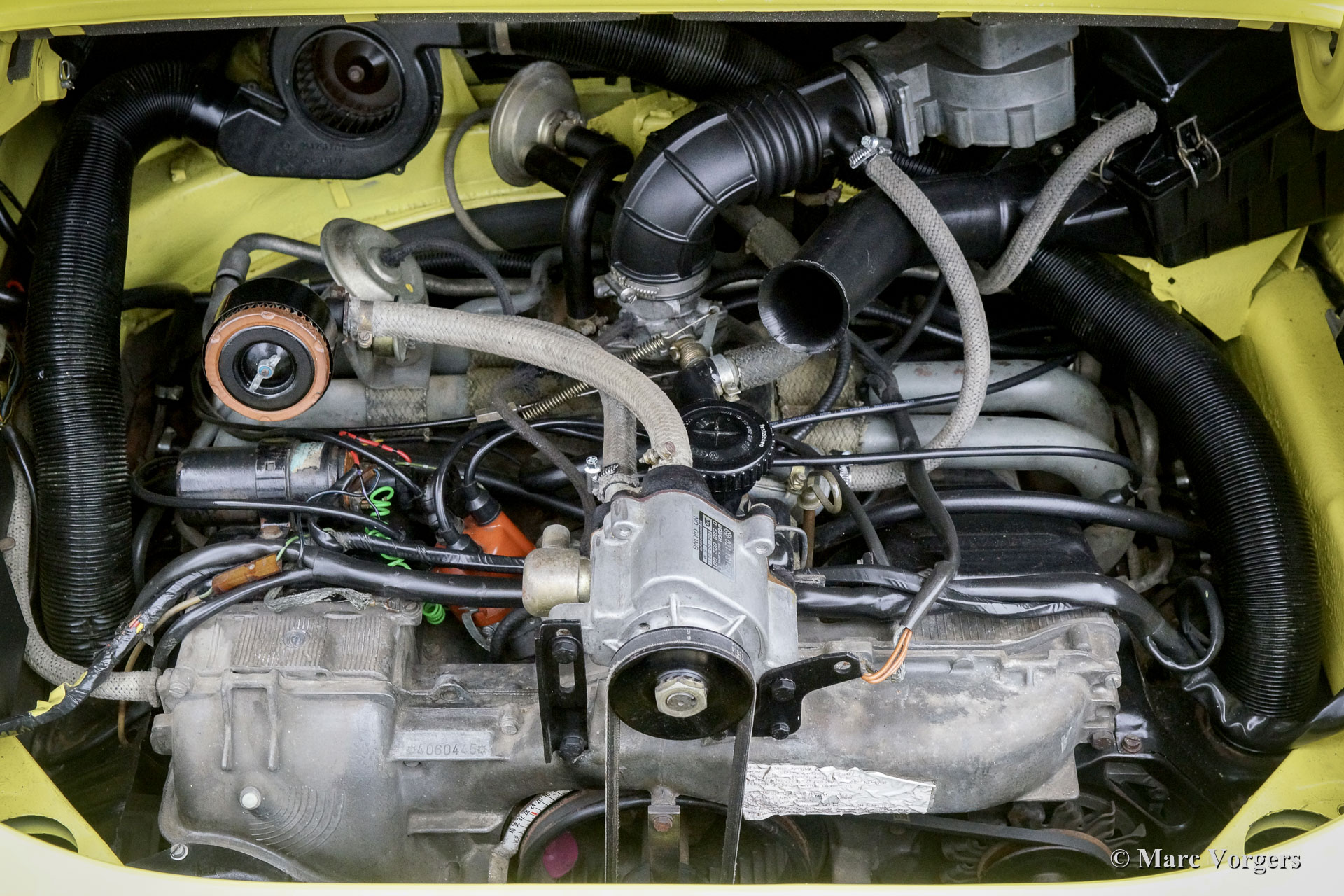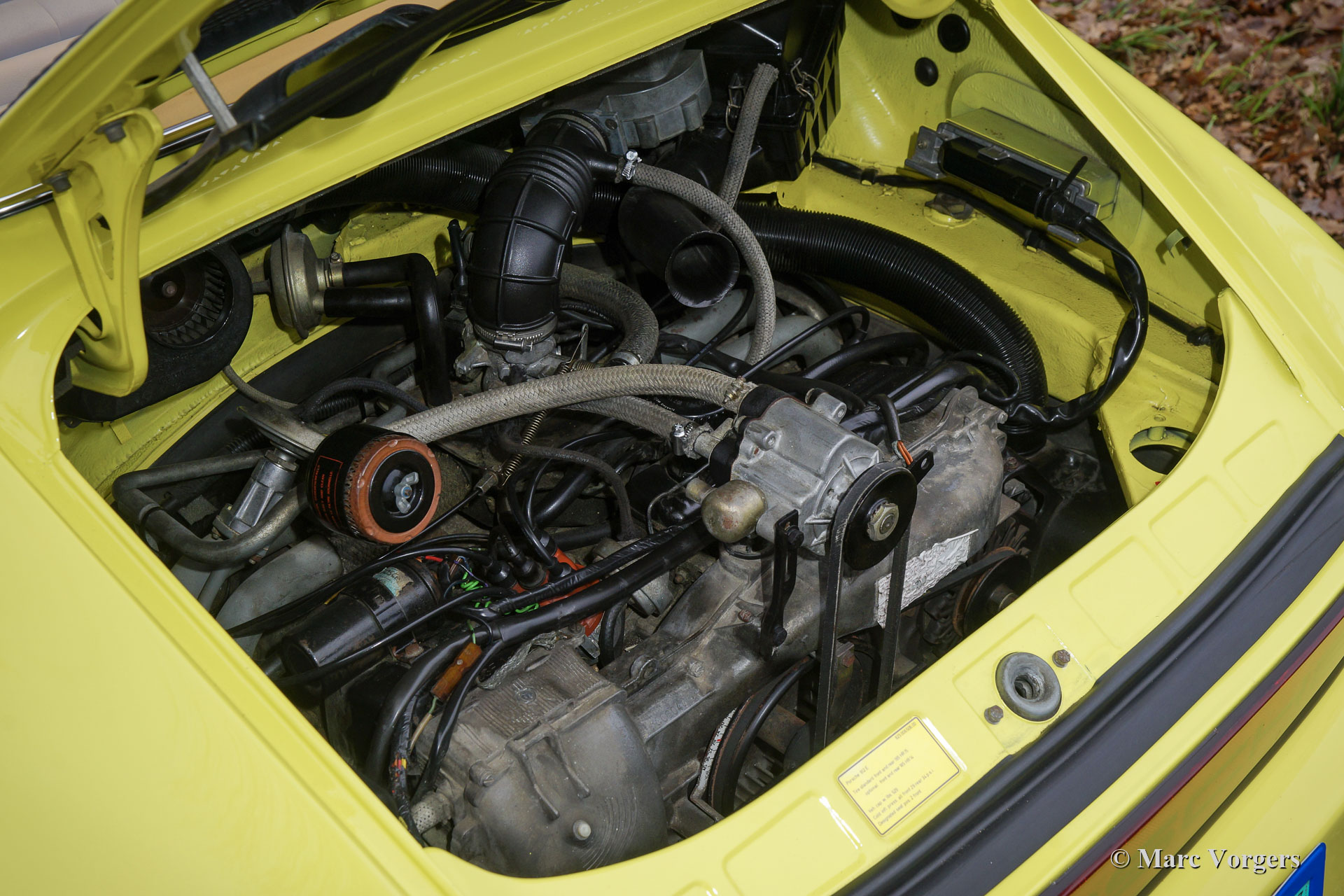 The Porsche 911 was designed with a steel unitary bodywork construction in which the engine was located behind the rear axle. The 911 engine is a air-cooled six cylinder "boxer" engine. The suspension of the Porsche 911 was independent from the start as was a five speed gearbox with floor shift.